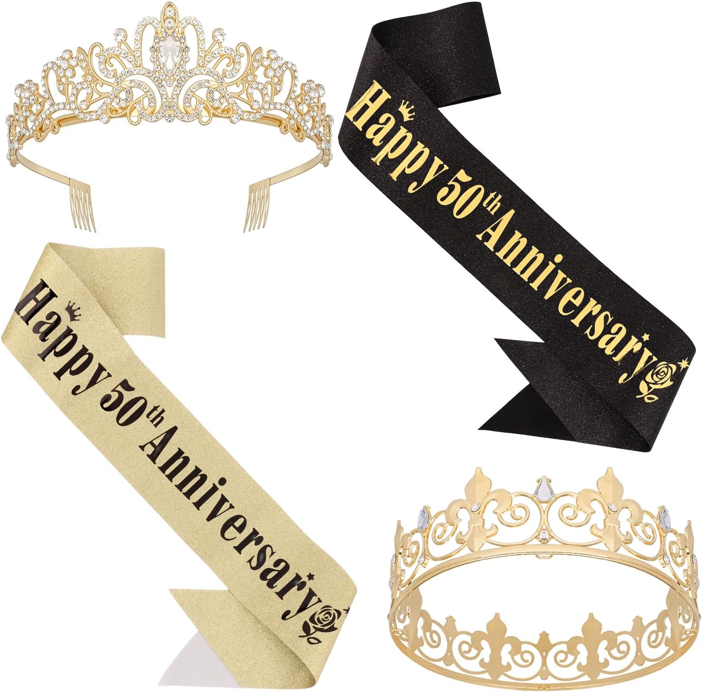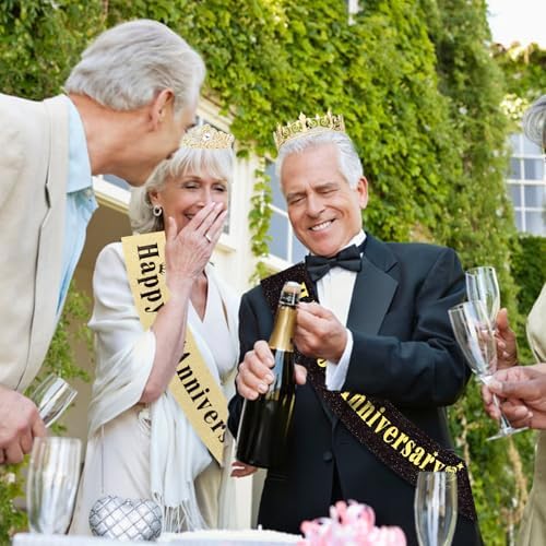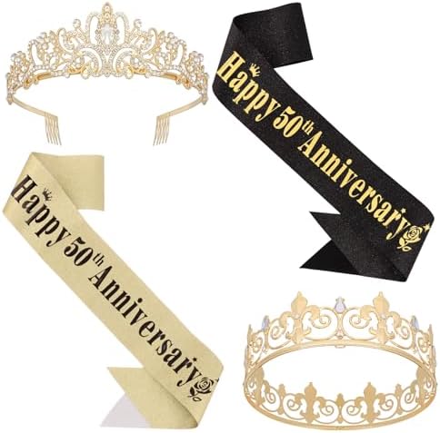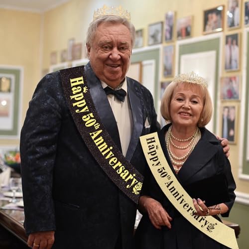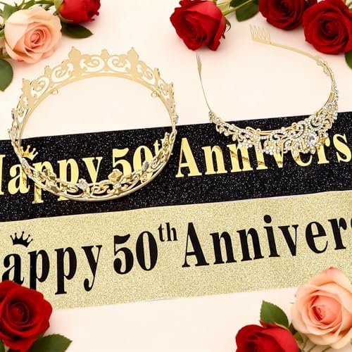 50th Anniversary Decorations Gold Crown and Glitter Sash Set 50th Wedding Anniversary Decorations Gifts for Couple Happy Anniversary Party Supplies for Couple