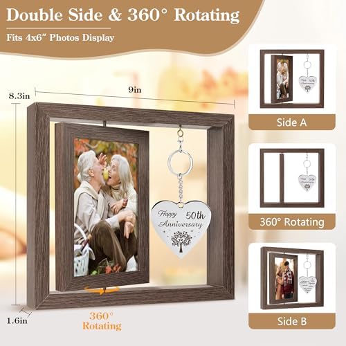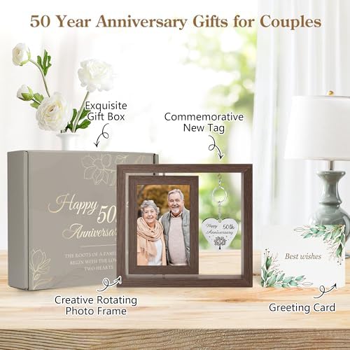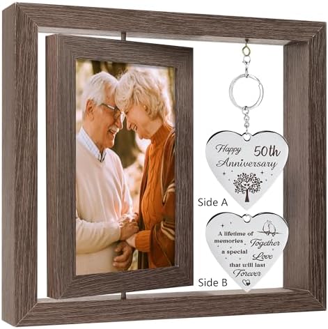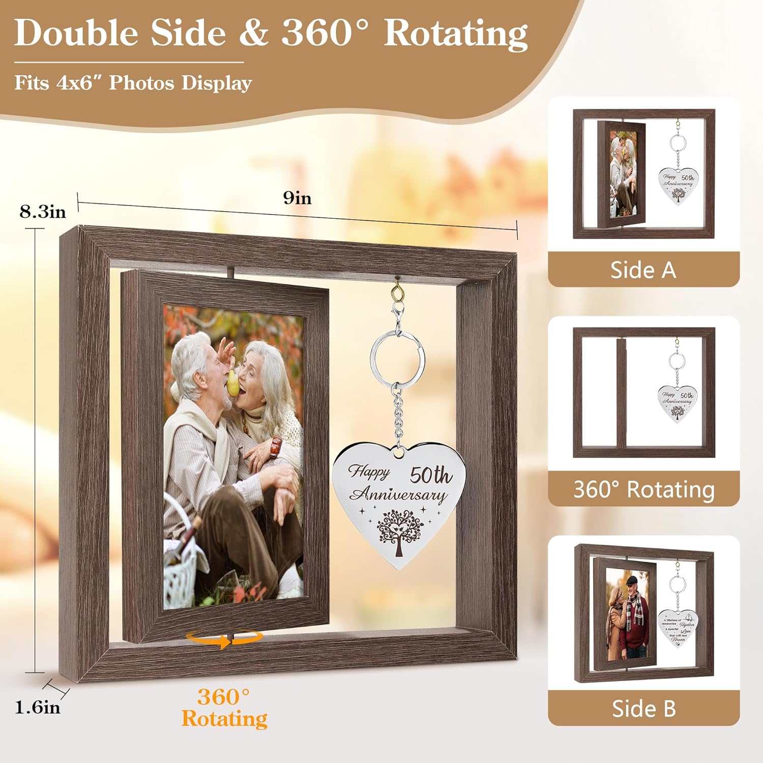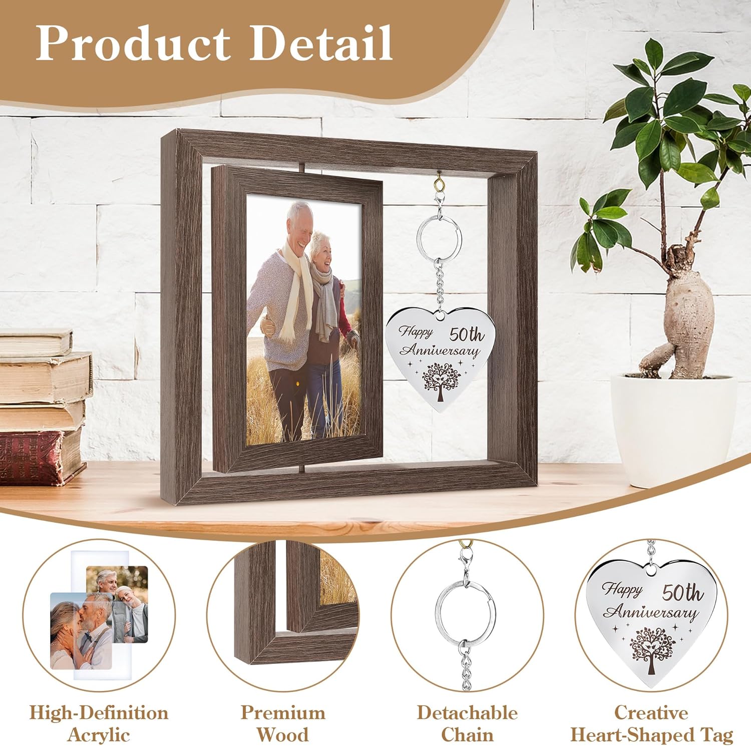 - Happy 50th Anniversary Decorations:Every element is designed to honor their story.The solid wood frame, with its warm vintage grain and 360-degree rotation,allowing the couple to display two cherished photos.The two-sided heart pendant adds a layer of sentiment, while the included 50th anniversary card for couple provides the perfect space for tyour heartfelt message.It serves as the perfect 50th wedding anniversary decorations for a bookshelf, desk, or any cherished corner of the home.