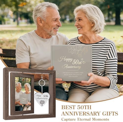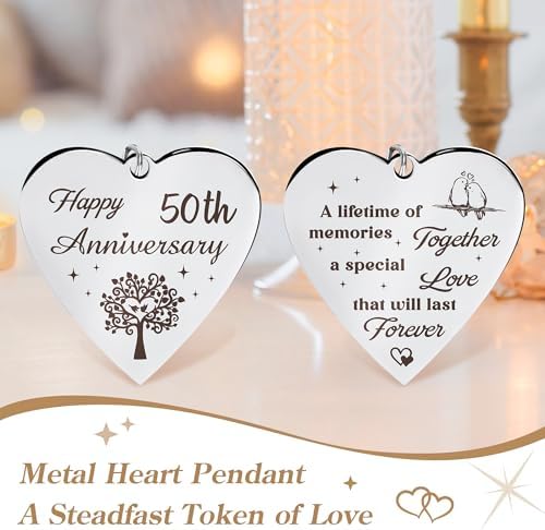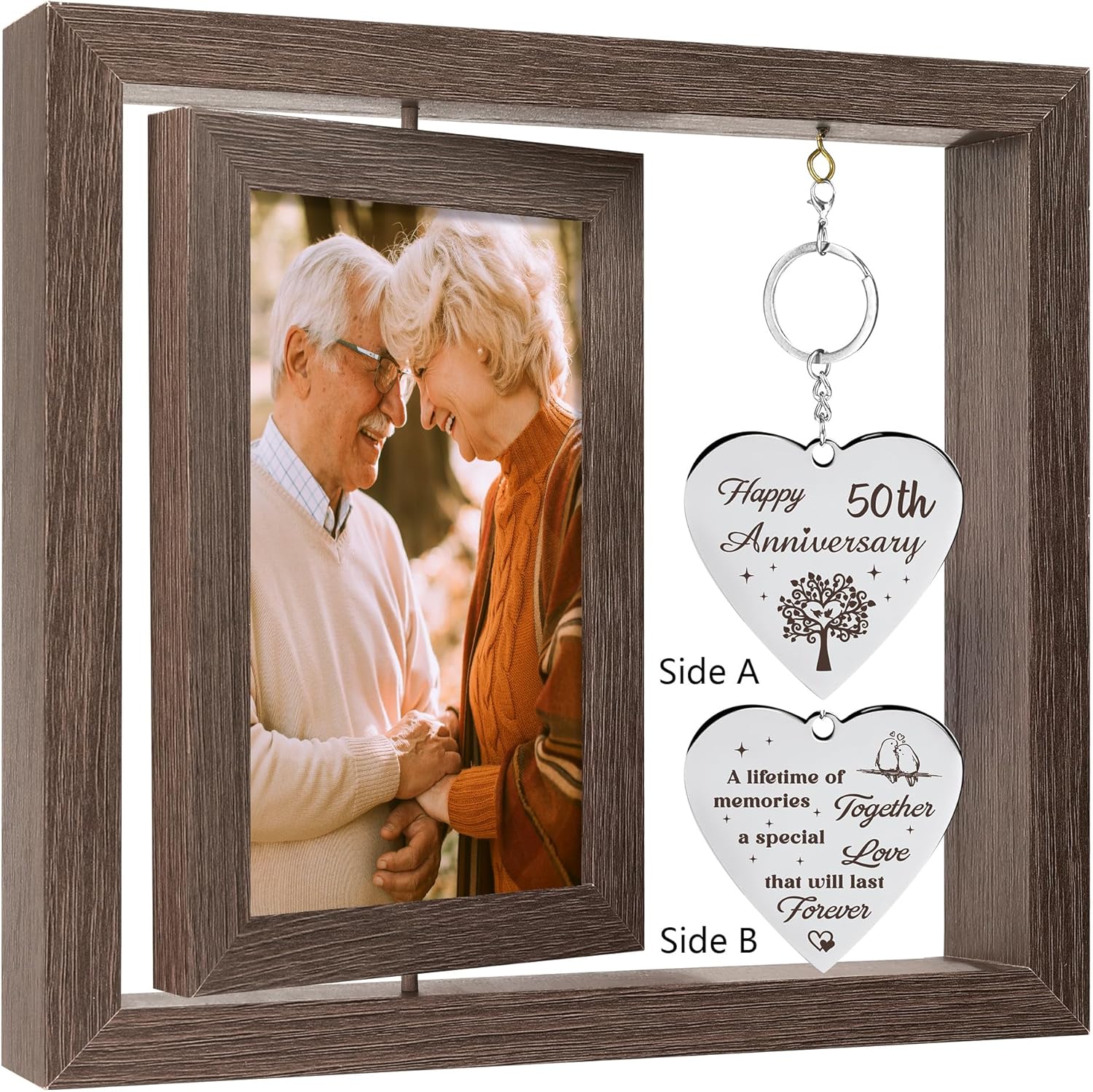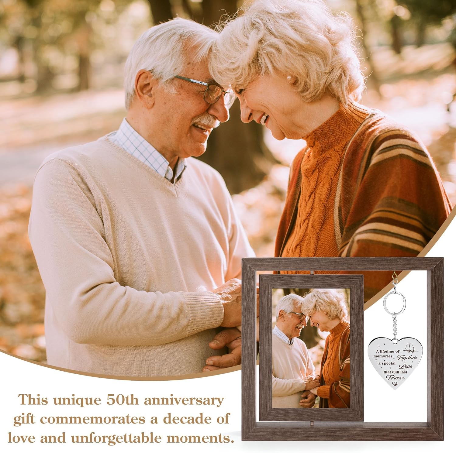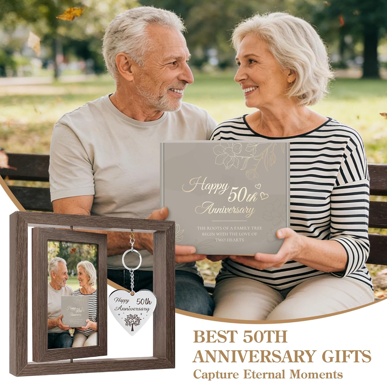 - This curated 50 year anniversary gifts for couple set includes 3 items to make the occasion special: 1* premium wooden picture frame adorned with a delicate stainless steel heart pendant, 1* blank 50th anniversary card for personal messages, all presented in 1* elegant keepsake box. Thoughtfully assembled, each element reflects the beauty of lasting commitment—a ready-to-gift tribute for the couple celebrating this golden milestone.