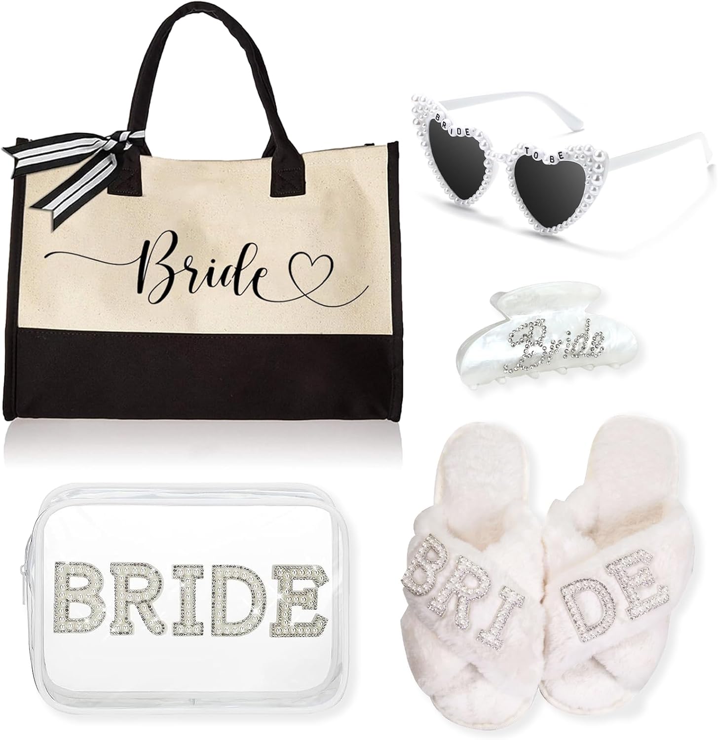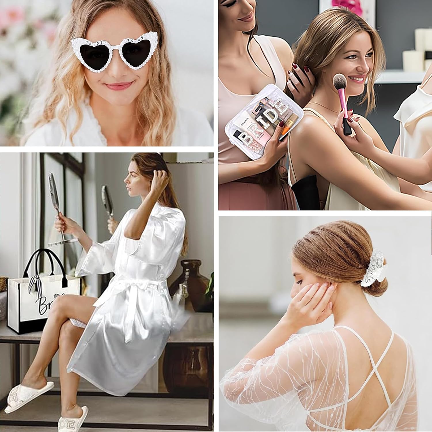 - 【Complete Bride To Be Gift Set】Our bridal shower gifts set for the bride include a stylish bride bag, a chic bride cosmetic bag, a trendy heart-shaped sunglasses, a cozy bride slippers, and a practical white bride claw clip, ensuring you have everything you need for your wedding days