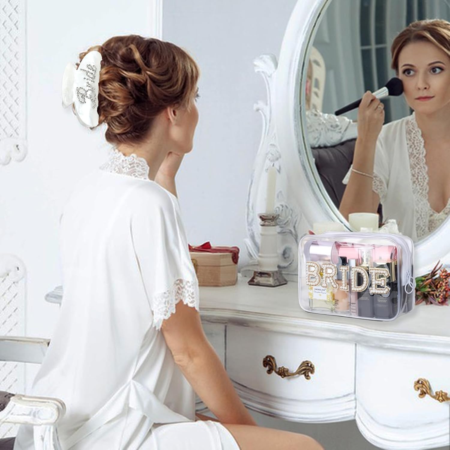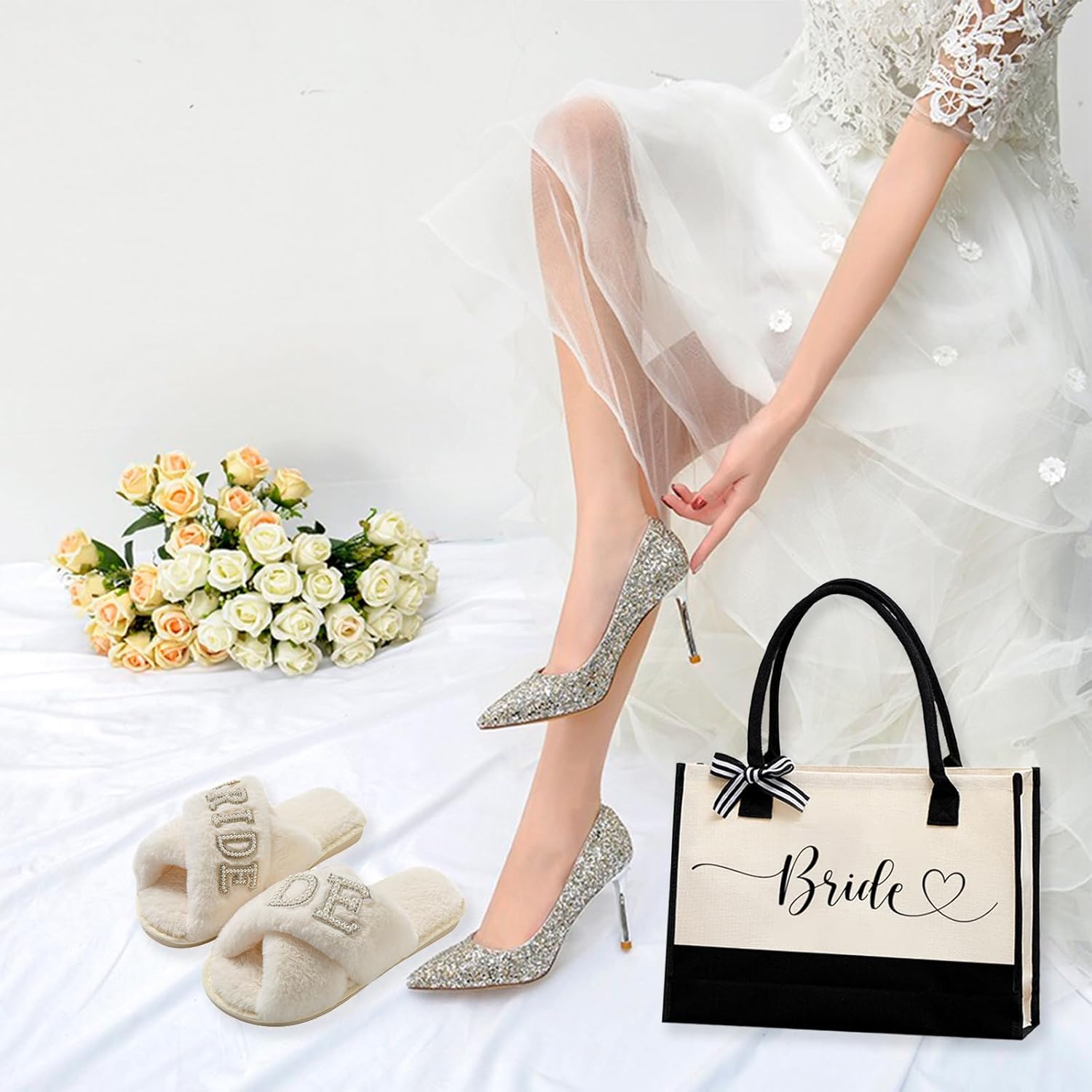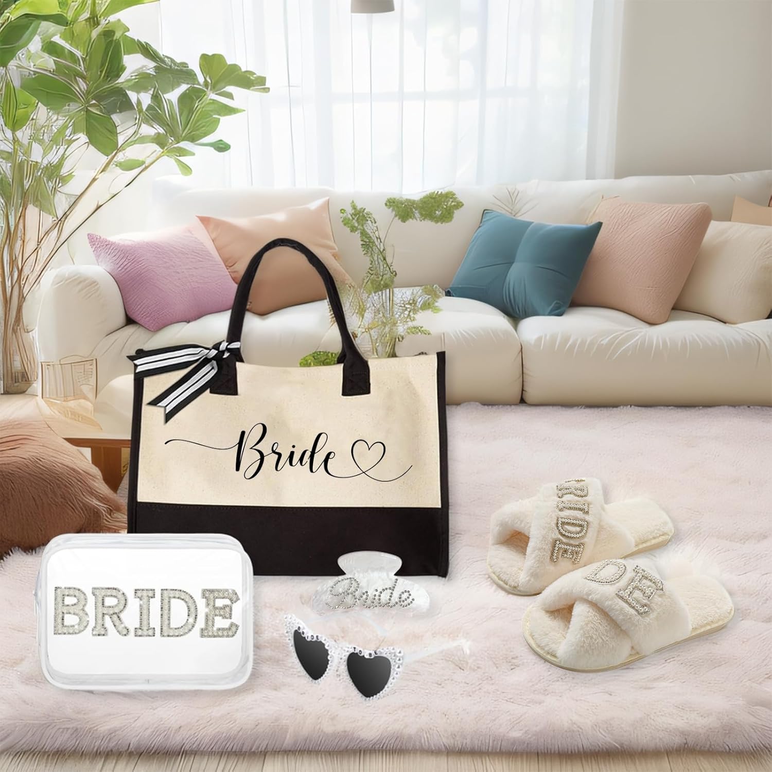 - 【High Quality Materials】Each piece in our bride gift set is crafted from reliable materials. The bride bag is made of durable canvas, the cosmetic bag features sturdy PVC, the bride claw clip is designed from acetate, while the plush bride slippers provide unmatched comfort, making them perfect for the wedding day. Complete the look with our charming heart-shaped sunglasses made from sturdy plastic, without fading or deforming