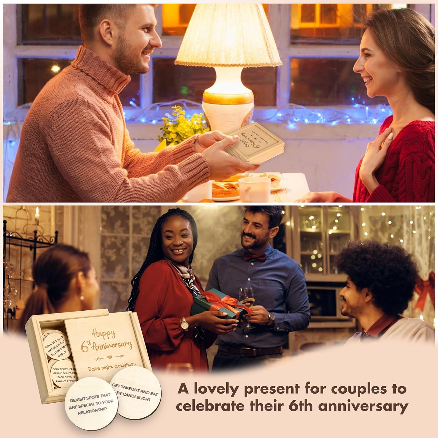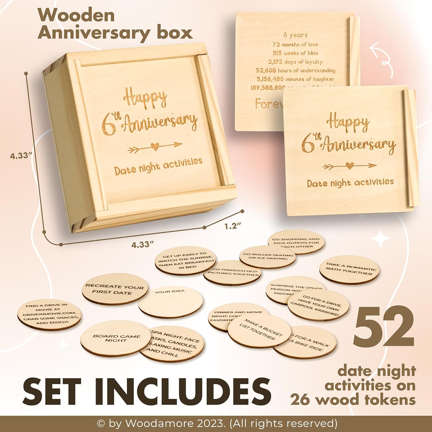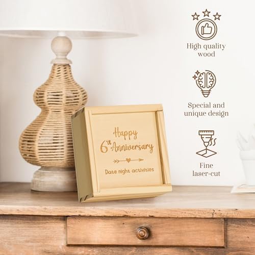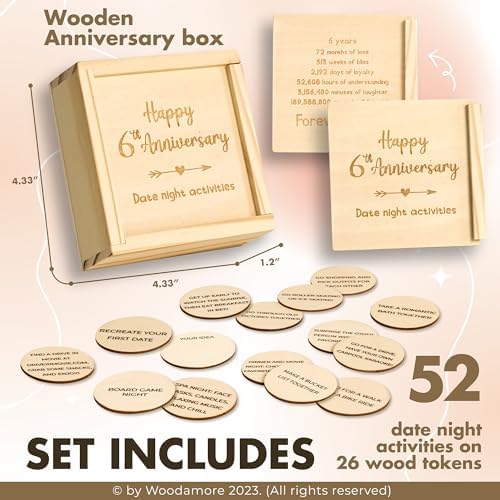 - 52 DATES: This box of wood gifts for him 6th anniversary is 4.33×4.33×1.2 inch, featuring 26 date tokens. There’re 52 cute and funny date ideas for every week of the year, making it the most special 6 anniversary gifts for her