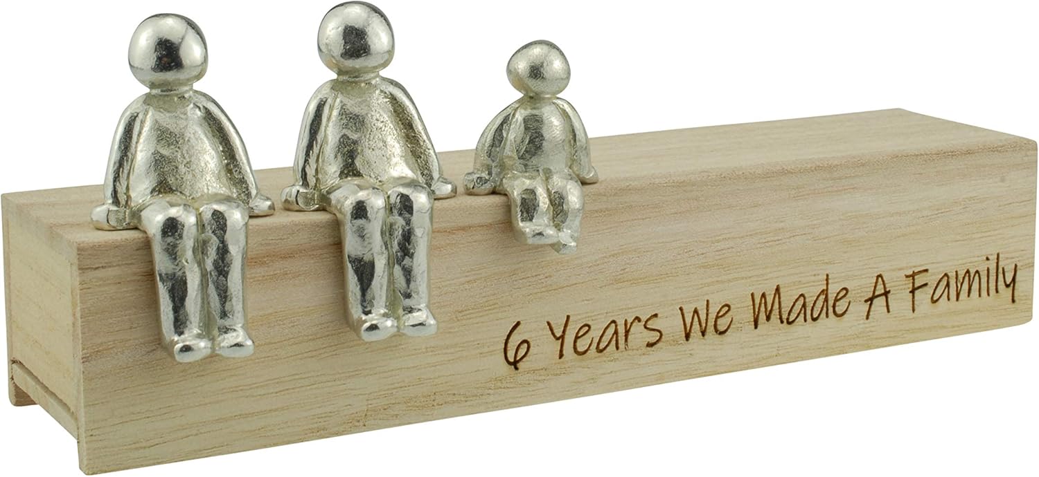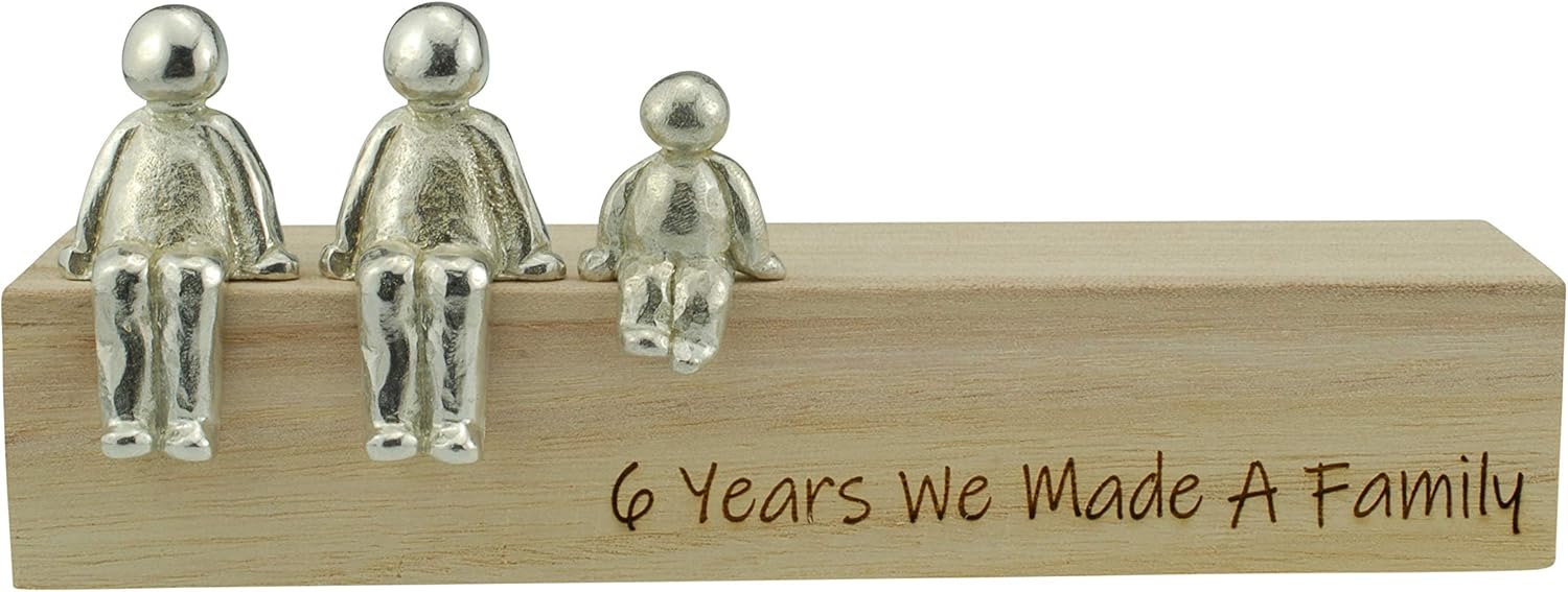 We are very excited to introduce our we made a family range for your 6th wedding anniversary gift idea to give for a couple or husband or wife. With solid metal characters to your own family combination these little people not only look cute but add a really great personal touch for your 6 year. After 6 year together you should be proud of the family you have made and you can display it here right in your living room. These cute little people are genderless so can represent any combination your like and are made from solid metal, for the 6th anniversary they are made from solid metal. Not only do they look great but flip the wooden packaging box over and it doubles as a great little shelf for your family to sit on laser engraved for your 6 year anniversary.