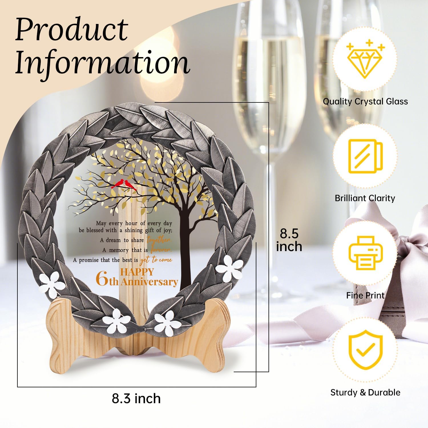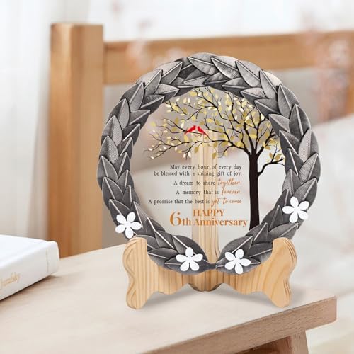 - Exquisite Craftsmanship – Meticulously crafted with attention to detail, our iron-colored metal wreath encases a crystal plaque. The crystal disc elegantly showcases a heartfelt message, symbolizing the strength and resilience built over 6 years together.