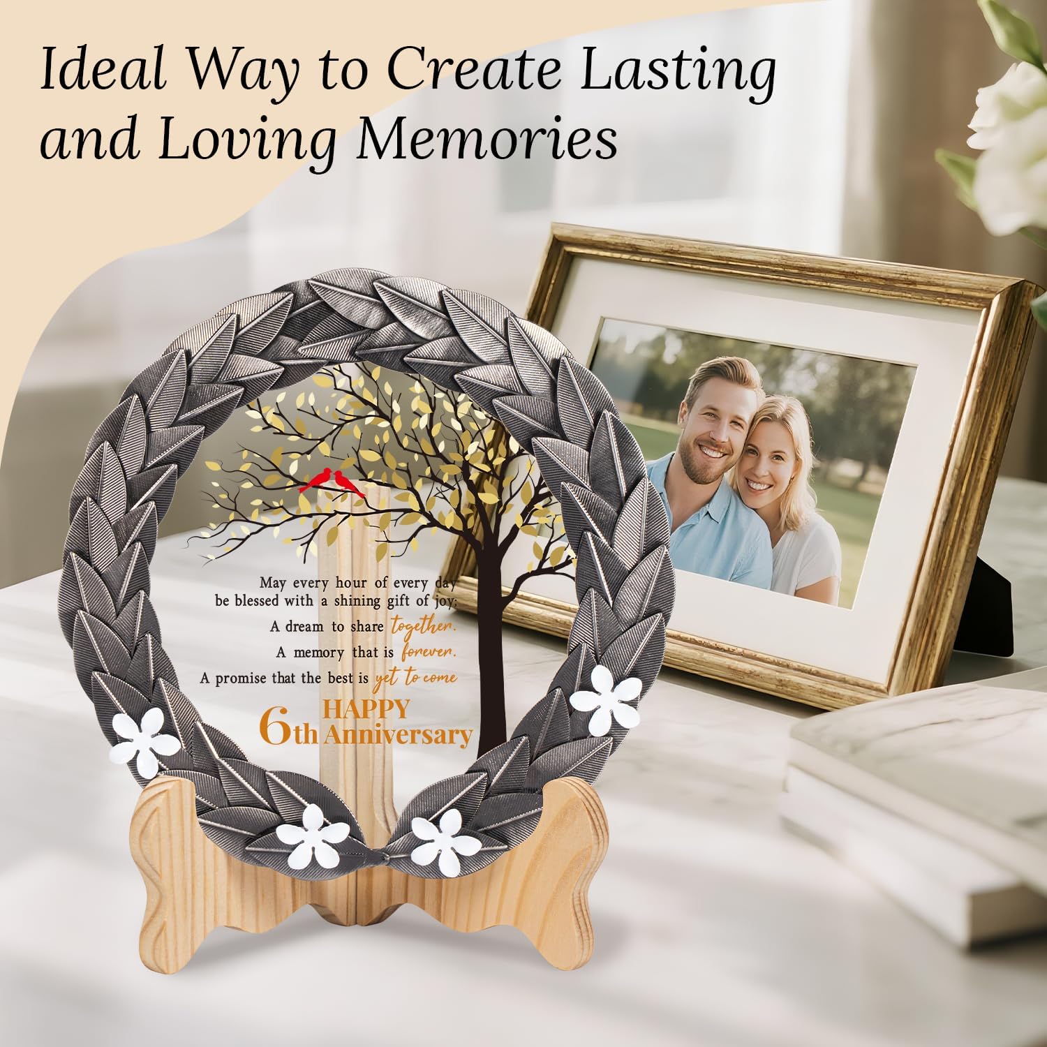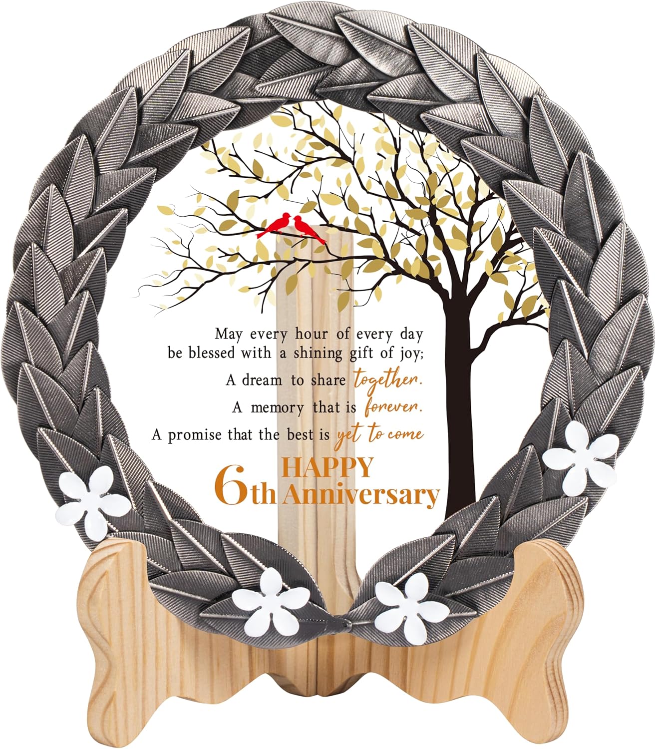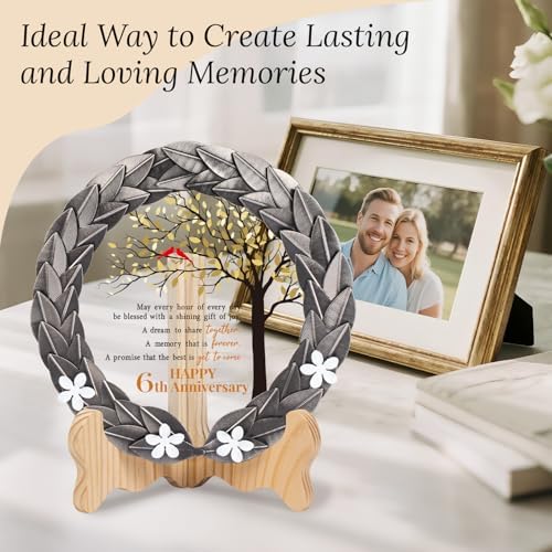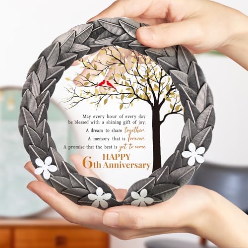 - Timeless Treasure – This timeless treasure, featuring an iron-inspired metal wreath and crystal plaque, is the perfect gift to honor a 6th wedding anniversary. Surprise your spouse or a beloved couple with this beautifully crafted keepsake.