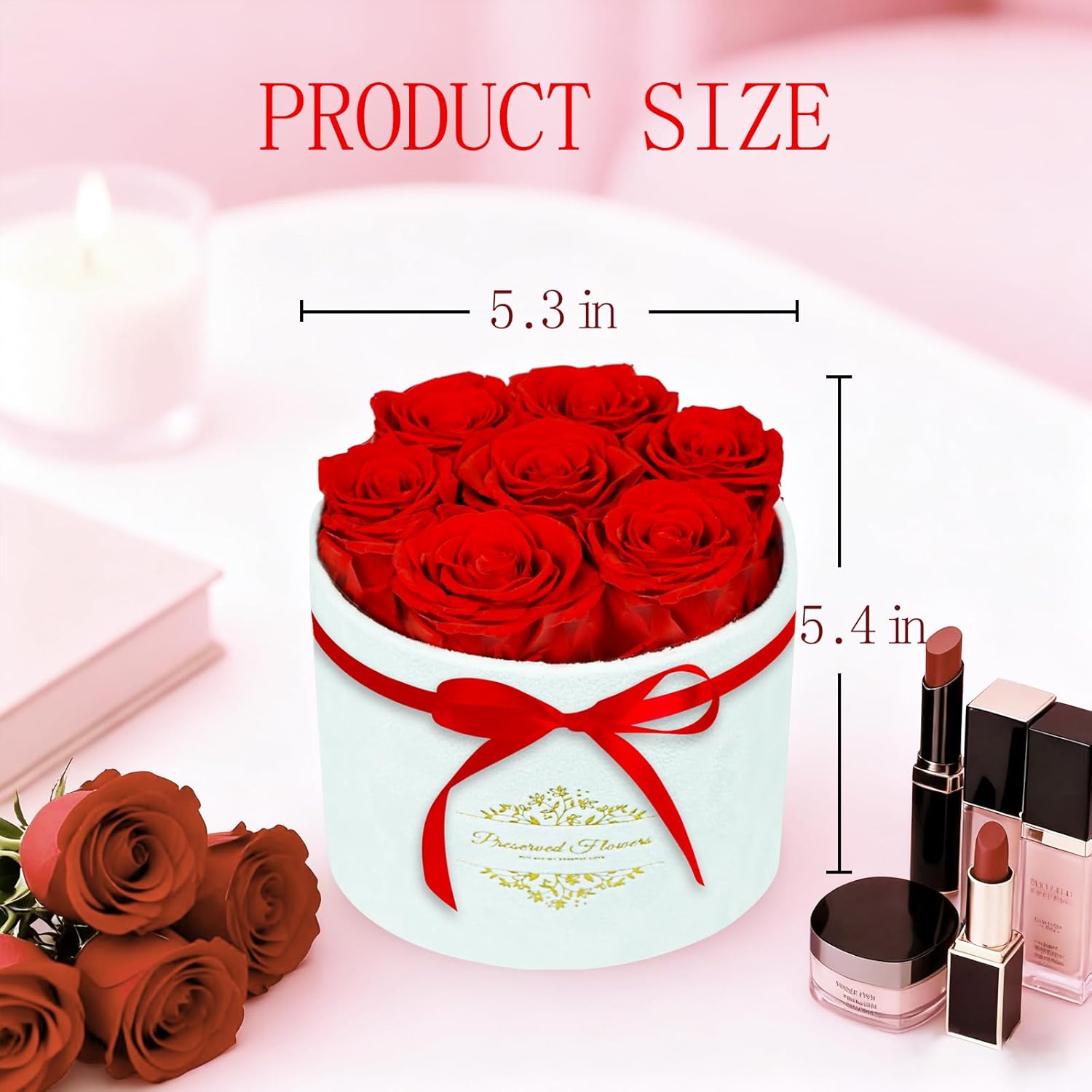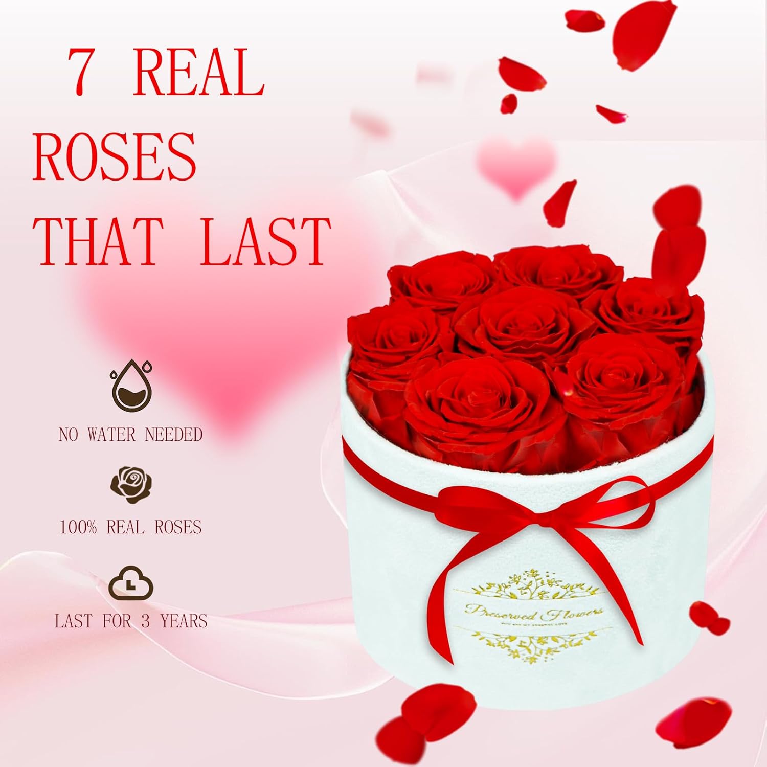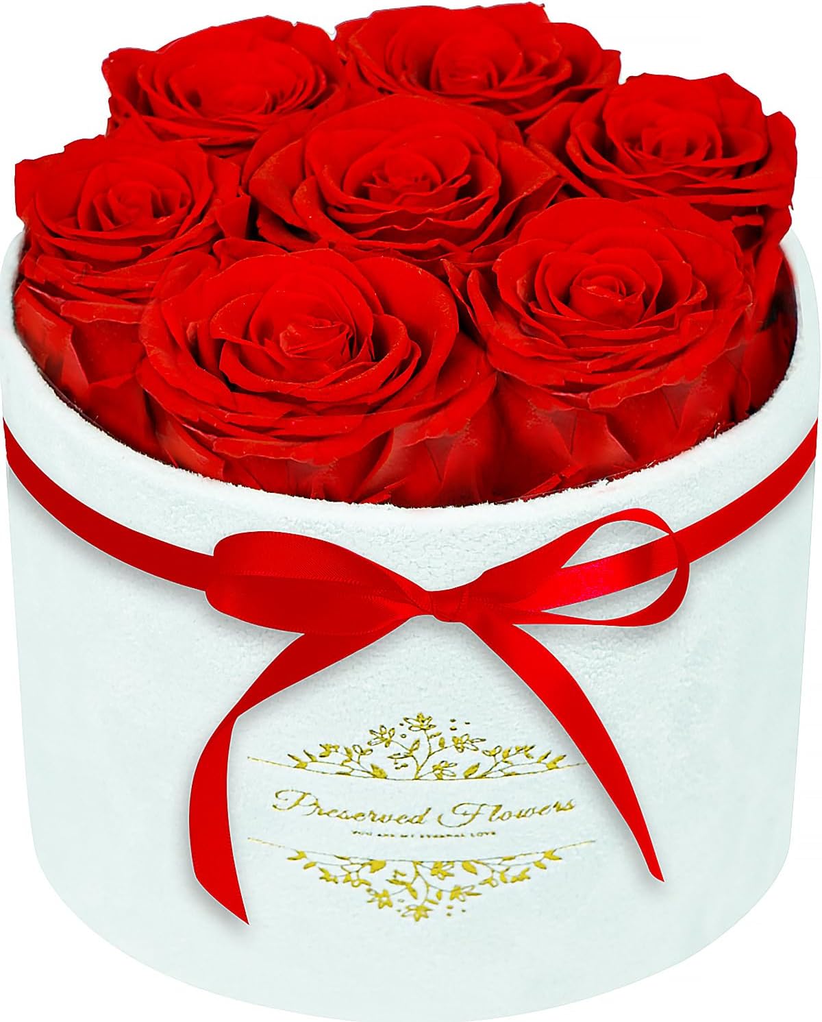 - Velvet Exquisite Gift Box: Each round preserved flowers gift box contains 7 selected roses (roses 2-2.5 inches in diameter) in a velvet luxury gift box, ready to give as a gift without additional packaging. In addition, a customizable greeting card is also included for you to write your most sincere wishes. This is a perfect birthday gifts for women and anniversary gifts for women.