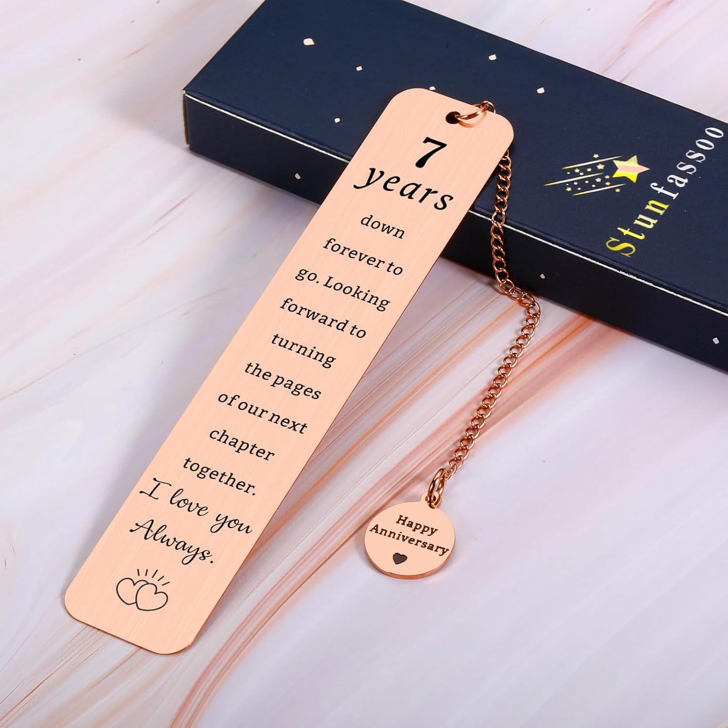 7 Years Down, Forever to Go. My Daring, I cant believe it has already been seven years of staying blissfully married. Thanks to you, I laugh a little harder every day and smile a whole lot more than I used to. I am so grateful to have you in my life. I know forever is a long time but I would love to spend each and every day with you. 7 Years & I Steel Love You! Best 7 Year Anniversary Gifts for her him to show your love! ABOUT Stunfassoo Stunfassoo is a sweet love story. In Fas, a beautiful city in Morocco, he came across Soo on a sunny hot afternoon by chance. She was sitting at the front of the cafe and enjoying coffee at ease.He was stunned by the lovely and charming girl. He just wanted to come forward and say hi to her, but he didnt.Fortunately,the story was not over. He met Soo the second day morning and he got up the courage to date her .Then they fell in love.To commemorate their encounter and love,he got her a special keychain gift. The best and the worst thing about love is that it cannot be expressed in words. When you truly love someone,it may be hard to express those emotions through words. Stunfassoo Keychain will make it easier to describe exactly how you are feeling with the most beautiful engraving And express your emotions and feelings of love to your boyfriend, girlfriend, friends, dad, mom, daughter, son, any special someone . Perfect gifts for Valentines Day, Birthday , Christmas, Father’s Day,any special occasions. WE FOCUS ON Simple but meaningful gift A perfect gift for special someone absolutely melts her/his heart! Inspirational bookmark gift A symbol of love, courage, positivism, optimism, encouragement.