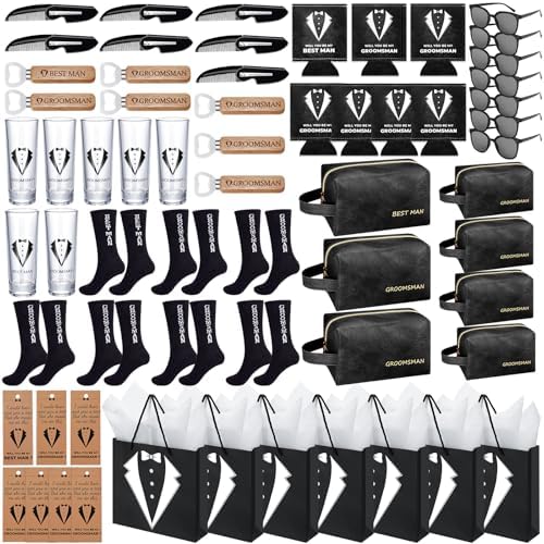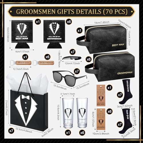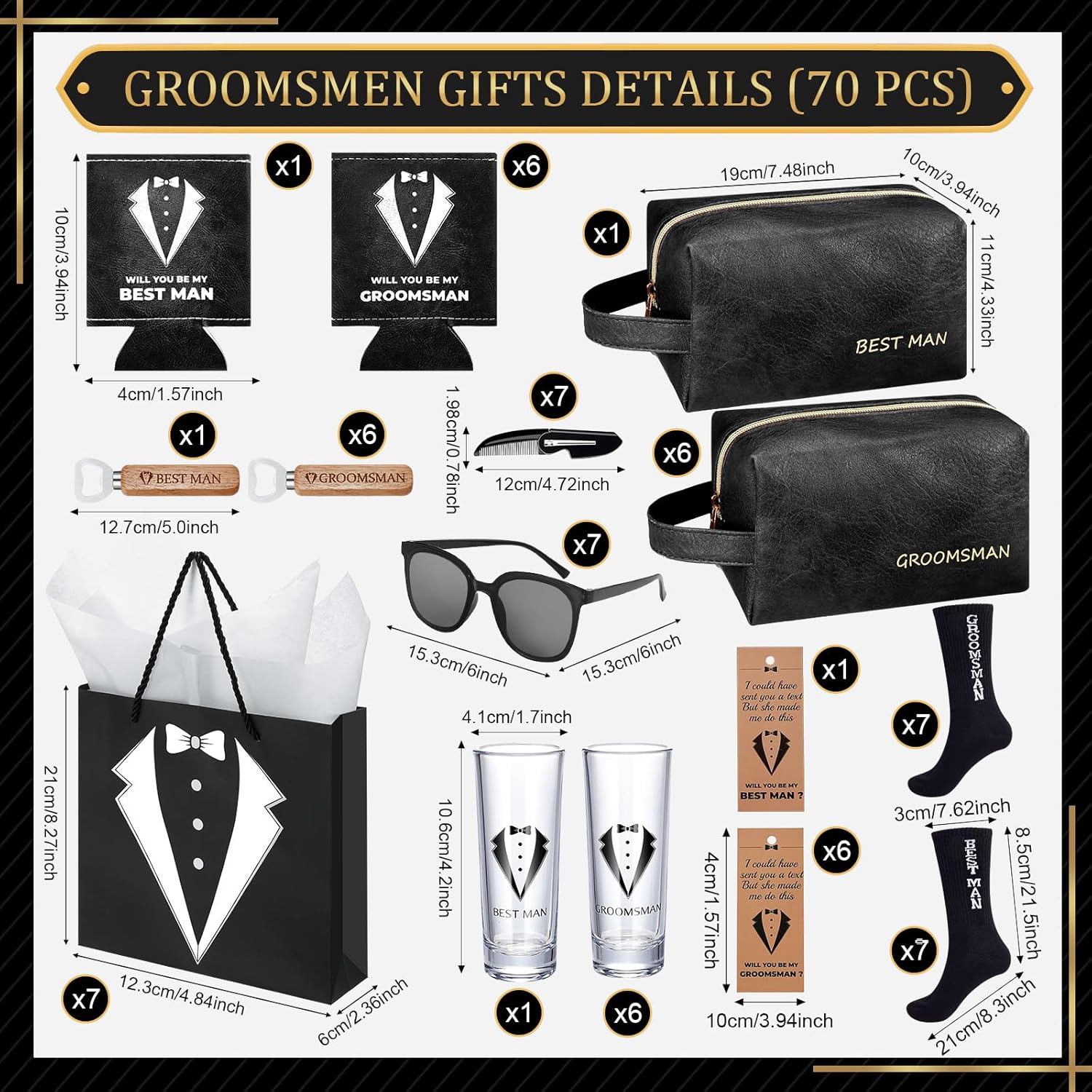 • Comprehensive Groomsmen Gift Set: 70Pcs Groomsmen Gifts Set of 7 includes 7Pcs Heavy Base Shot Glasses, 7Pcs Socks, 7Pcs Folding Combs, 7Pcs Can Cooler, 7Pcs Wooden Bottle Openers, 7Pcs Sunglasses, 7Pcs PU Leather Toiletry Bags, 7Pcs Gift Bags, 7Pcs White Tissue Paper, and 7Pcs Thoughtful Cards, Making it an ideal gift choice for your groomsmen on your special day