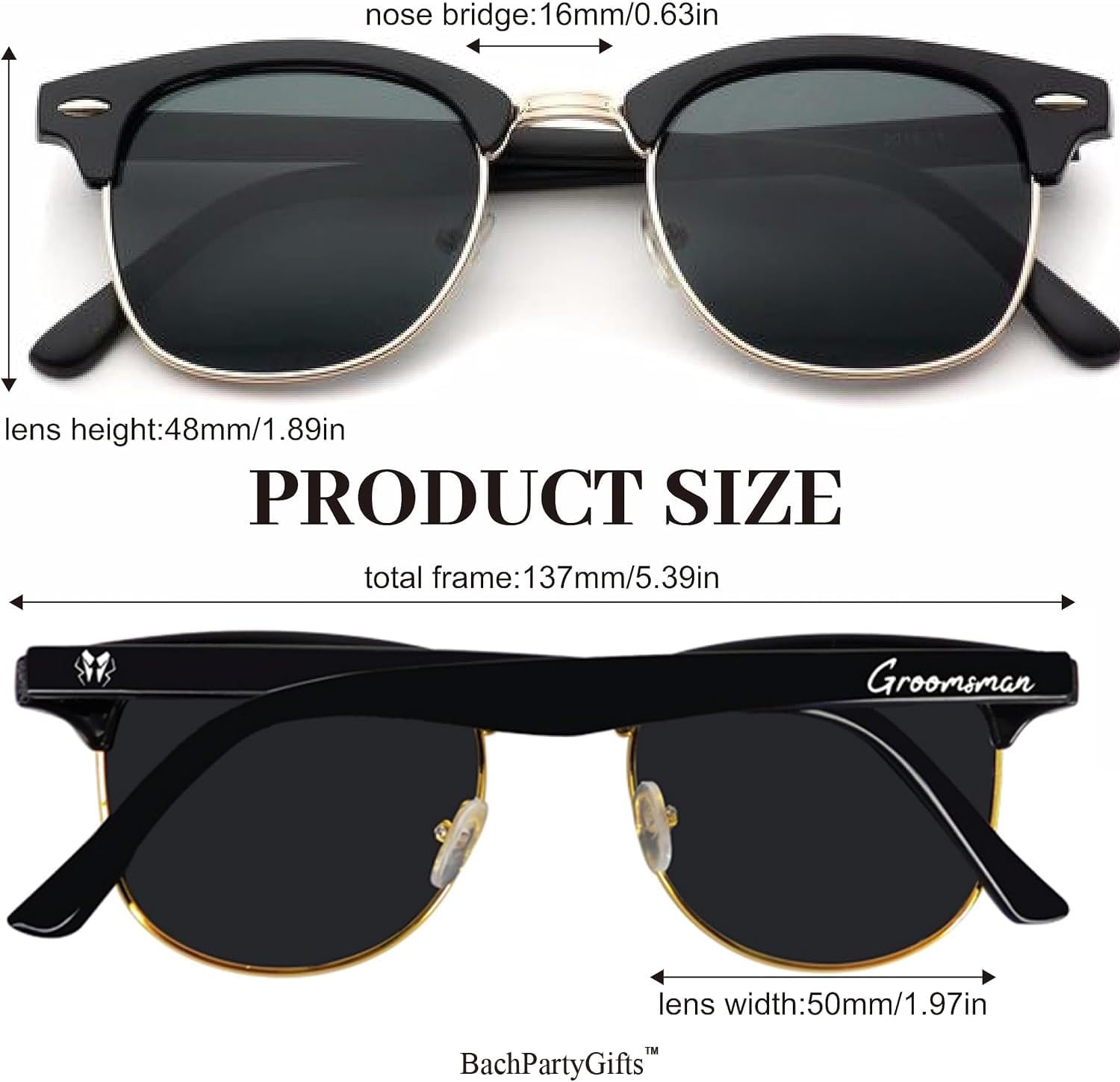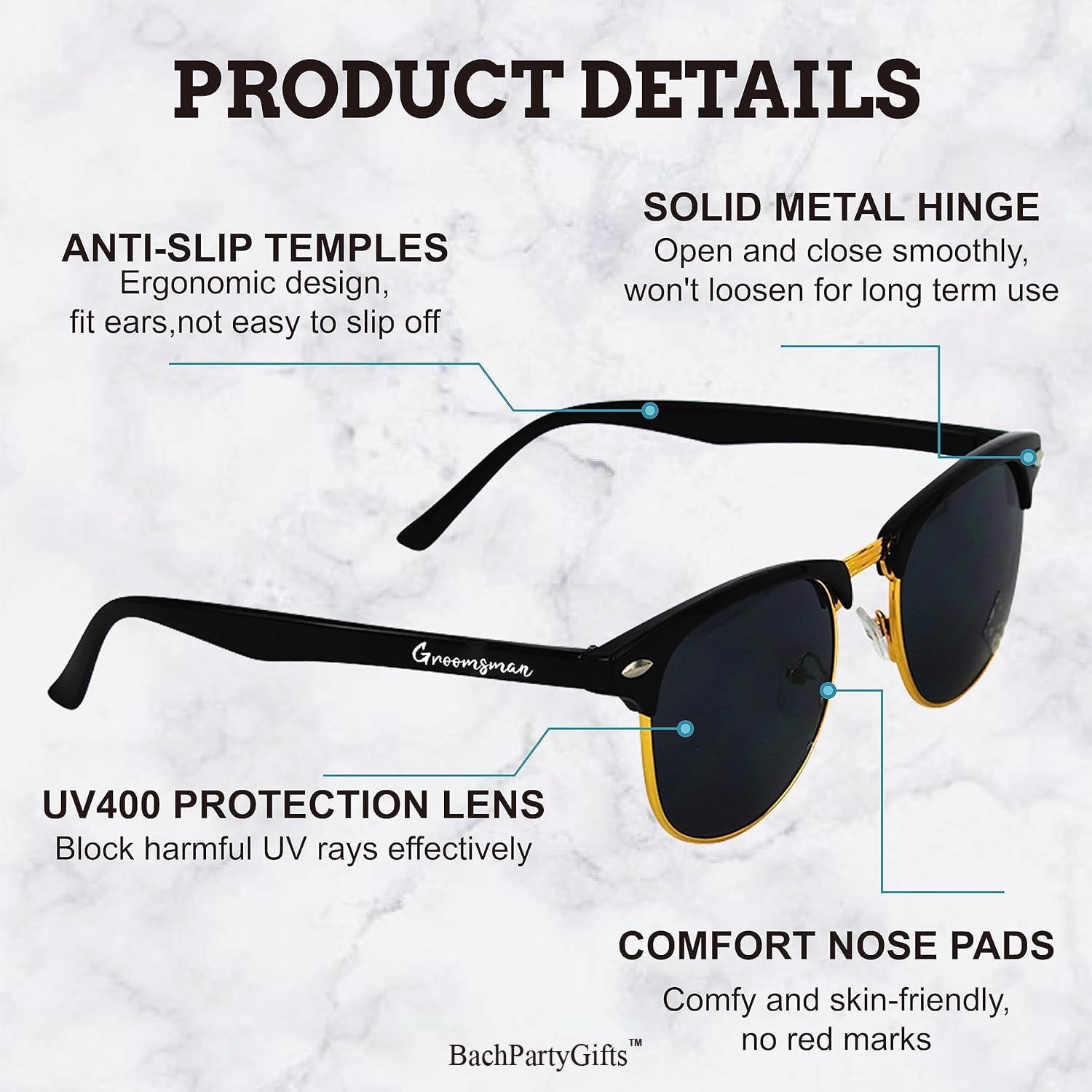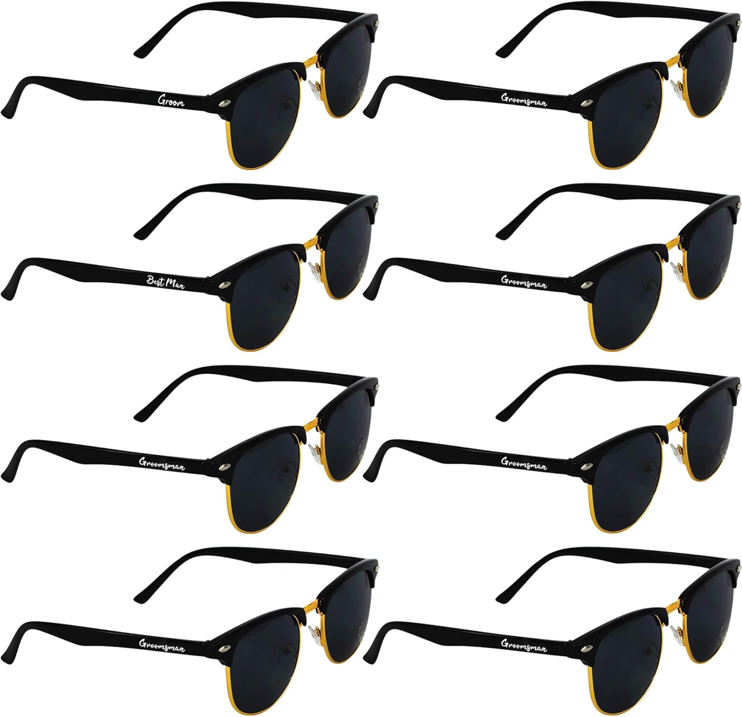 • GROOMSMEN SUNGLASSES: The Bachelor Party Sunglasses Sets Includes 1x Groom Sunglasses, 1x Best man Sunglasses, and 6x Groomsman sunglasses. Ensures a unified, photogenic look for weddings & bachelor parties.