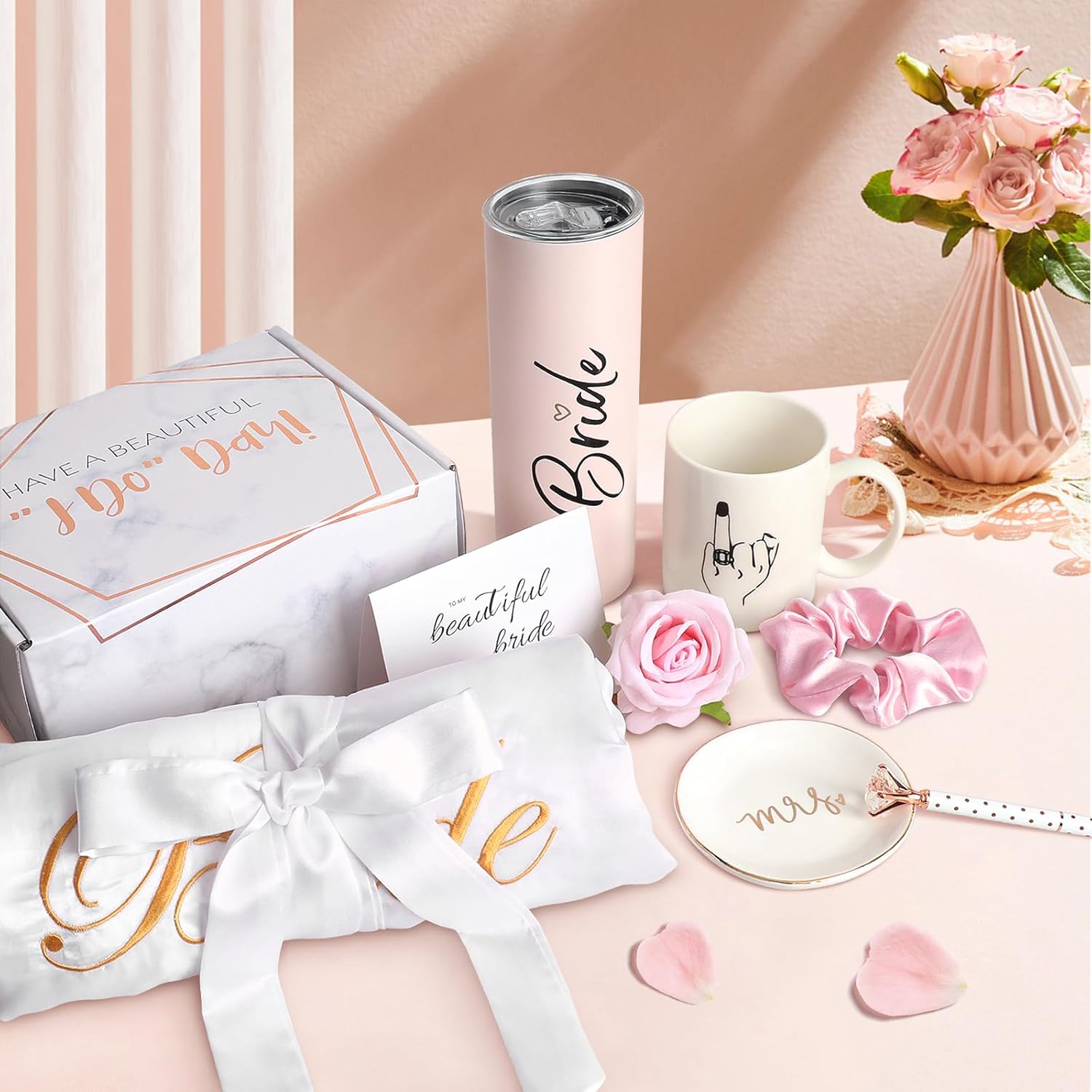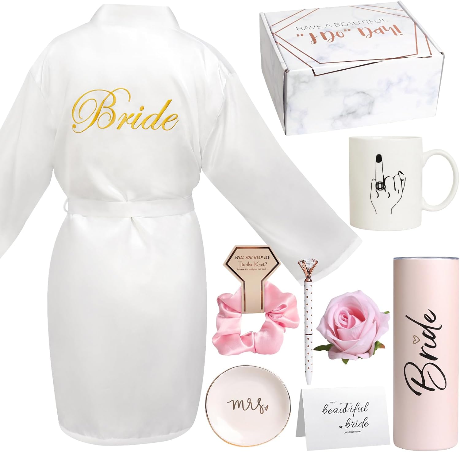 • Bridal Silk Robes Gift Set: The gifts set includes : (1) Bridal Silk Robes (2) 20oz Tumbler Cup (3) Bridal Mug (4) Jewelry Tray (5) Diamond Pen (6) Hair Ring (7) Decorative Rose (8) Greeting Card. All packaged in a box and delivered to her door