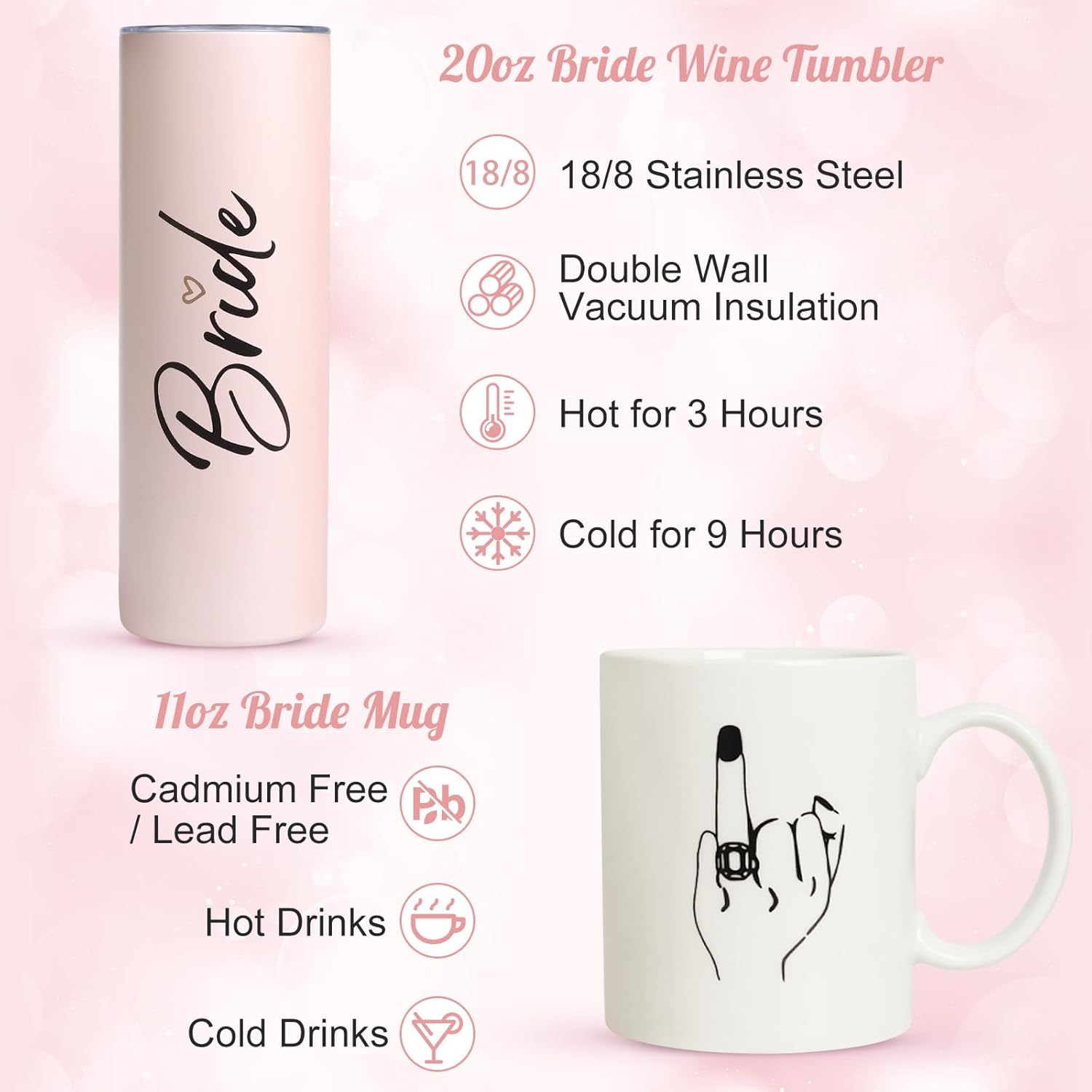 • 20oz Bridal Tumbler Cup: This wine tumbler cup is well design with “Bride” printing. The tumbler cups feature double vacuum insulation and a BPA-free shatterproof lid, making our insulated wine glasses rust-proof and ideal for keeping drinks hot or cold. This gifts for bride is often taken to pool, beach, picnic, party and family activity