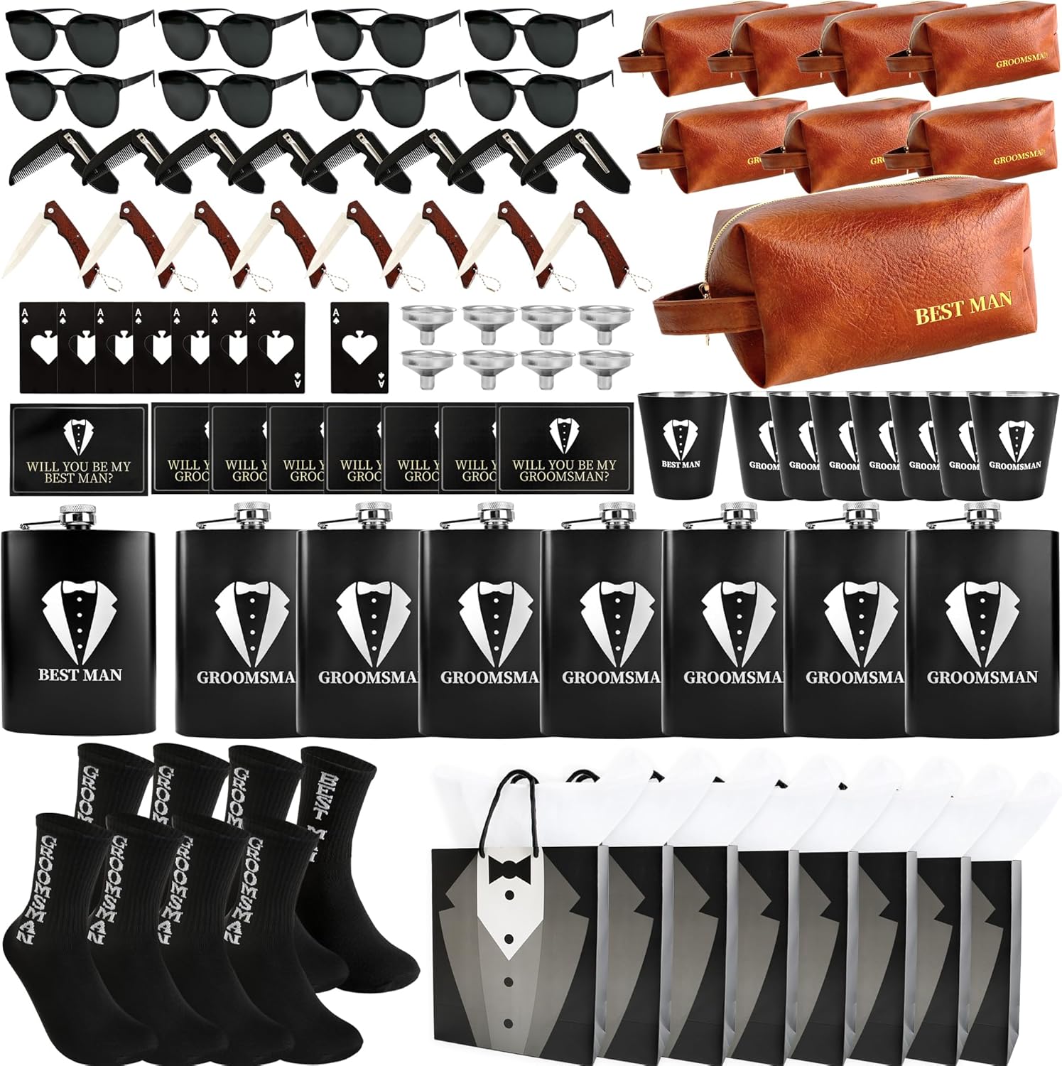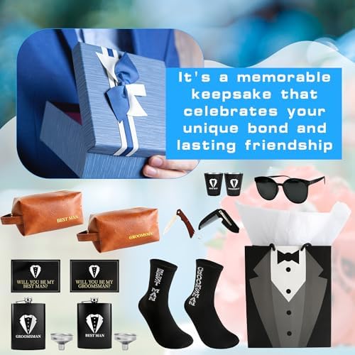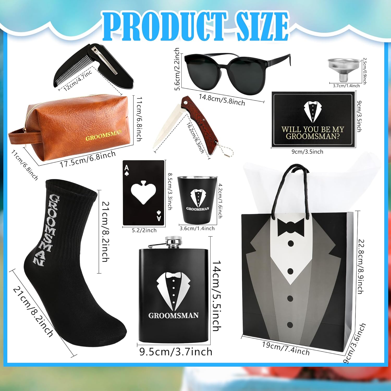 - ✅What You Can Get: this fancy gifts for groomsmen contains 8 flask, 8 wine glasses, 8 funnels, 8 brown storage bags, 8 cards, 8 plastic combs, 8 folding knives, 8 sunglasses, 8 card bottle openers, 8 handbags, 8 sheets of Sydney paper, and 8 pairs of socks. This quantity is not only suitable for giving to groomsmen or friends, but also sufficient for daily use at home