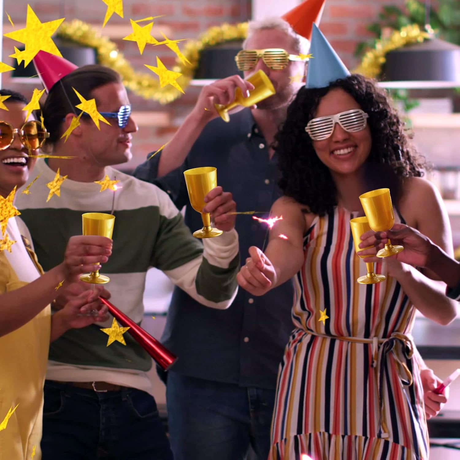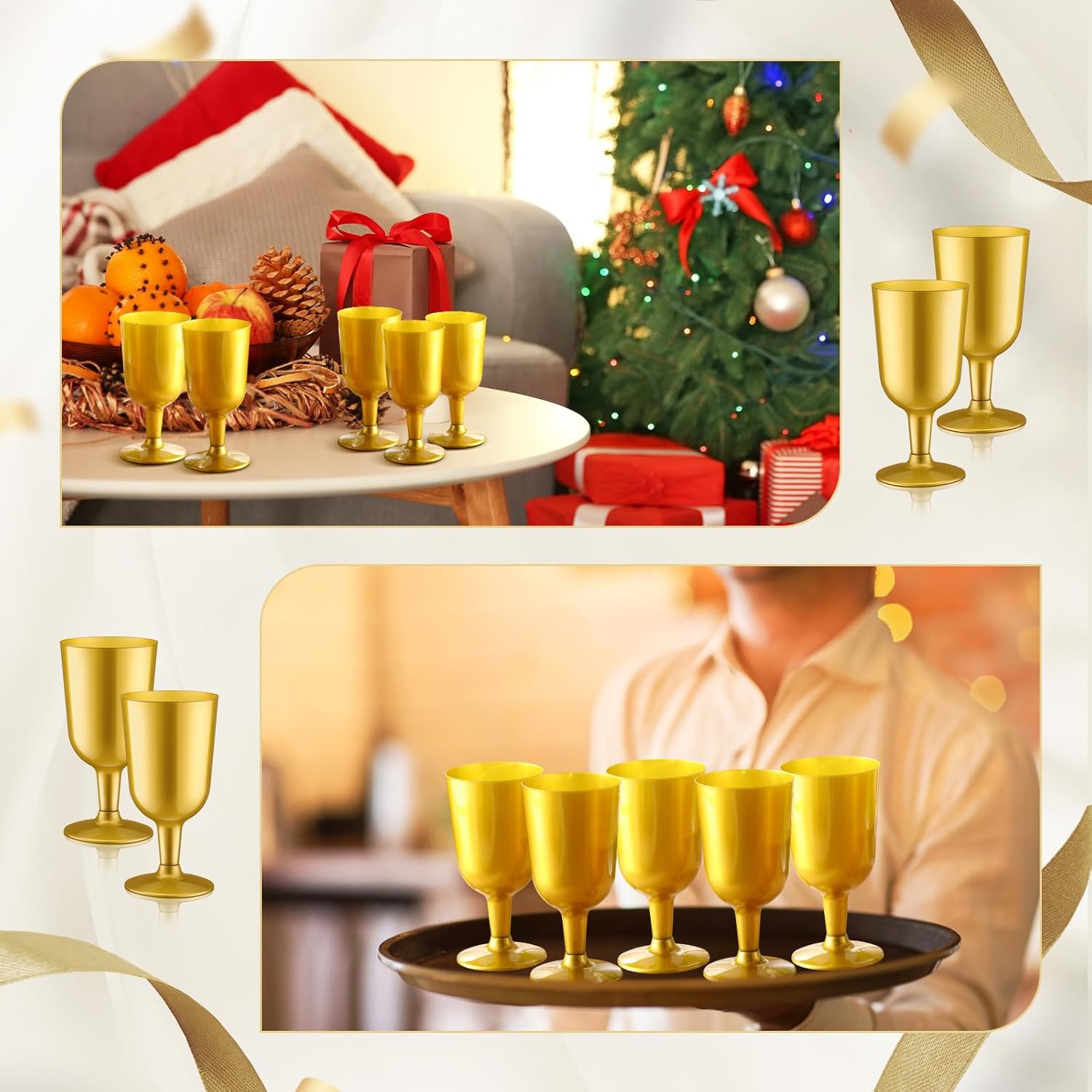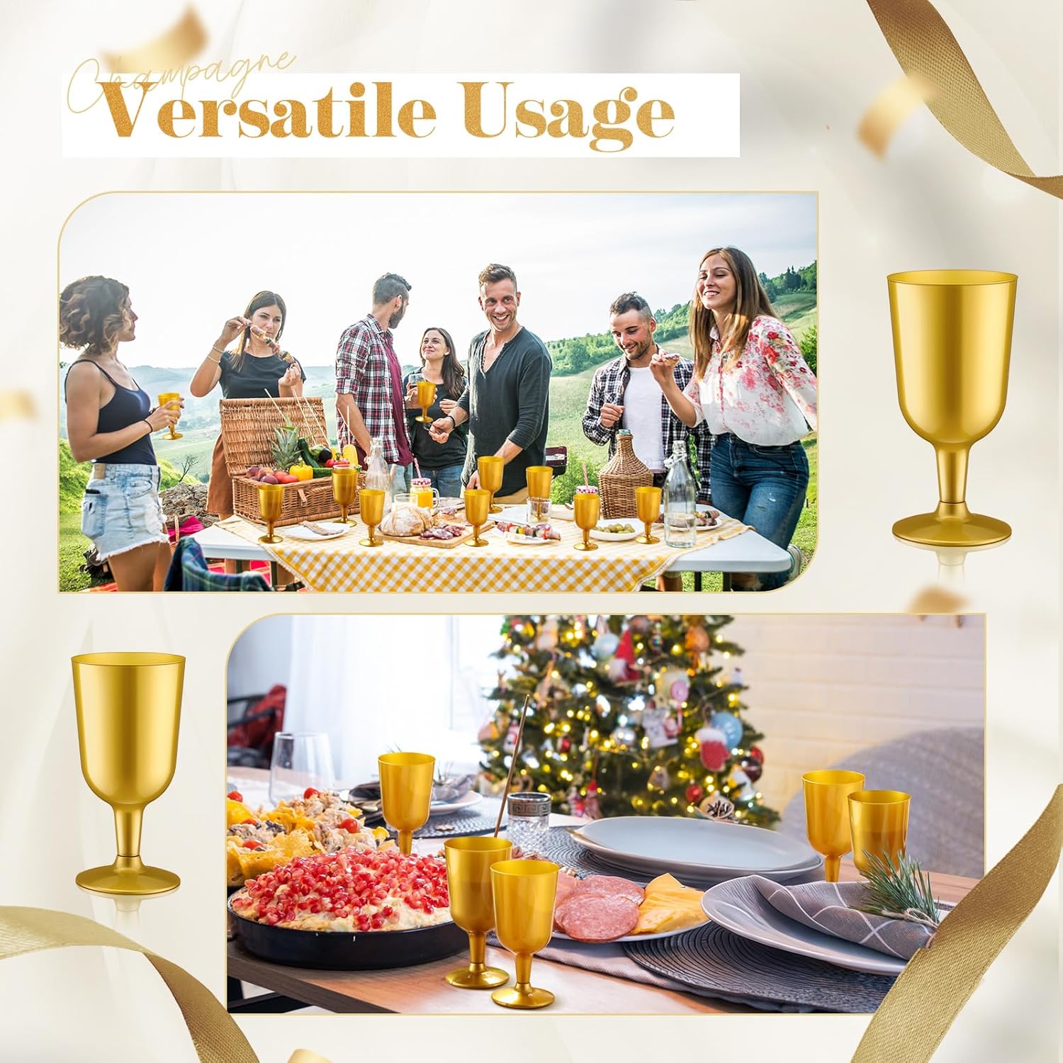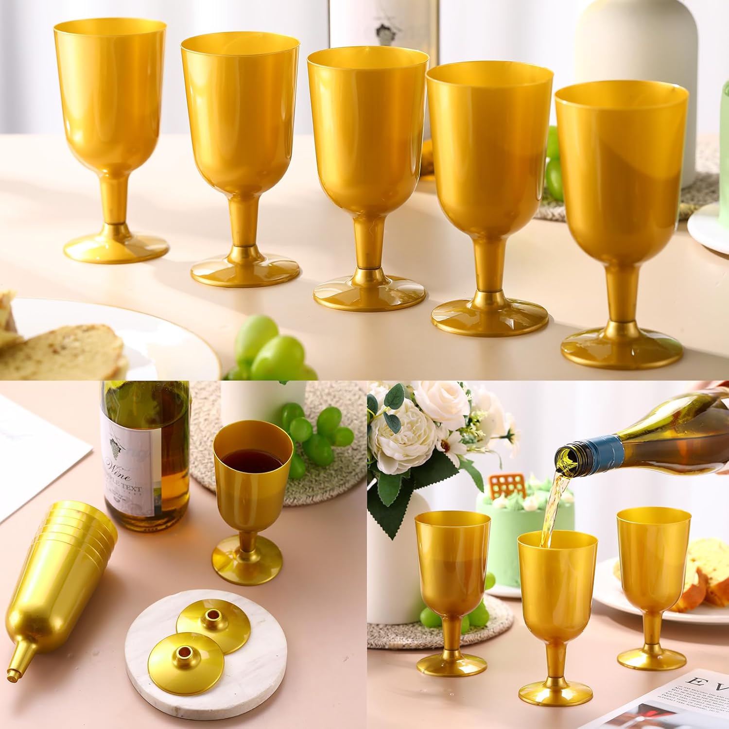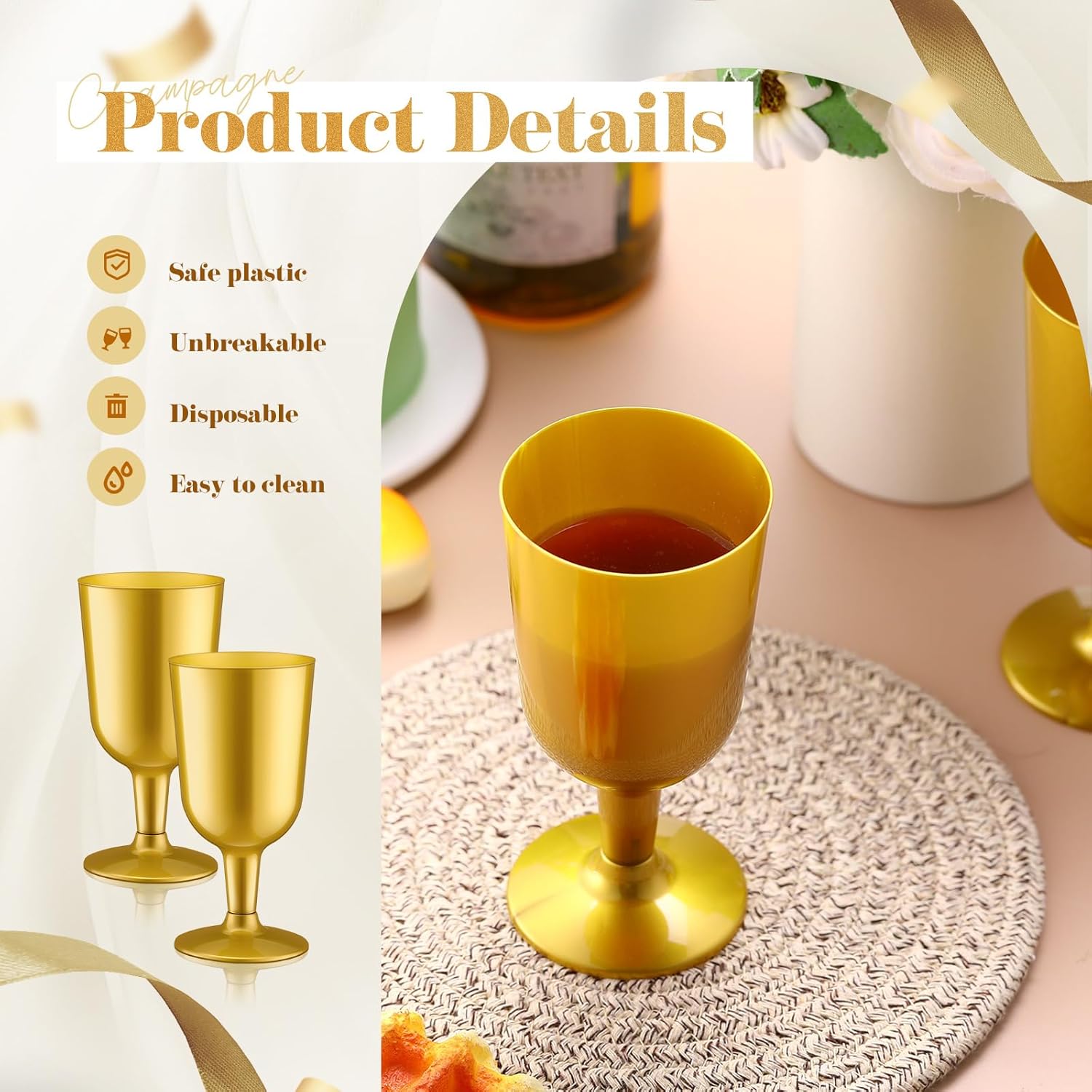 - Versatile Event Essential: ideal for any occasion, these wine glasses are versatile event essentials; Whether hosting a dinner party or a casual backyard barbecue, the gold plastic wine glasses cater to every occasion, instantly adding a touch of sophistication that complements any celebration theme