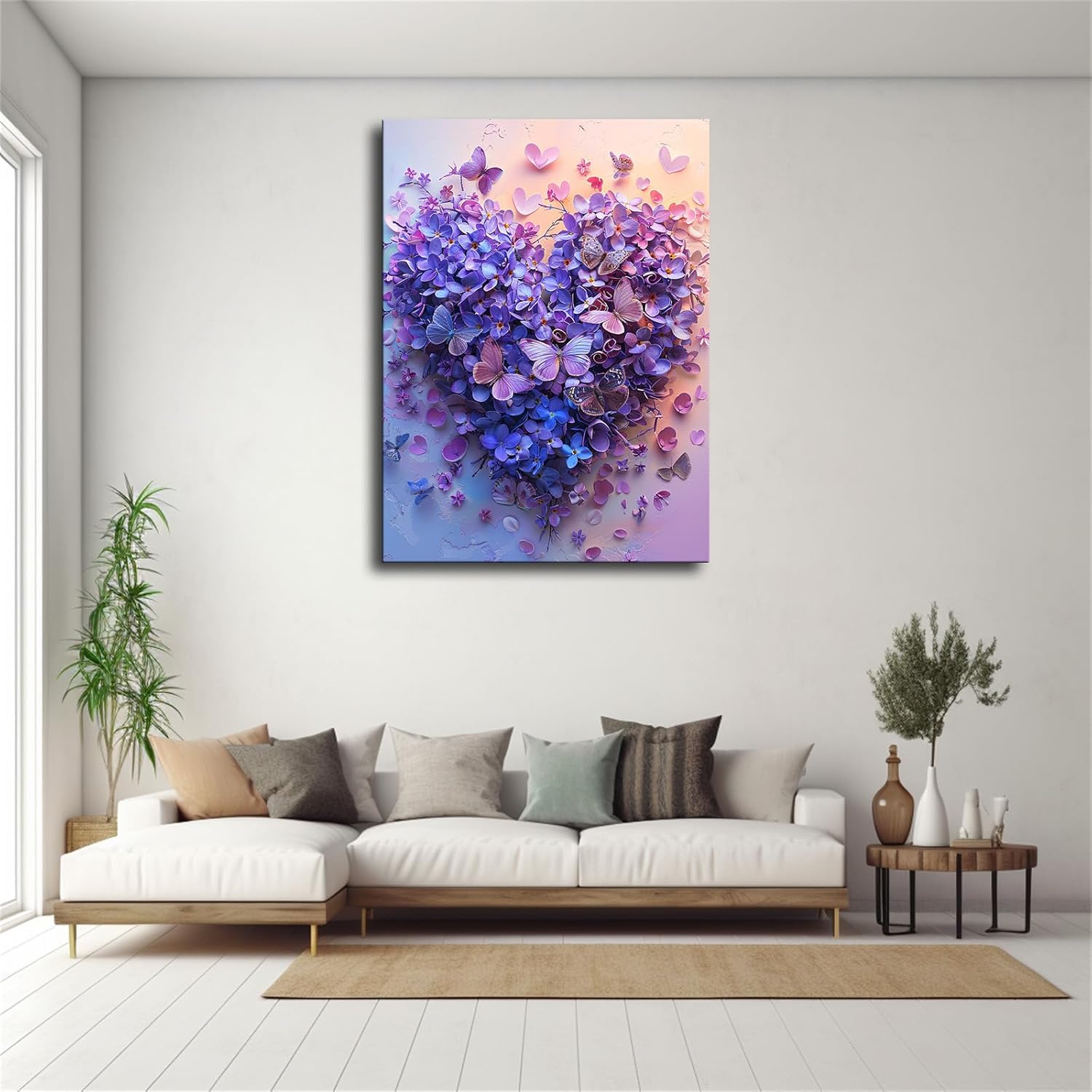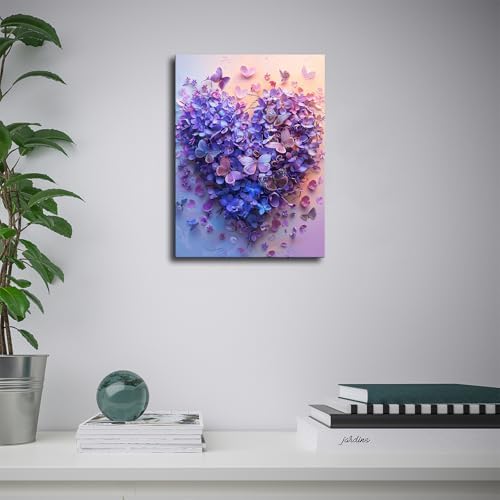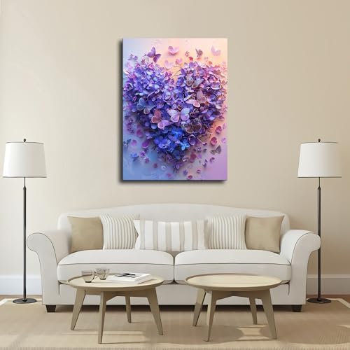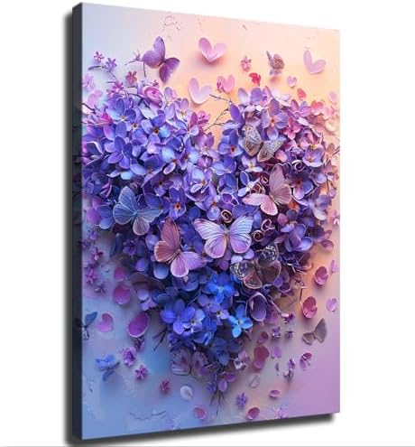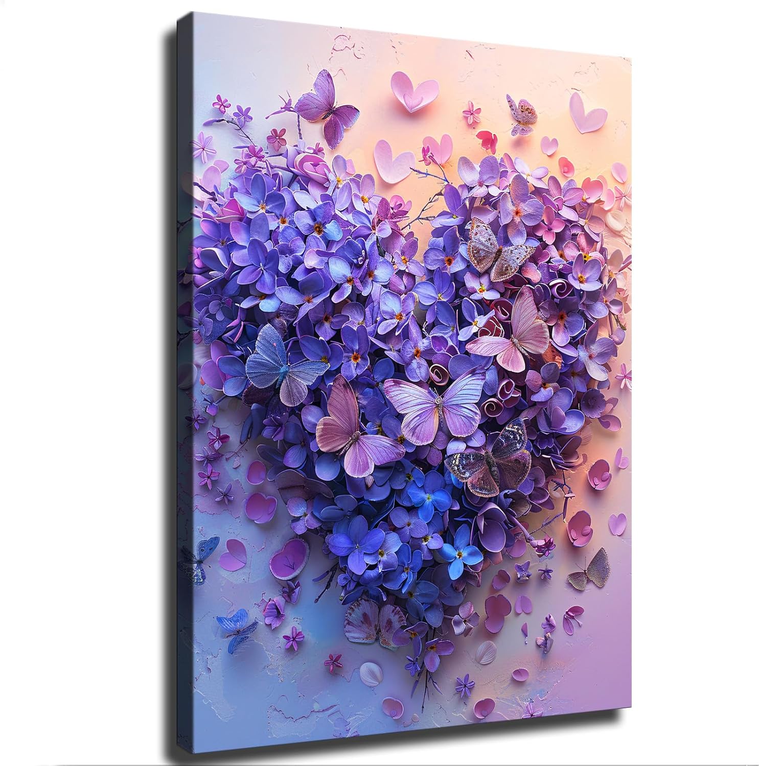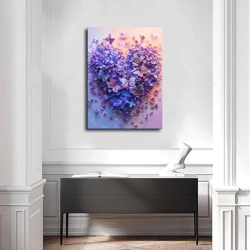 A Heart-shaped Pattern of Purple Flowers and Butterflies on A Soft Gradient Creates A Romantic and Dreamy Scene Poster Wall Art Canvas Print Picture Home Bedroom Decor Present Frameless and Framed (0812inch Framed)