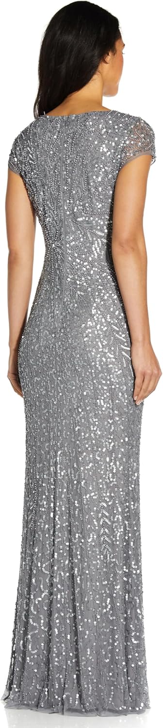 A stunning silhouette accented with allover hand beadwork. Designed in a silhouette that drapes to the floor, with delicate cap sleeves and an elegant V-neckline. We love this gown for Mothers-of-the-Bride or groom, as well as for anyone looking for their next irresistible (and iconic) evening gown.