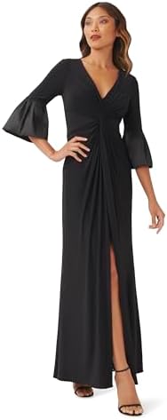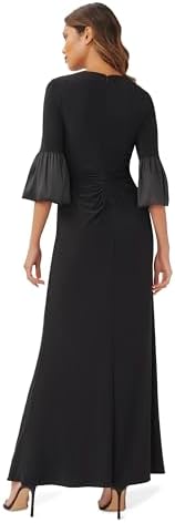 Timeless and glamorous, our floor-sweeping gown is crafted of a stretch jersey knit for a luxuriously soft look and feel. We love the figure-flatting twisted front and modern elbow sleeves with dramatic bell cuffs made of taffeta. All the details: flattering v-neckline and sleek back zip closure. Calling all mothers-of-the-bride, youll be a standout in your dress too.
