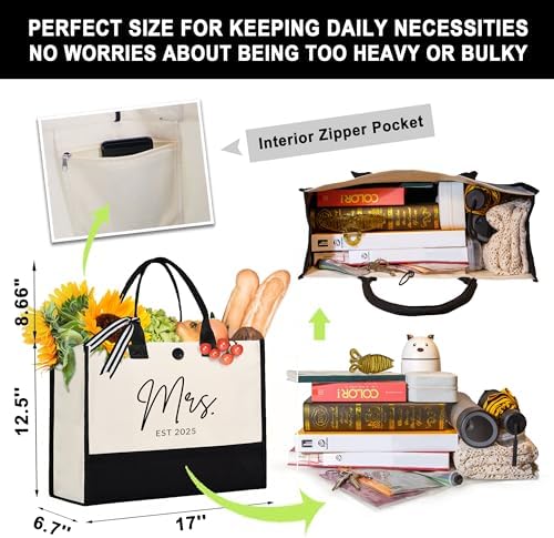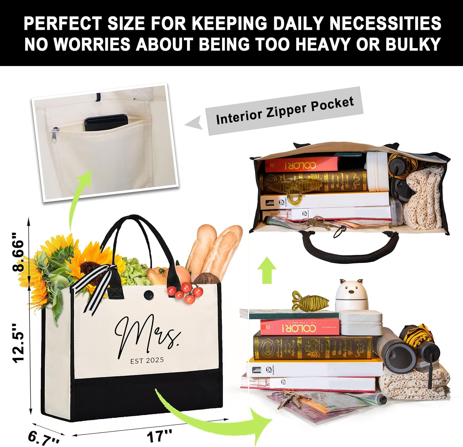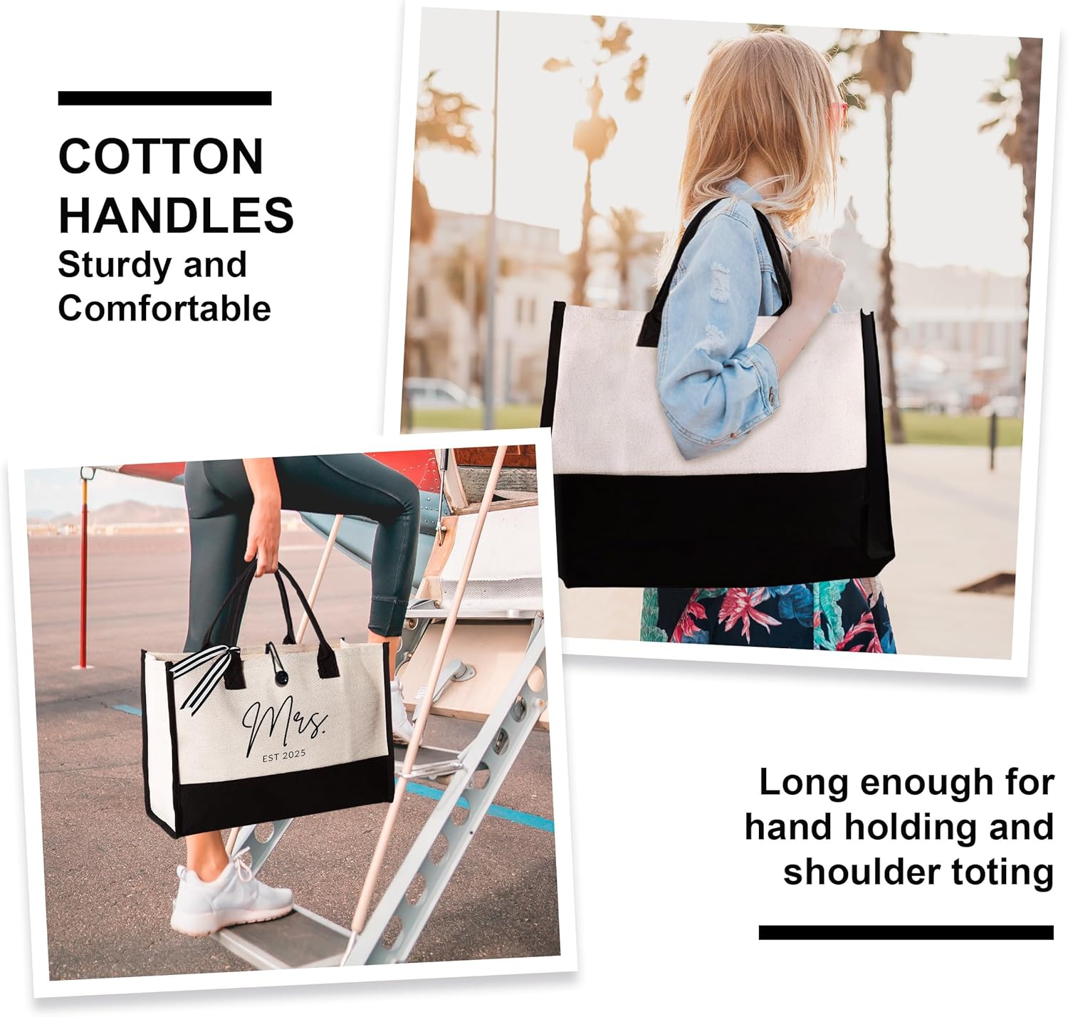 - 【Classic Design】 The tote bag features the exquisite words “Mrs. EST. 2025” printed on it in an elegant and eye-catching font that adds a touch of glamour to your everyday look. Classic black and white stitching, very fashionable.