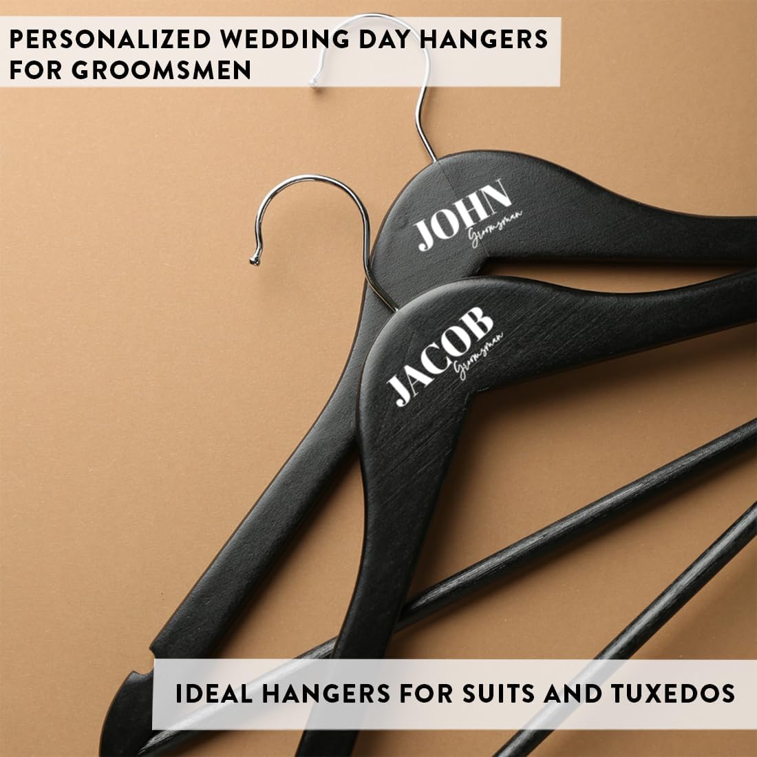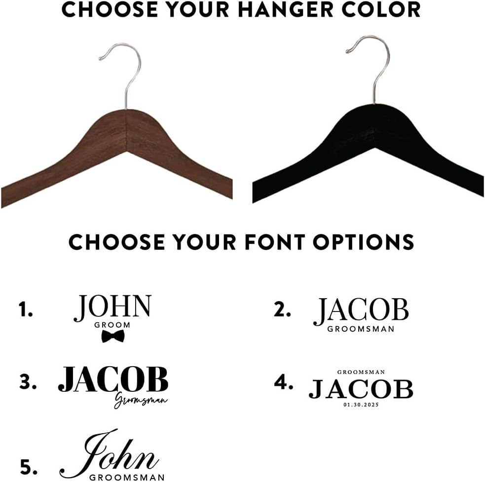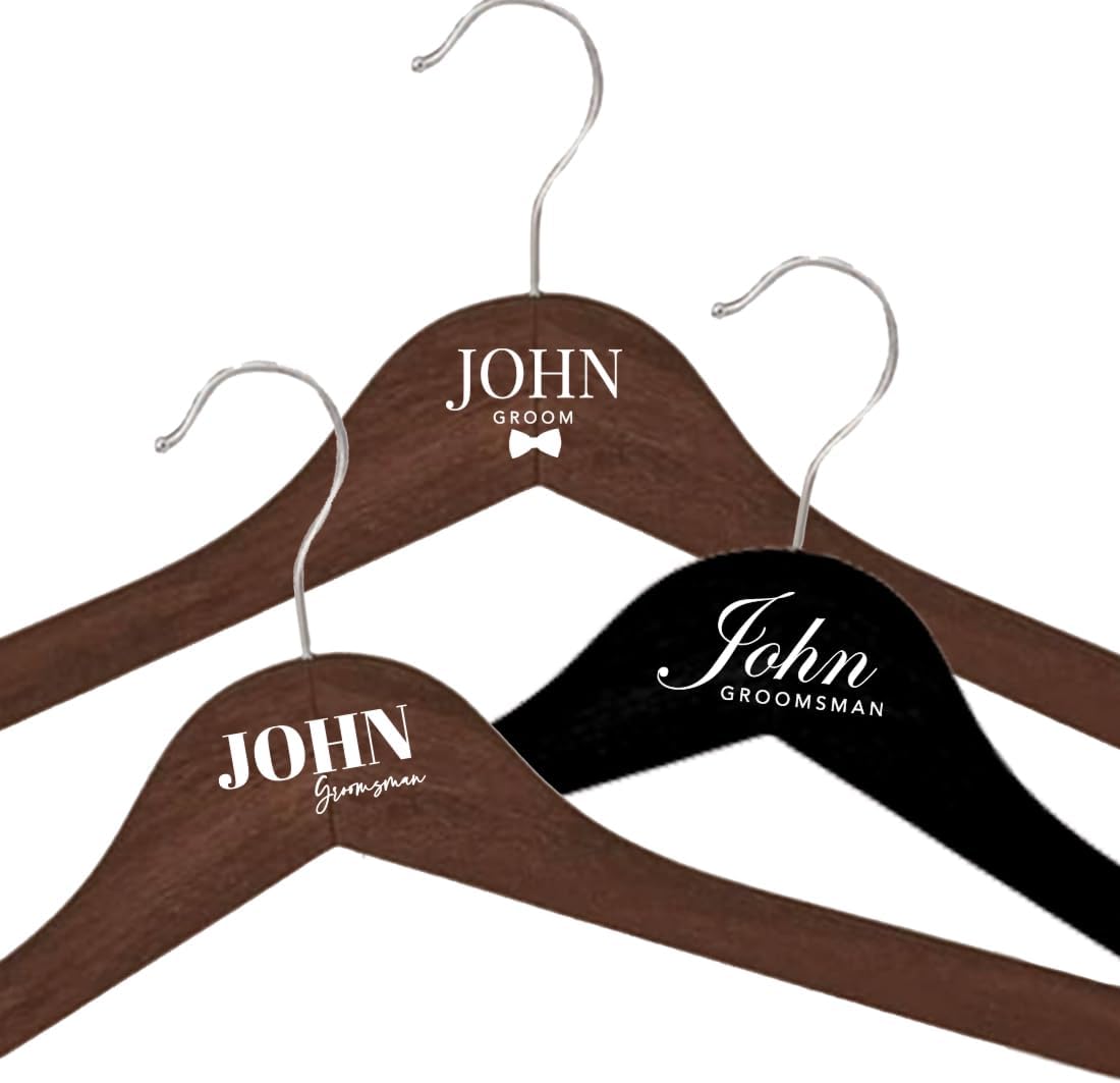 • CUSTOM GROOMSMEN HANGER FOR WEDDING SUIT – Make your big day even more special with groomsmen hangers for wedding suits. Designed for suits and tuxedos, these 17″x8.3″ birch wooden hangers for clothes holds up to 11 pounds and add a personalized touch to your wedding party. Choose from 5 font styles to personalize the groomsmen hangers for the groom and groomsmen.