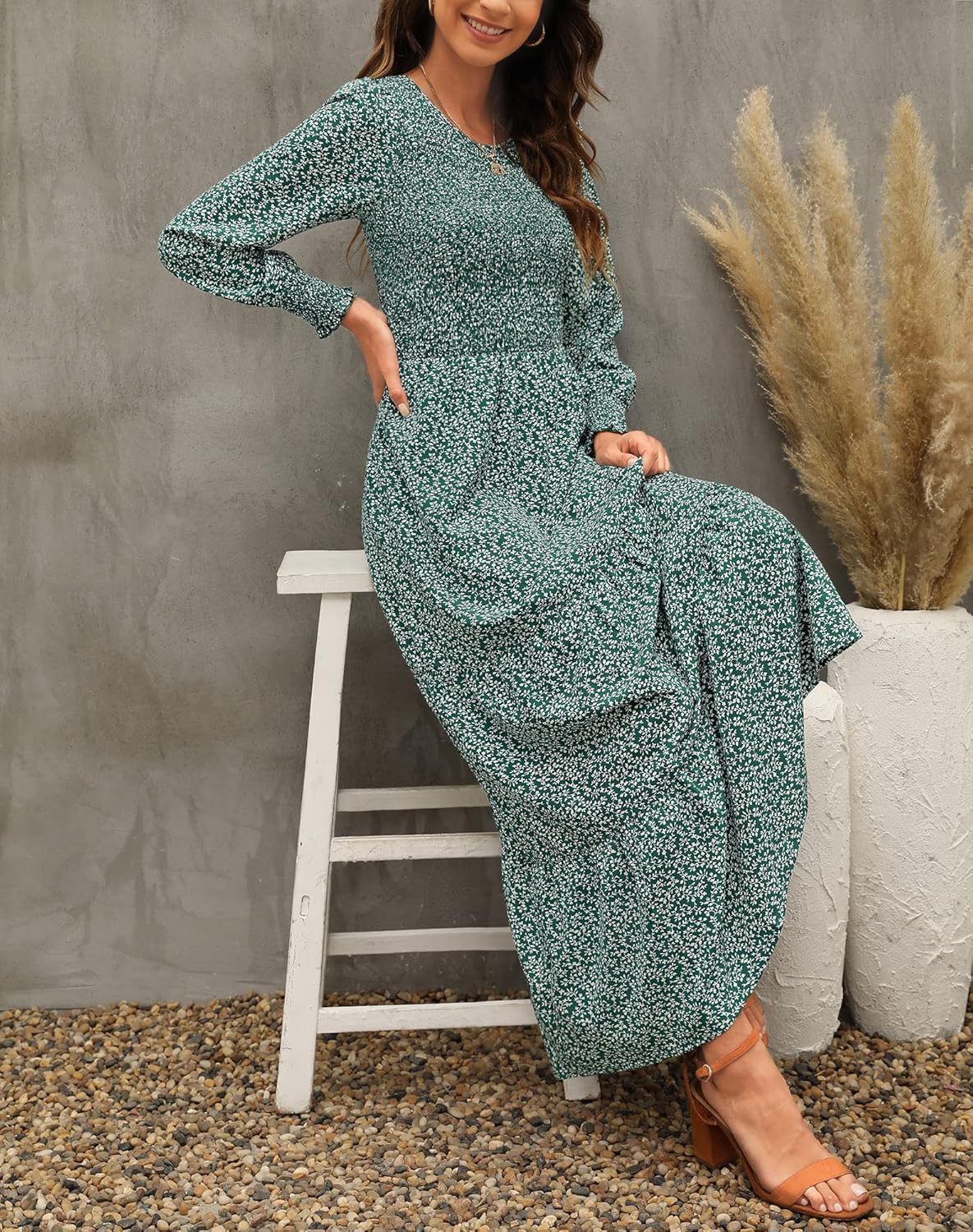 Smocked Maxi Dress: Smocking on the top and has good stretch! So comfy for various bust size.Long Sleeve Dress with Smocked Cuffs: Smocked cuff is a great detail that flatters the arm well.