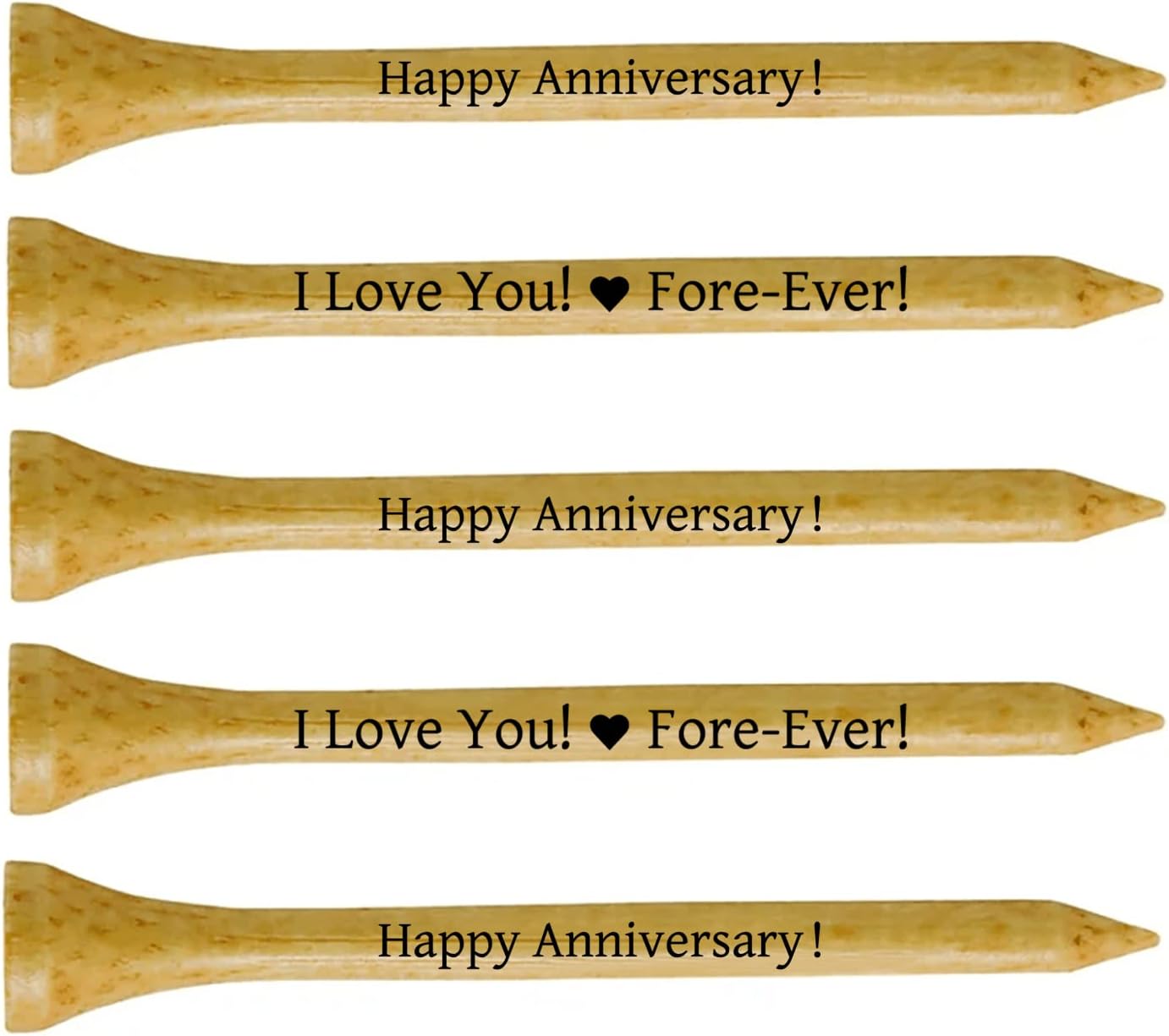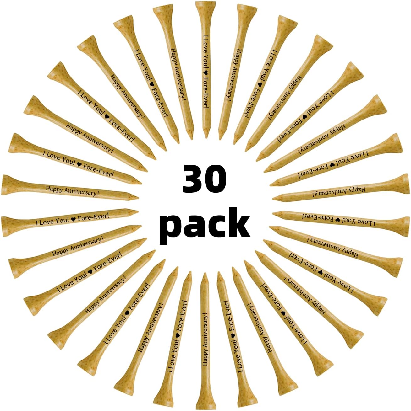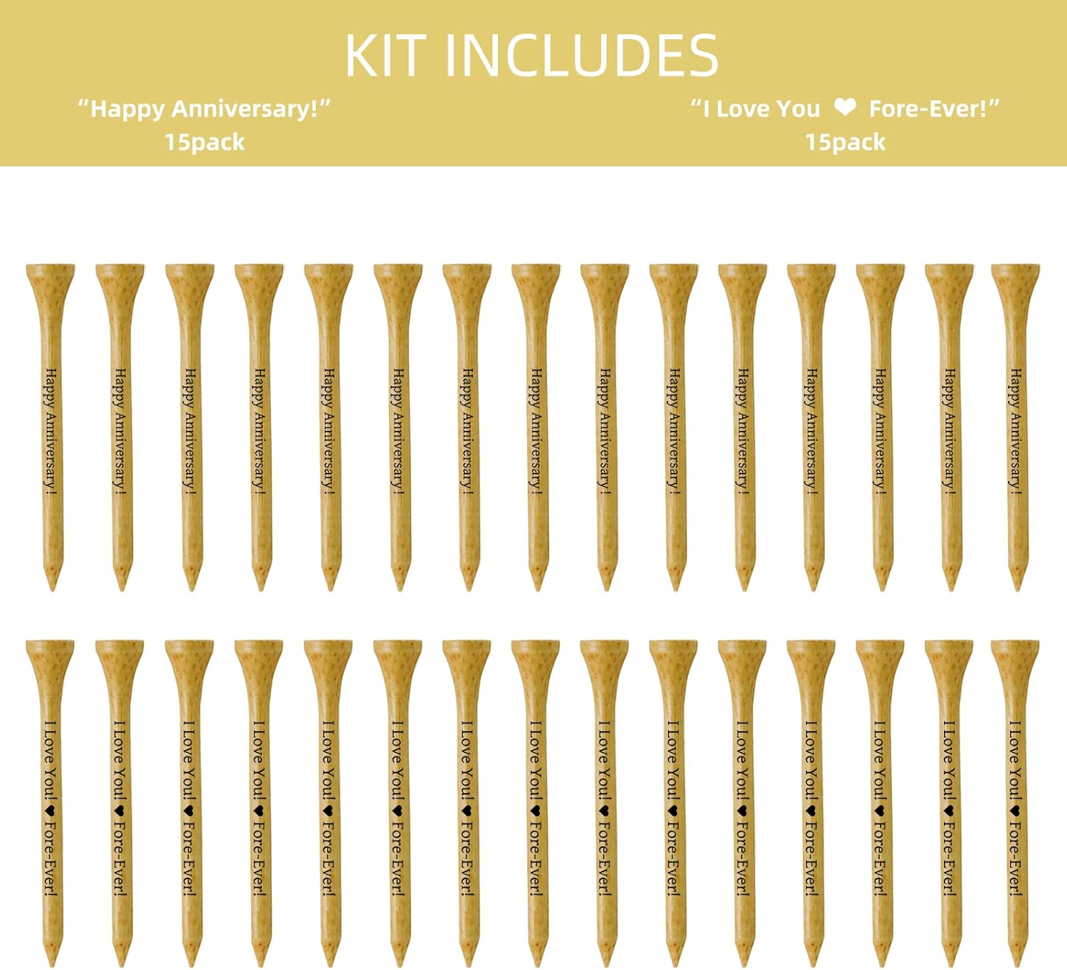30 Golf Tees that read “Happy Anniversary!”, “I Love You! Fore-Ever!”.Each golf tee measures about 3-1/4 inches / 8.2 cm.100% bamboo products, natural degradation.Great Gift Item for Your Favorite Golf him, Perfect for anniversary Day.