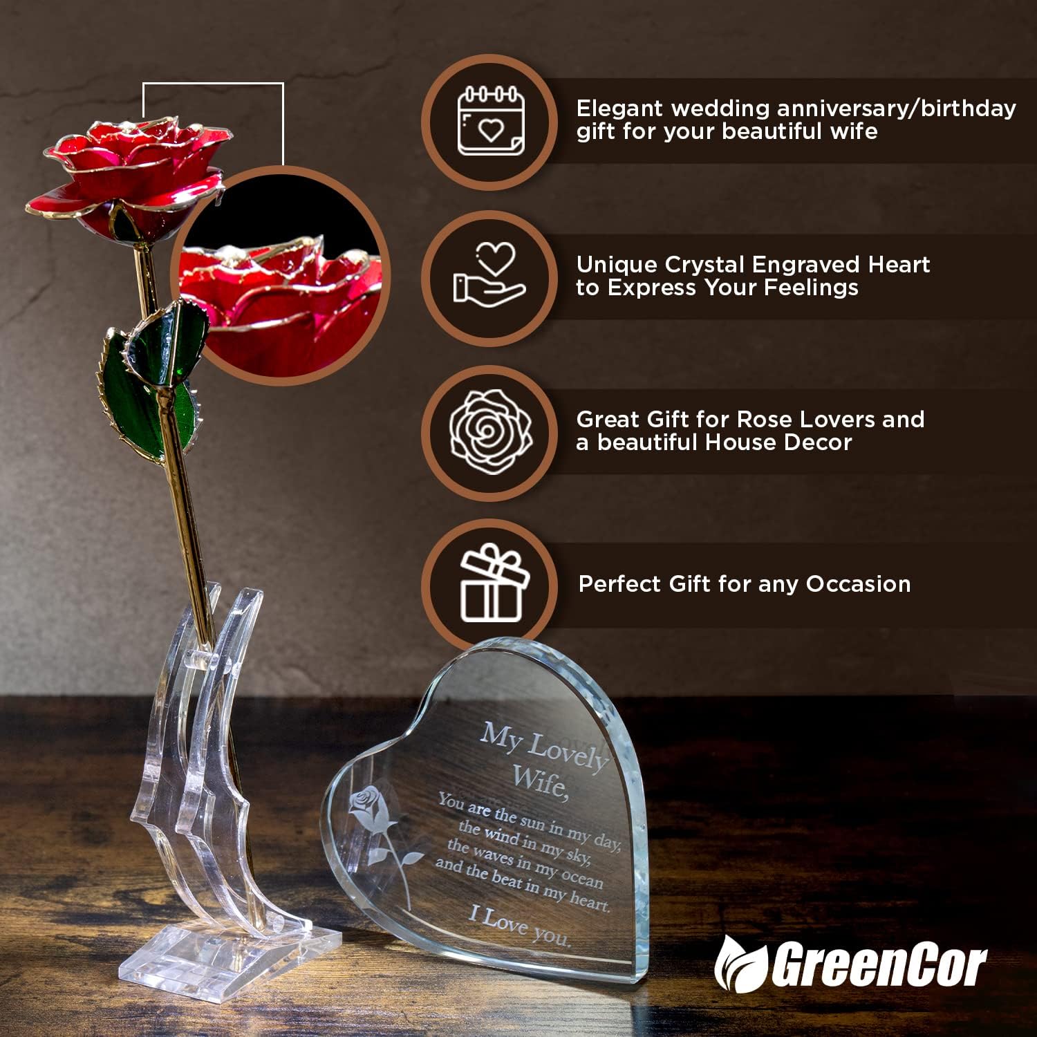 - TRULY MEANINGFUL-This is a truly meaningful gift that any wife would be over the moon to receive. From the handcrafted wooden box to the lovely crystal heart and the gold dipped red rose, this is the perfect way to make your special day that much better. A sure head-turner, the Wooden Gift Box is enough to spark a conversation among guests. Your wife is sure to be delighted.