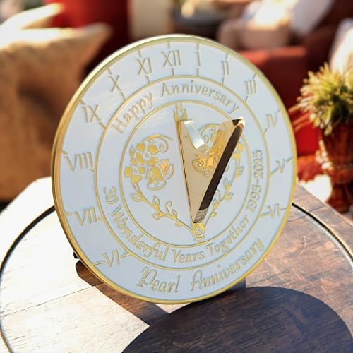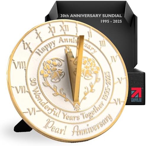 - DIMENSIONS – Measuring 6.4″ across by 3″ high, this sundial is just the right size to cast ‘Happy Anniversary. 30 Wonderful Years together 1995 – 2025. Pearl Anniversary’ into the very fabric of the metal itself.