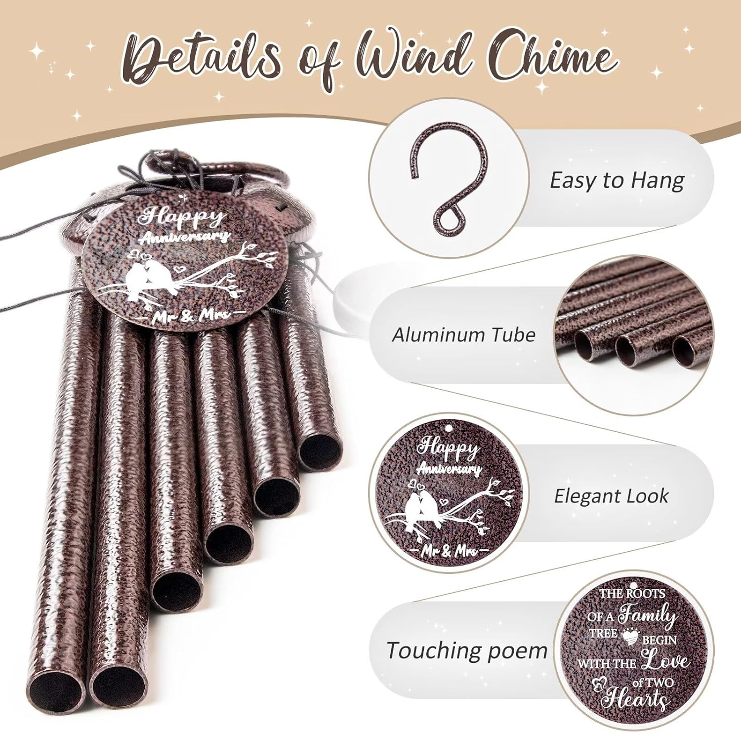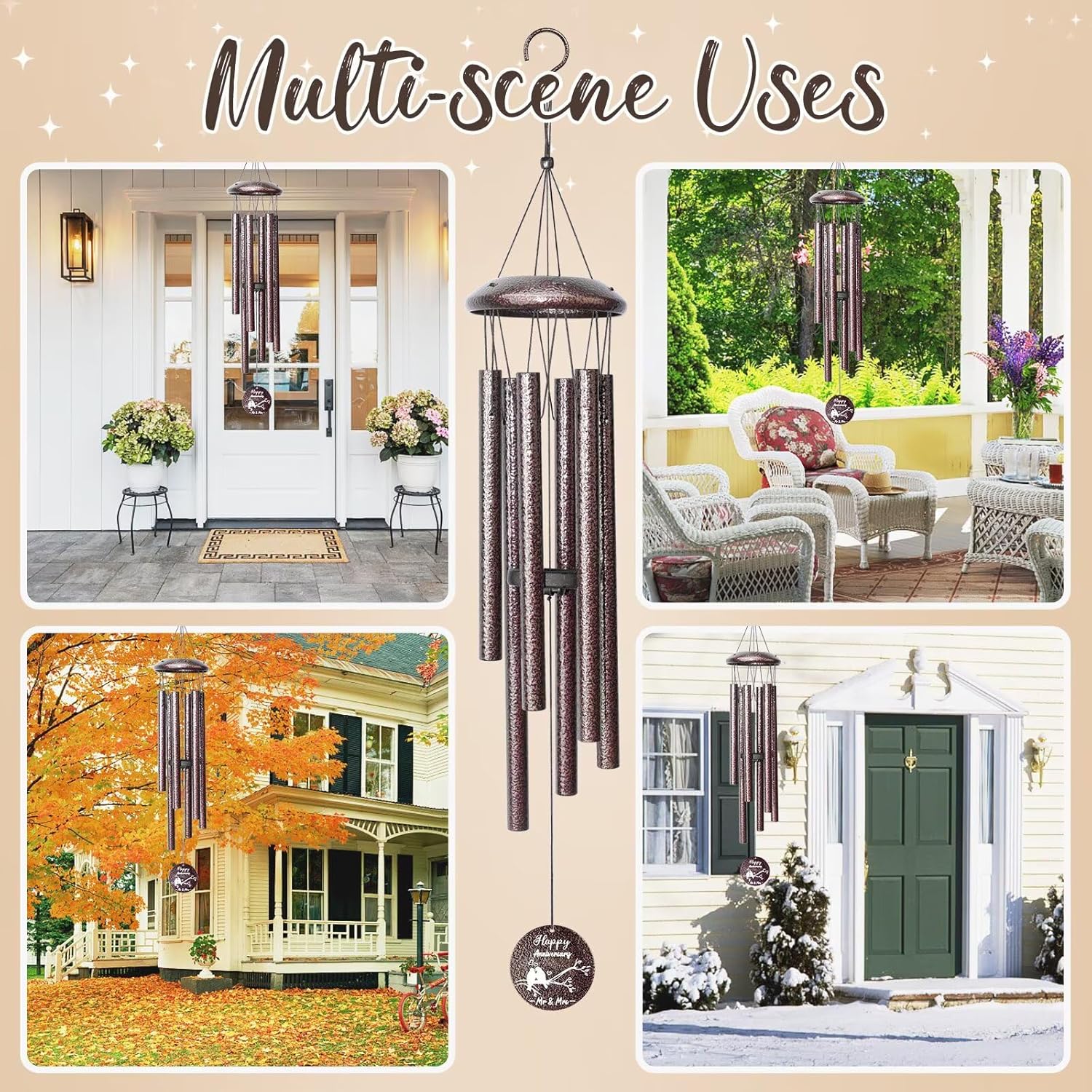 • Unique anniversary Decoration:This windchimes outdoors & indoors With a beautiful textured bronze finish, It’s a perfect size, will add beauty to any porch, garden, backyard, patio, or patio decor.Whenever the wind blows, it brings pleasant notes., making it more than just an anniversary gift—it’s a timeless keepsake of love.