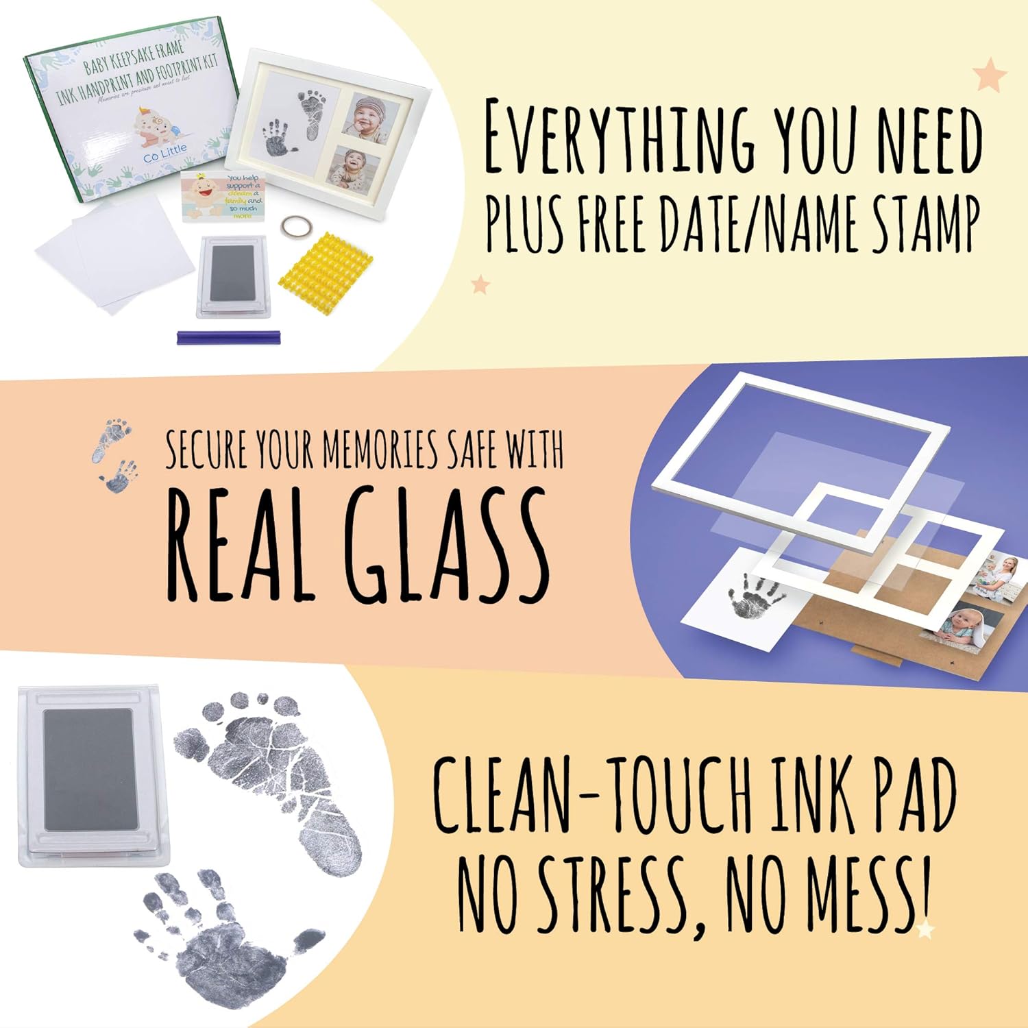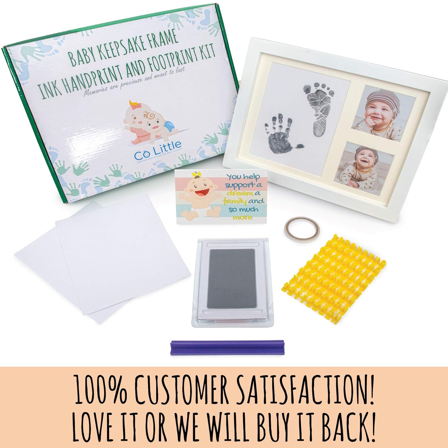 Solid durable wood frameClean-touch ink pad (NO mess, baby doesn’t touch the ink)5 pieces of paper (make extra prints for family)Double sided tapeAlphabet and date stampEasy to follow instructionsBeautiful gift carton