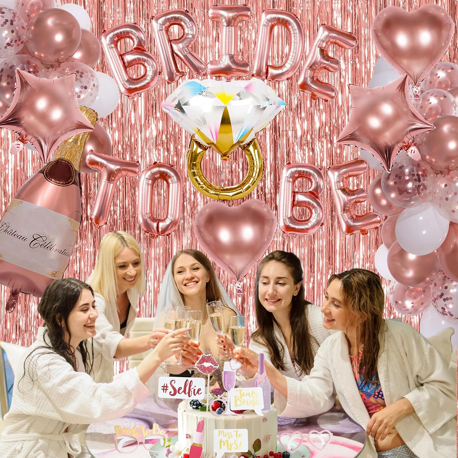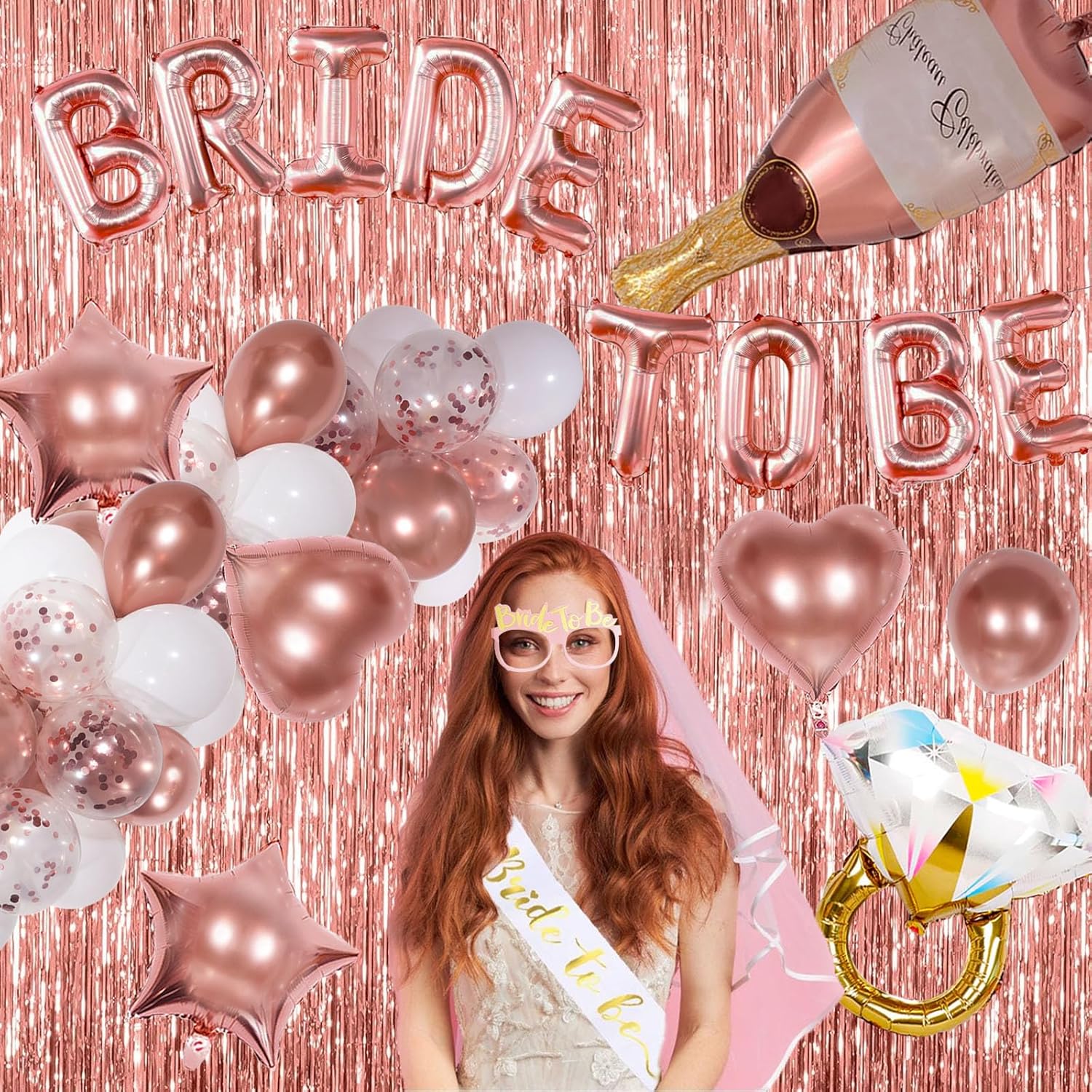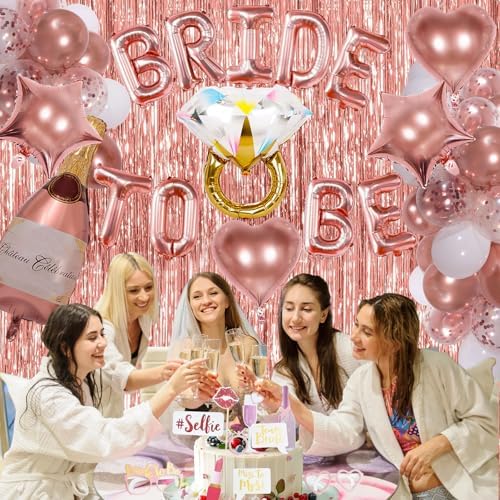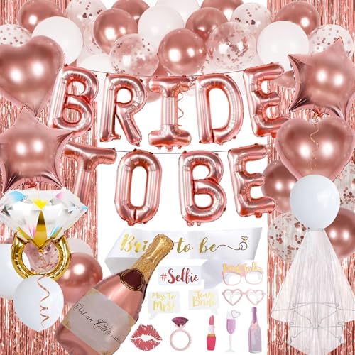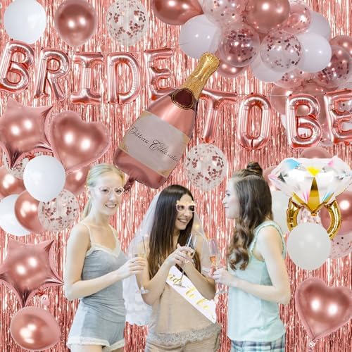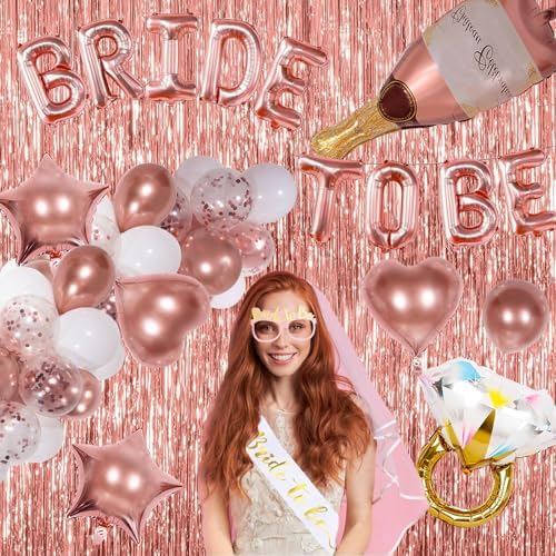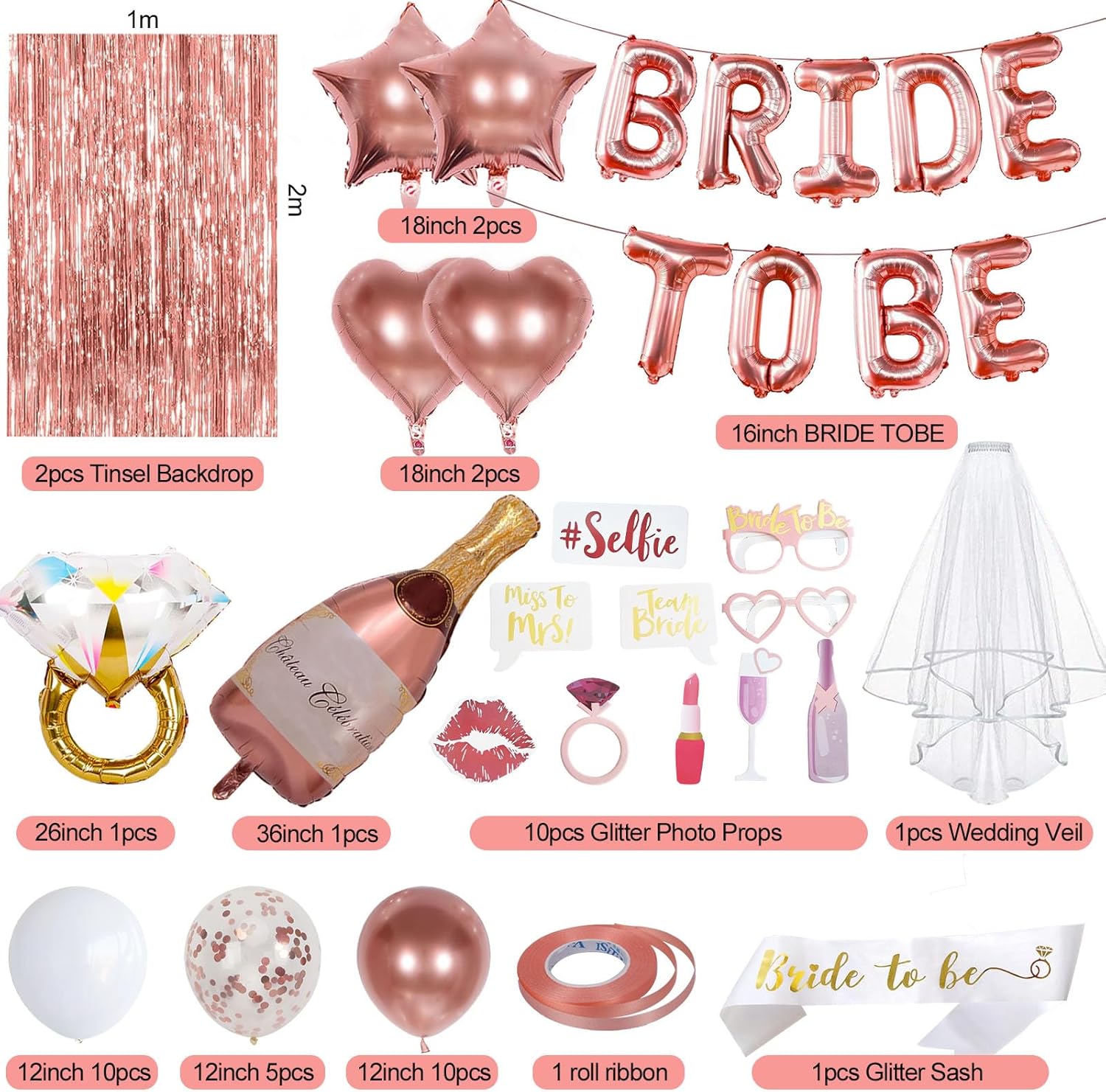 - Bachelorette Decor: Our bachelorette party decorations includes 16inche ‘BRIDE TO BE’ foil balloons, 1m×2m tinsel backdrop 2pcs, bride to be sash 1pcs, wedding veil for bride 1pcs, 36” wine bottle foil balloon 1pcs, 26” ring foil balloon 1pcs, 18” rose gold heart foil balloons 2pcs, 18” rose gold star foil balloons 2pcs, 12” rose gold balloons 10pcs, 12” rose gold confetti balloons 5pcs, 12” white balloons 10pcs, glitter photo props 10pcs, rose gold ribbon