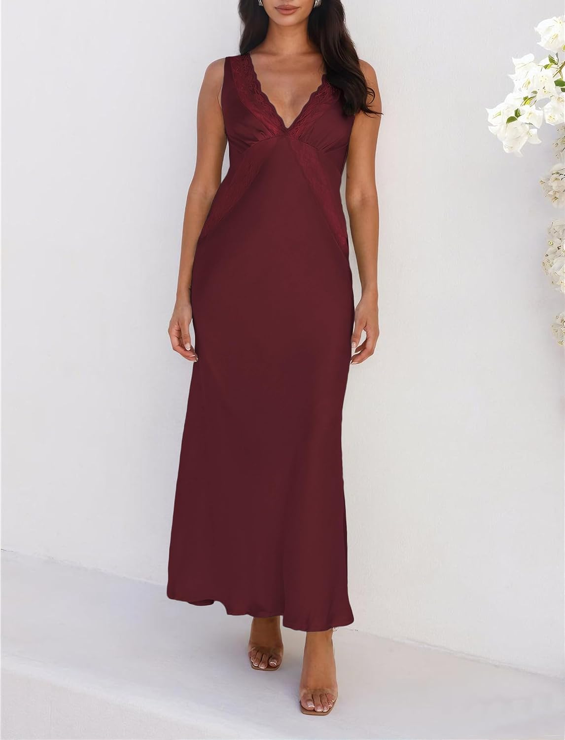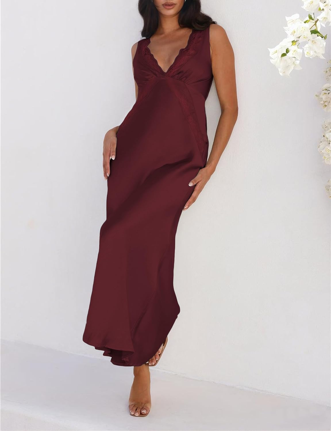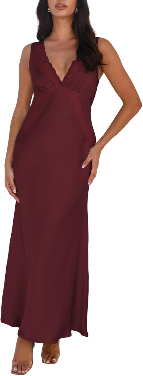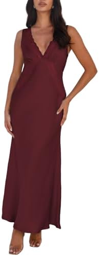- Unique Design: Show off your classy side in the silk deep v neck formal dress. The satin bridesmaid plunge maxi dress features a V-neck low back design , gorgeous lace trim on the neckline and bodice, flowy, silky silhouette.
