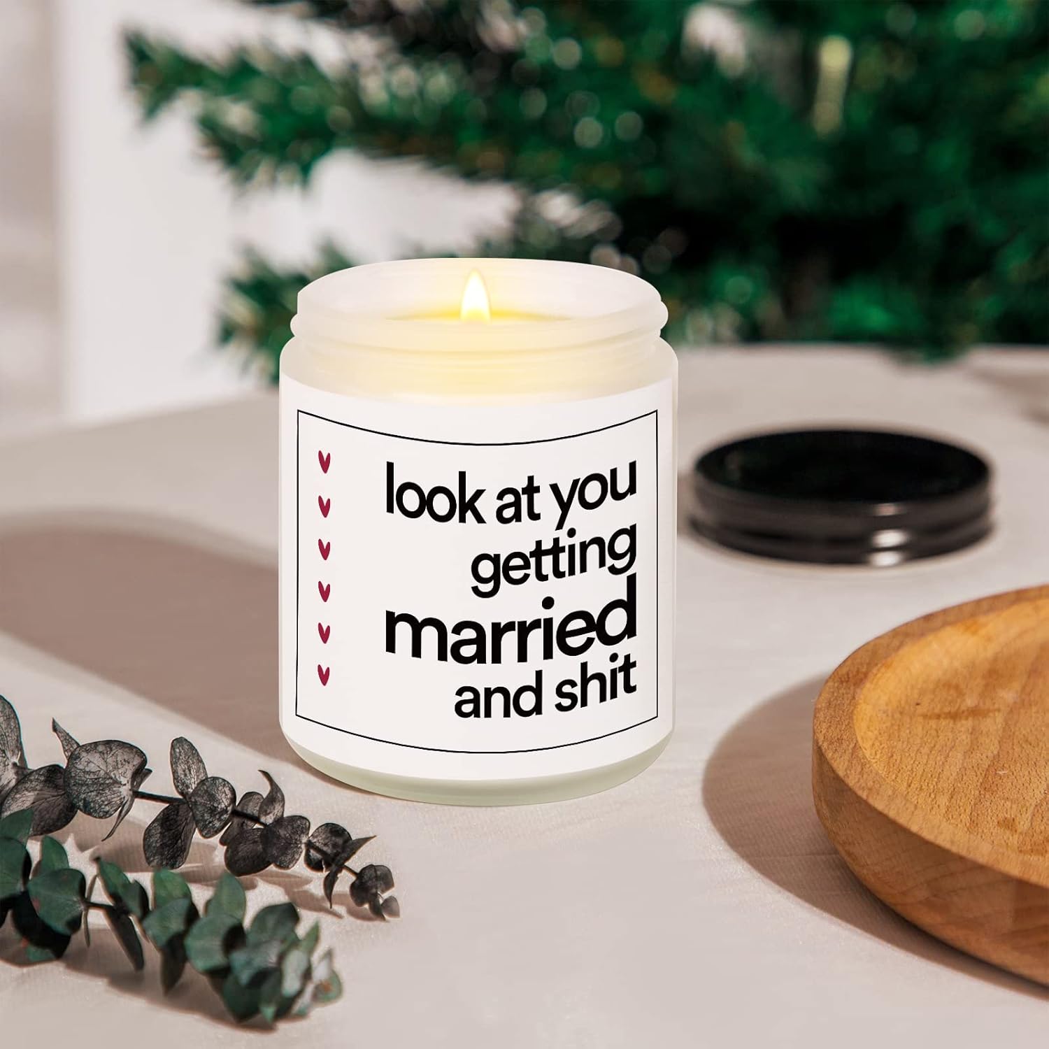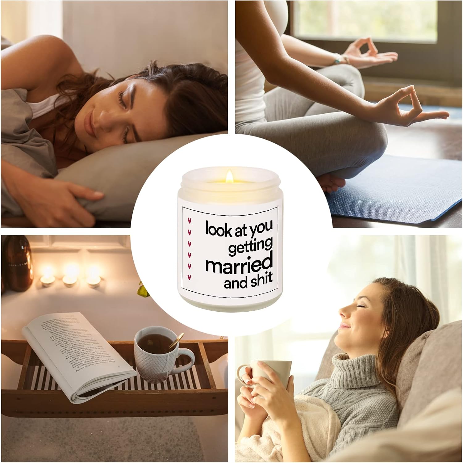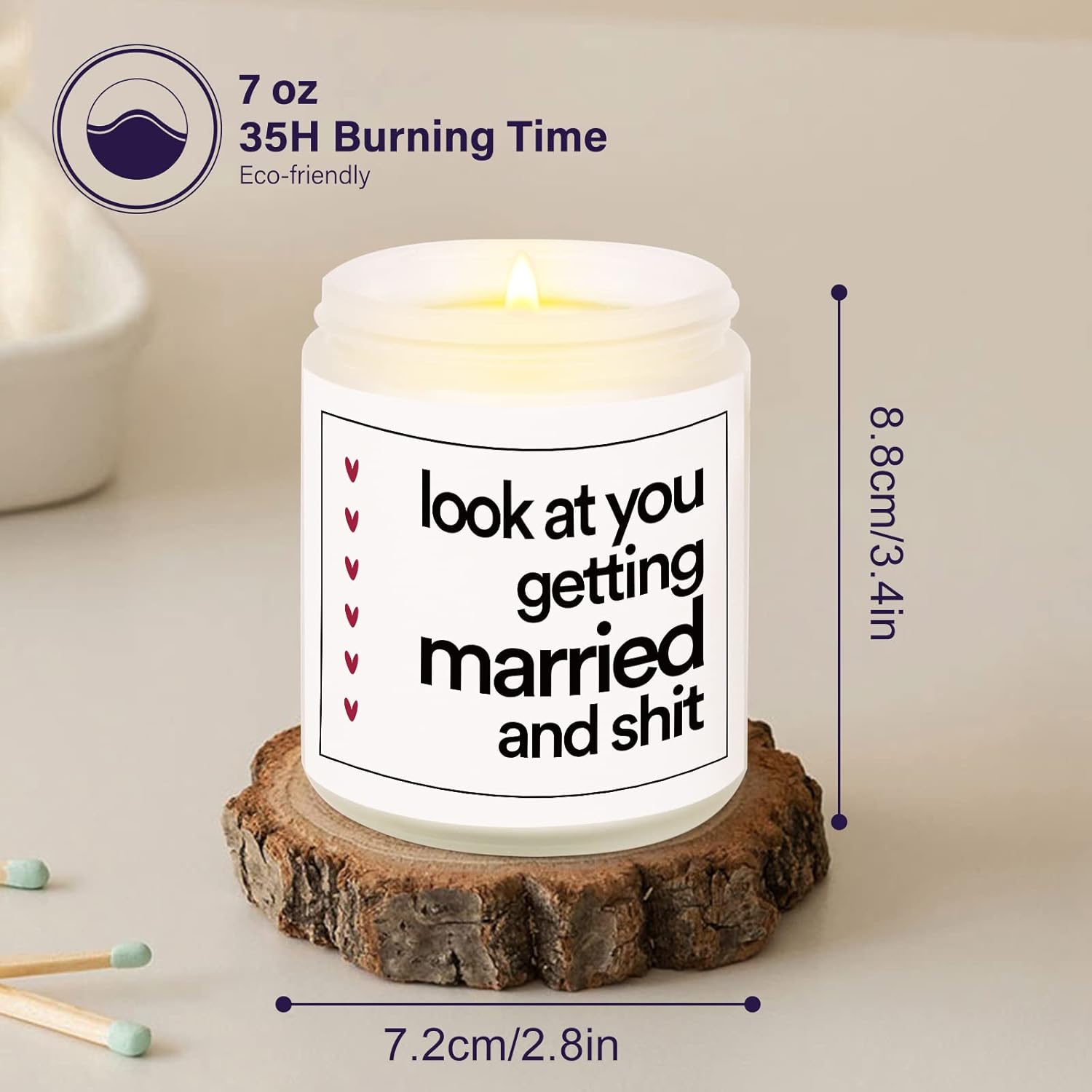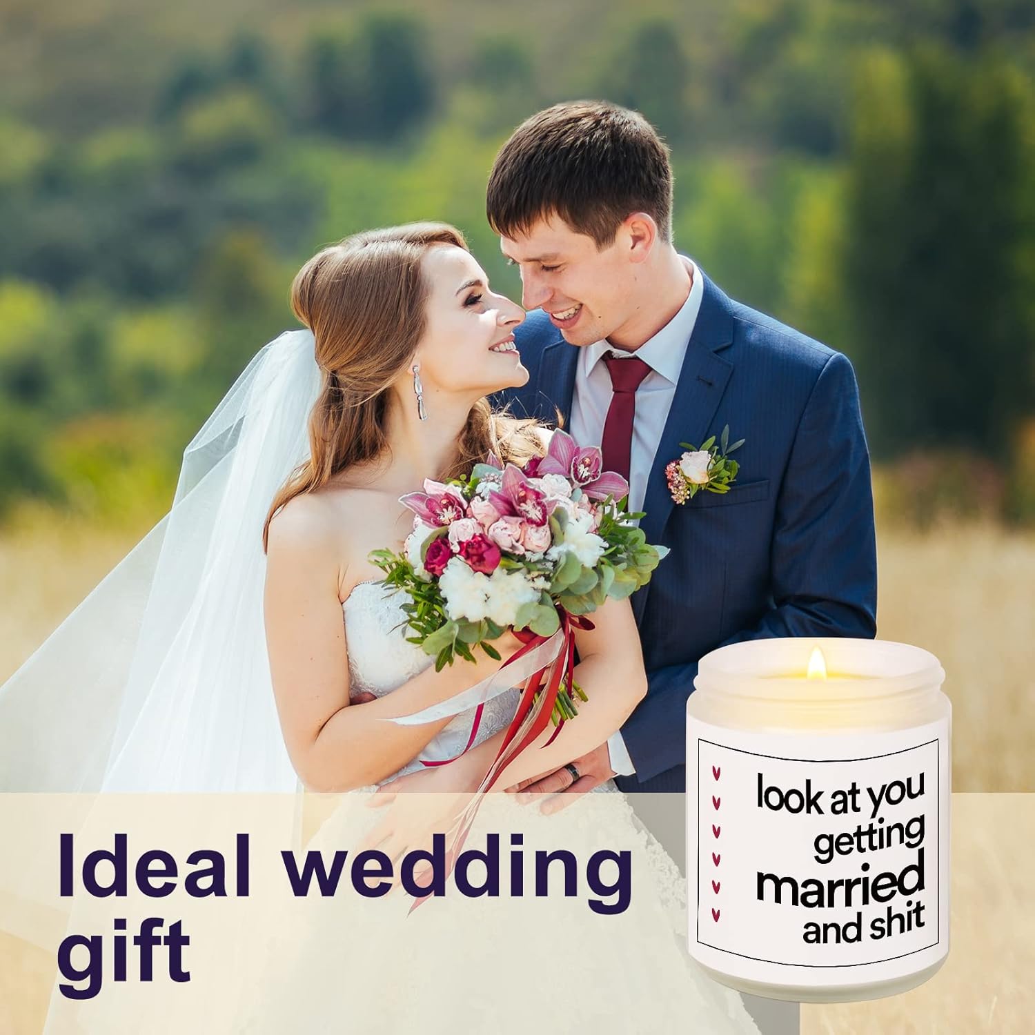 Funny Wedding Gifts for Couple, Friends, Bride, Bridal Shower Gifts for Her, Bride to Be Gifts, Engagement Gift for WomenA humorous scented candle can bring a lot of laughter and relaxation to the newlyweds!You can bring a lot of smiles to this happy couple with this attention-getting scented candle gift.7oz Scented Candle, Premium Quality, Pleasant Smell, Environment Friendly.Our scented candles are made of Natural Soy Wax and Cotton Wick. Each candle can be burnt for about 35 hours. The glass jar is reusable. The fragrance originated from essential oils.A non-toxic & eco-friendly gift that the happy couple would really use and enjoy.Using Tips Keep your candle away from flammable objects when burning and put it on a flat surface.We recommend you keep the wick trimmed to 1/4″ to avoid the black smoke and a too-high flame.You can clean out the residual wax with hot soapy water if you want to reuse the jar.Product Details1 x 7oz Handmade scented candleWeight: 405gSize: 8.8cm in height. 7.2cm in diameter.