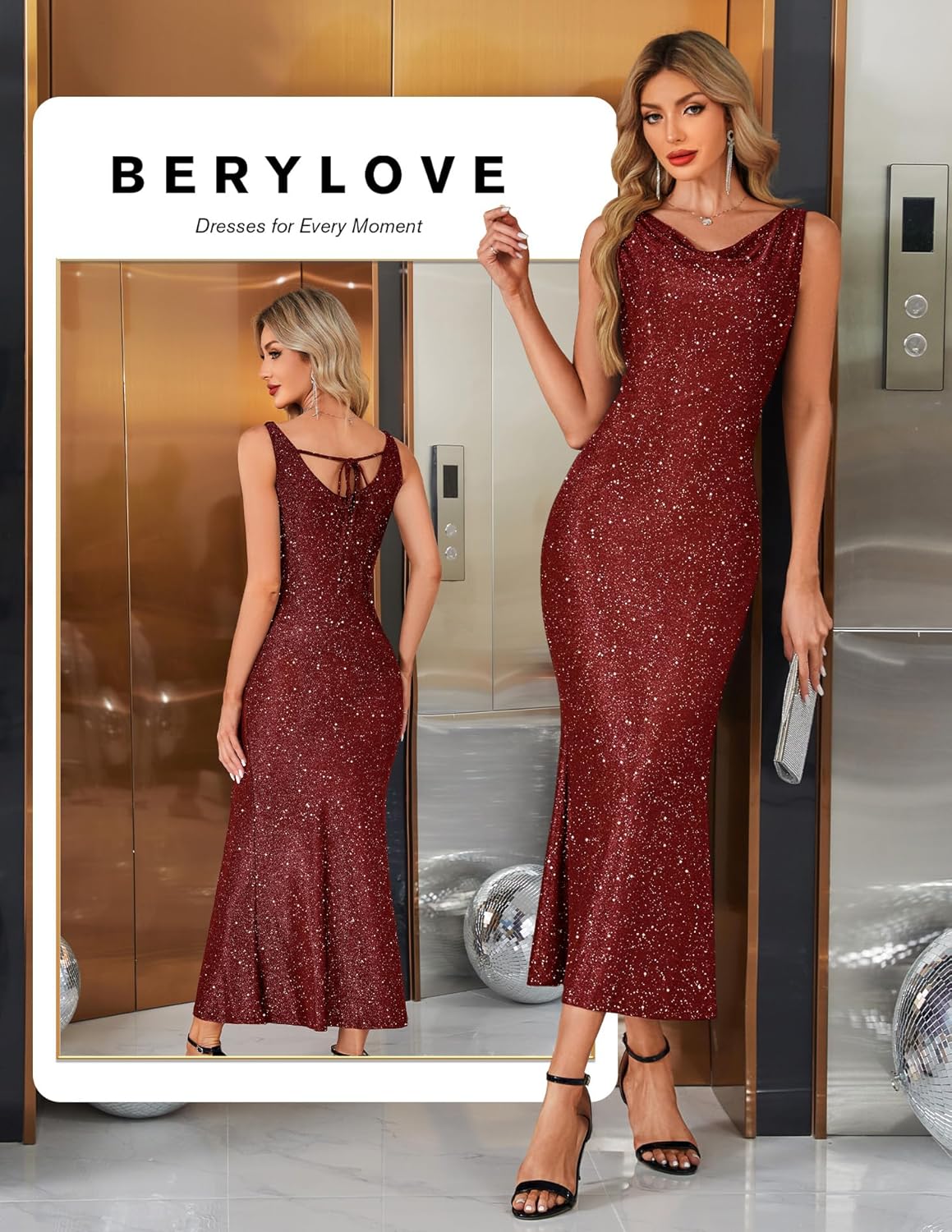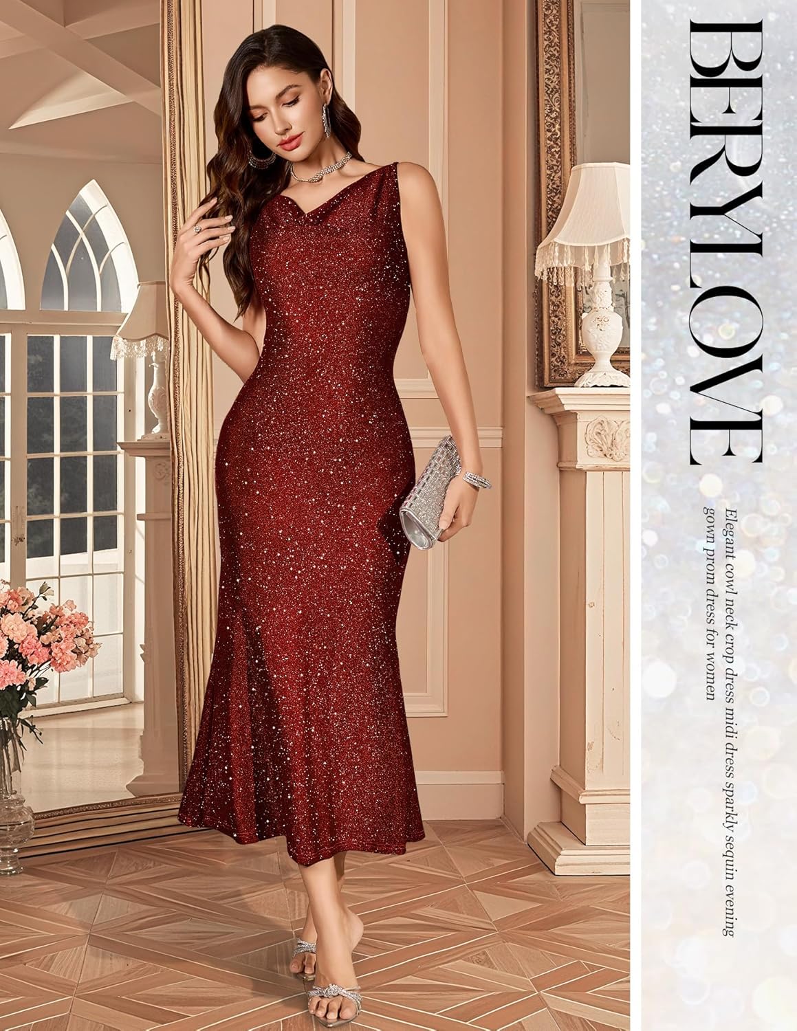 BeryLove Formal Sequin Wedding Guest Cocktail Christmas Cowl Neck Bodycon Dress