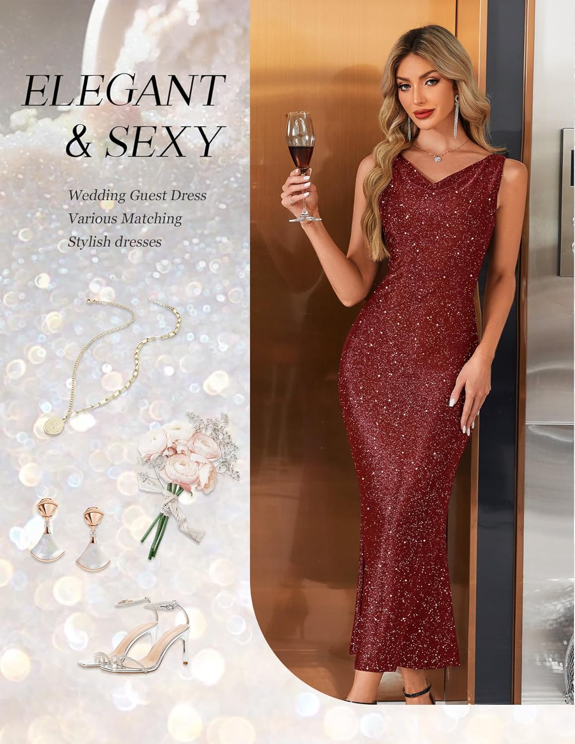 - Elegant Wedding Guest Sequin Dress: Crafted with premium fabric adorned with sparkly sequins that effortlessly catch the light, creating an enchanting glow.Features cloud-like lightness with stretchy comfort, a breathable overlay paired with soft lining design that ensures comfort all day long