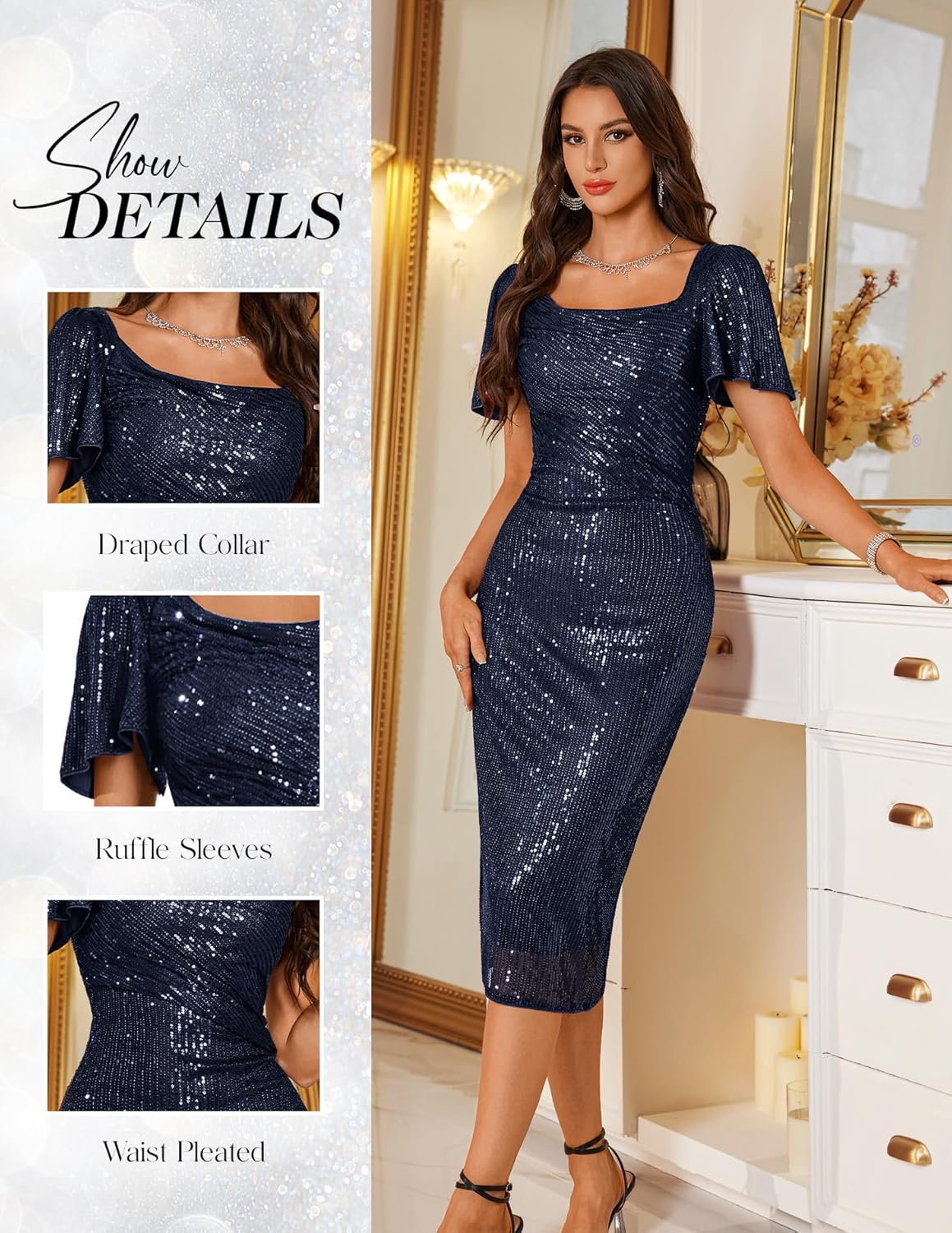 - Features: Designed with ruffle sleeves and a ruched waist, this bodycon sequin dress hugs your curves in all the right places. The back slit design and elegant details not only add a touch of sophistication but also ensure greater freedom of movement, making it a standout choice for any special event.