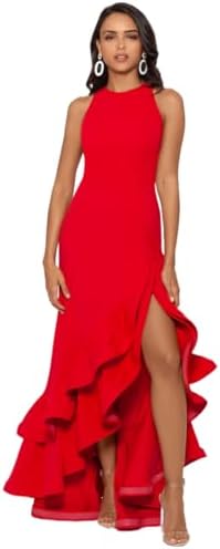 Make a statement with this high-neck gown featuring a fitted bodice and a dramatic high-low hem adorned with cascading ruffles. Perfect for unforgettable evenings and special occasions.