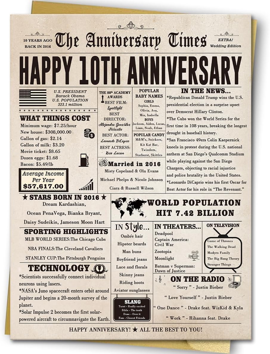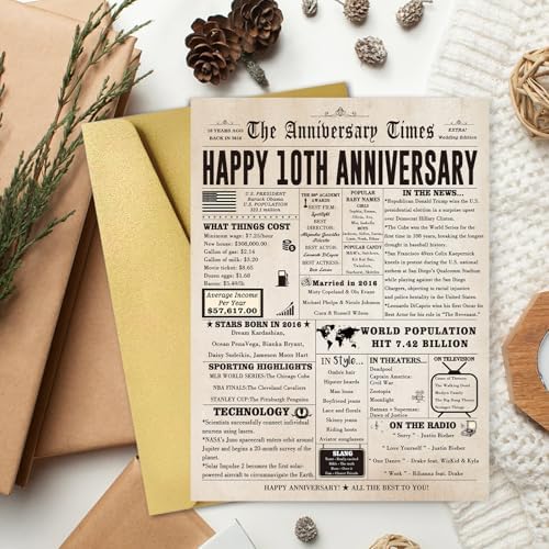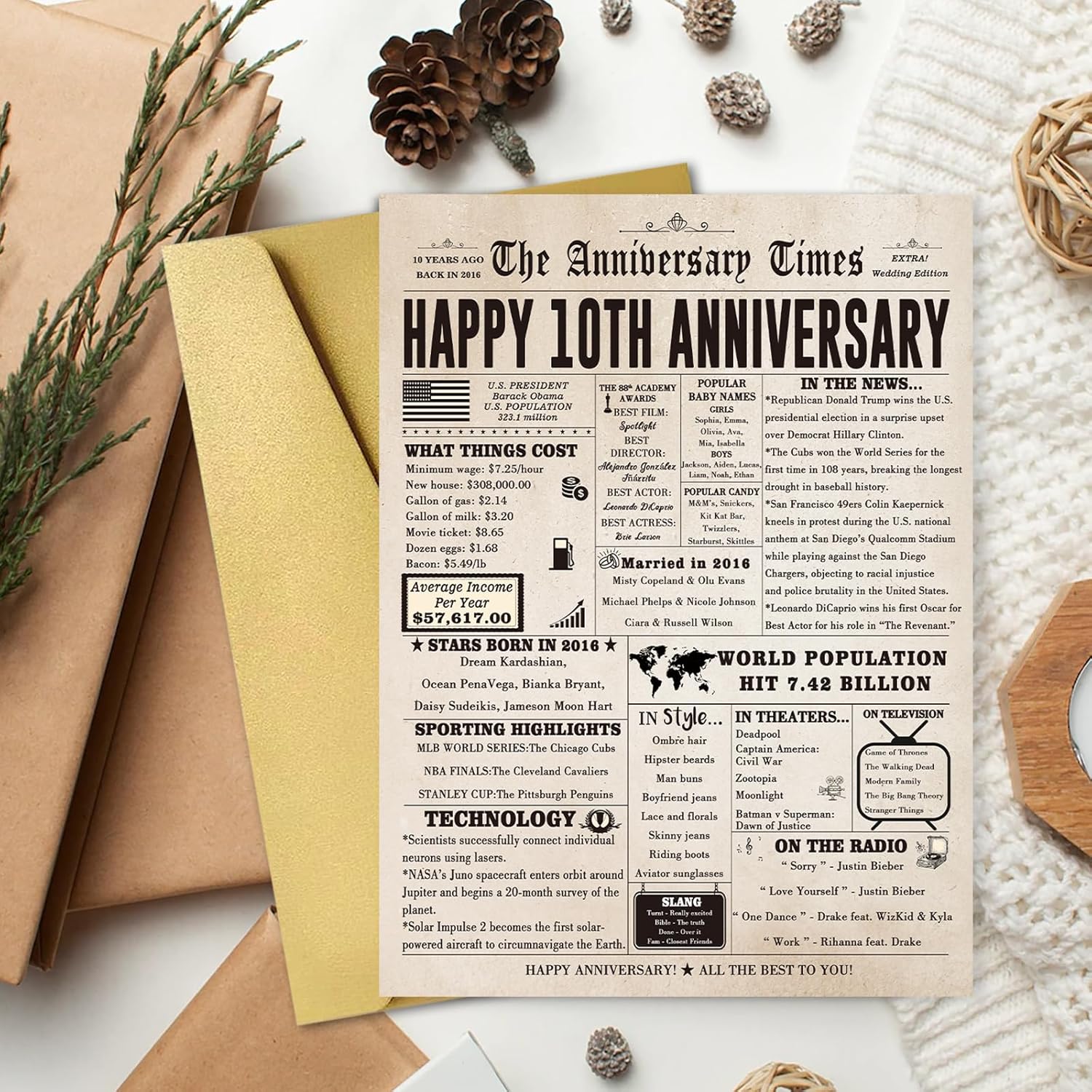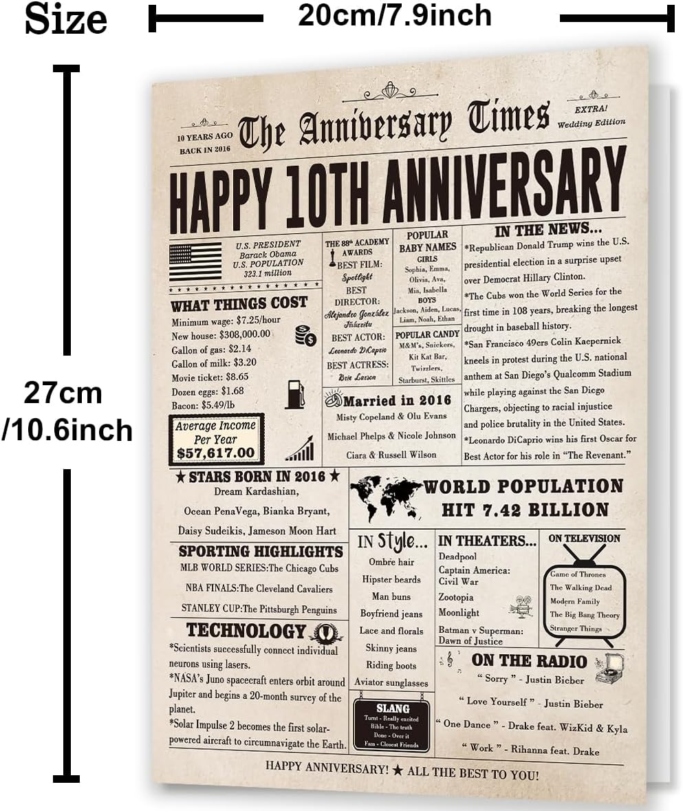 • Product Introduction: This happy 10th anniversary card gifts for husband features a single sided retro card design, rich and colorful content, with many interesting stories about the year of birth.