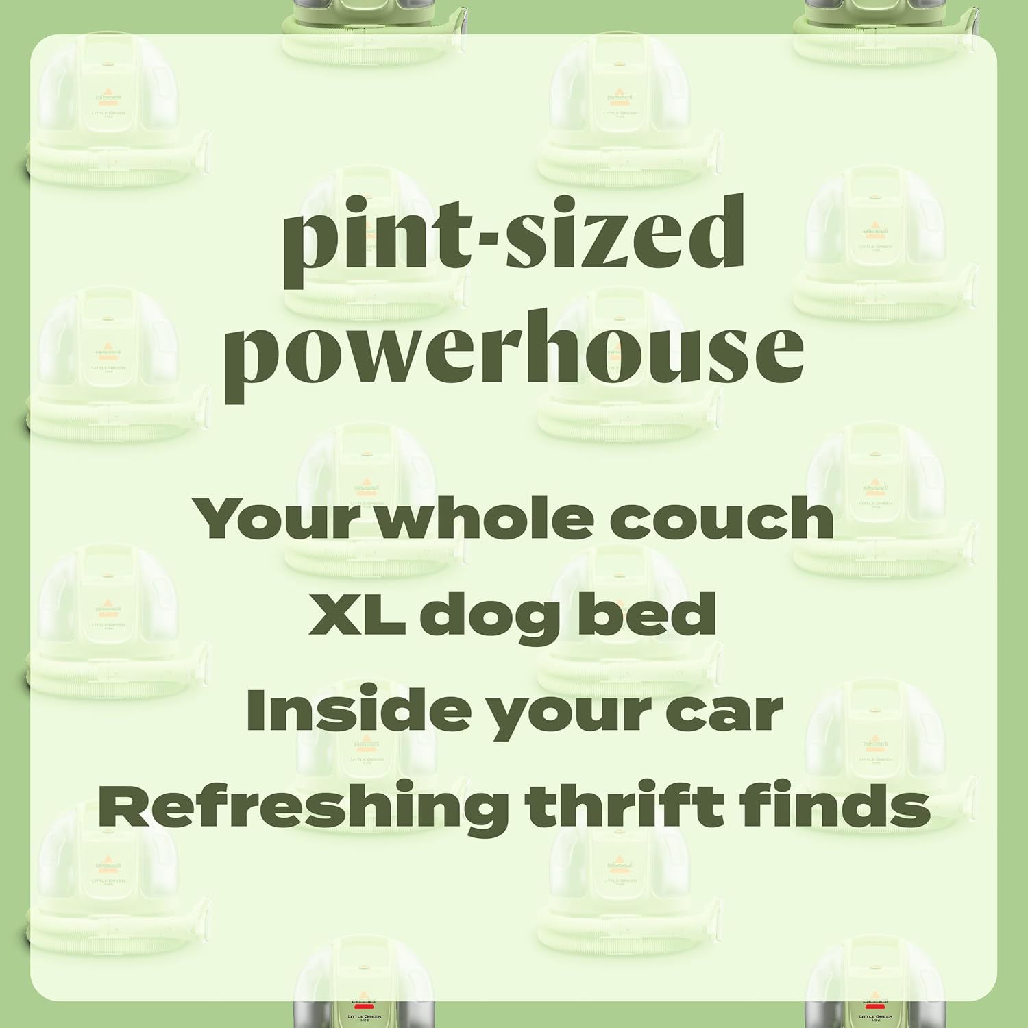 Save on space without sacrificing on cleaning ability. Use BISSELL Little Green Mini portable upholstery and carpet cleaner to spray, scrub and lift away tough messes, like dirt and stains, from all types of surfaces. Easily access hard-to-clean spaces like staircases or car interiors with Little Green Mini portable deep cleaners lightweight and compact design. Every purchase makes it possible for BISSELL to continue our support of BISSELL Pet Foundation and its mission of saving pets in need. Since 2011, BISSELL has donated over $26 million in support of BISSELL Pet Foundation. When you purchase a BISSELL product, you help save pets, too. Our products are engineered to clean even the toughest messes so pets can stay at home and out of shelters.