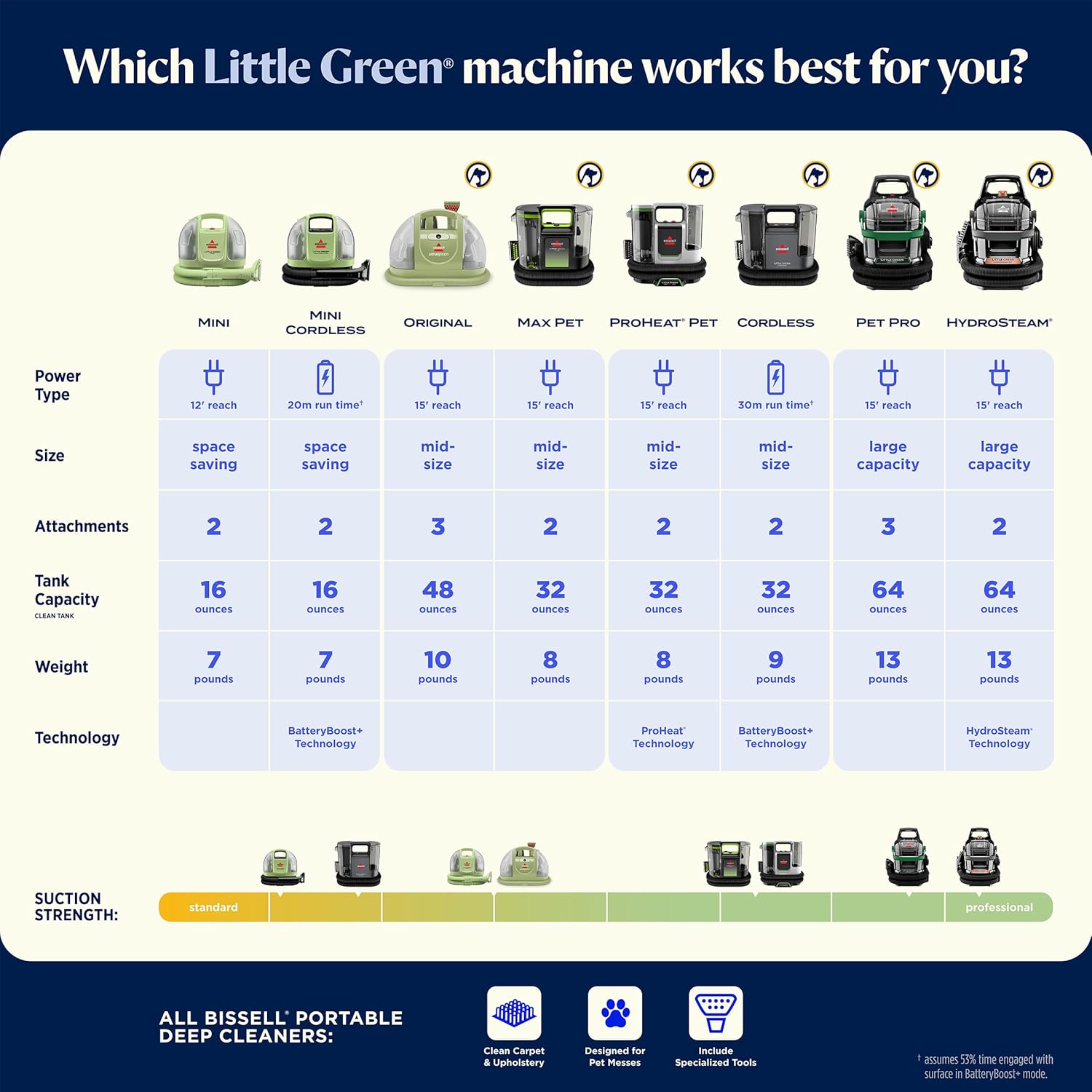 - INCLUDES: 4” Tough Stain Tool with removeable lens, HydroRinse self-cleaning hose tool, and 8oz. BISSELL Little Green Formula.