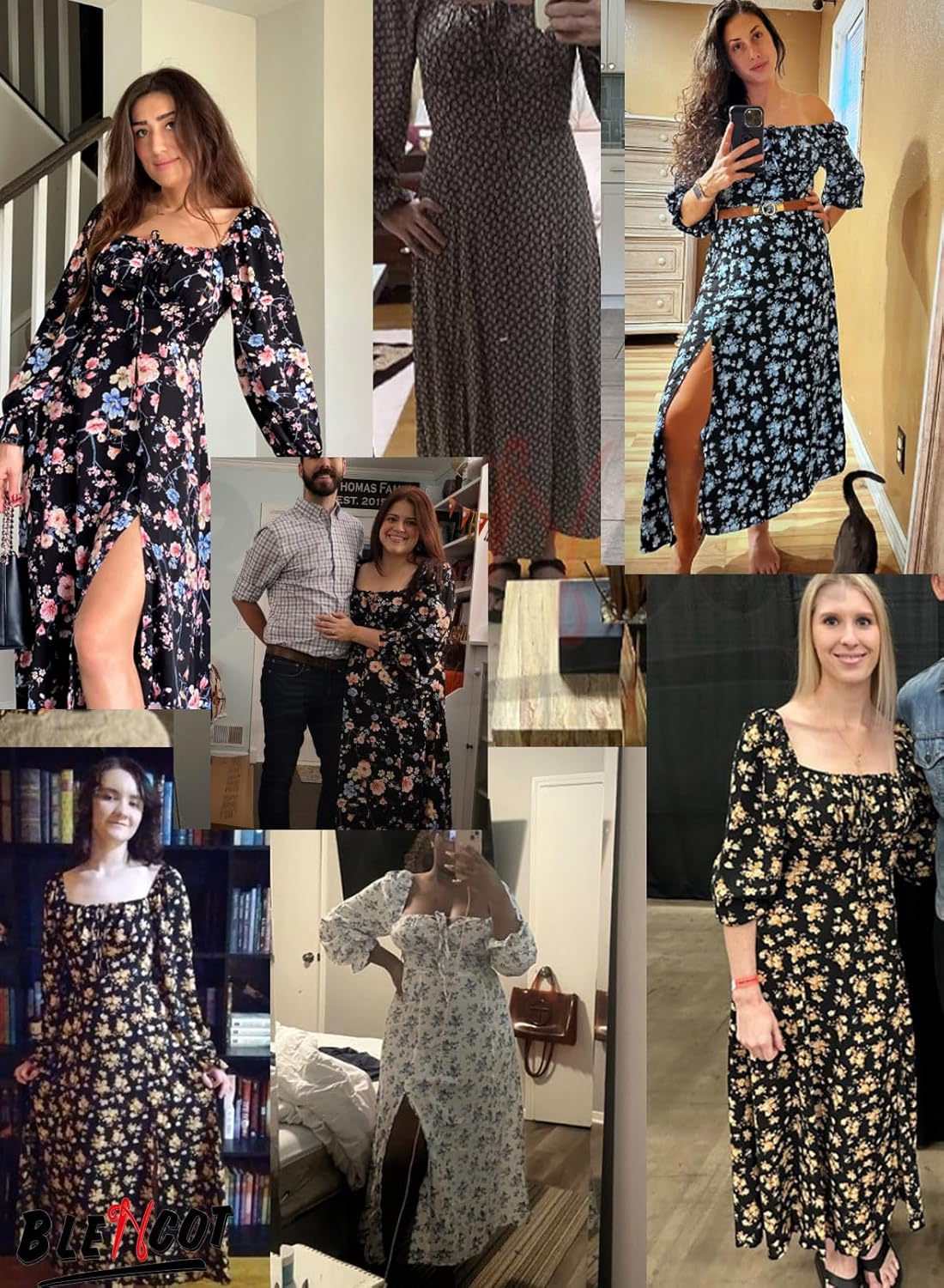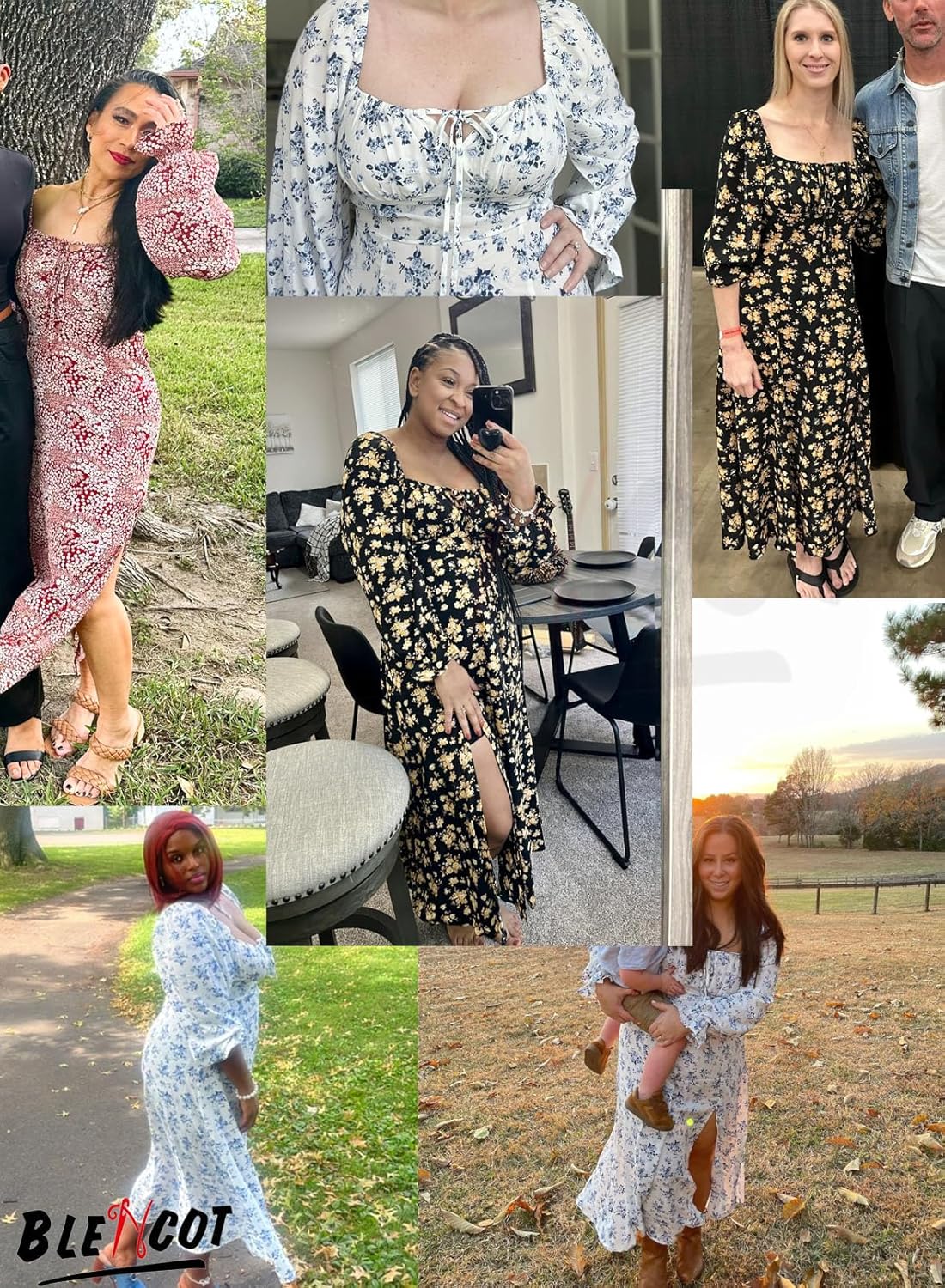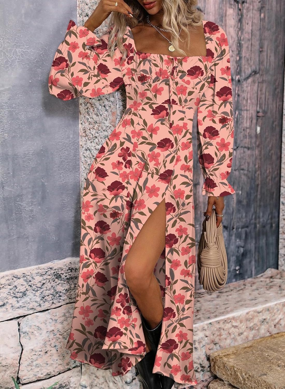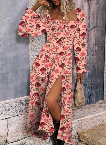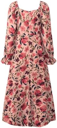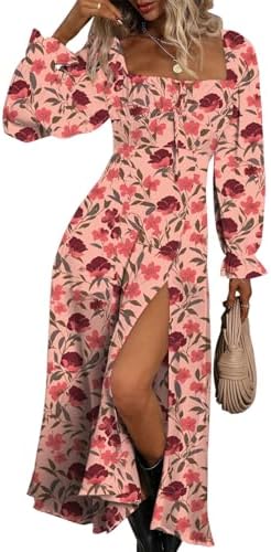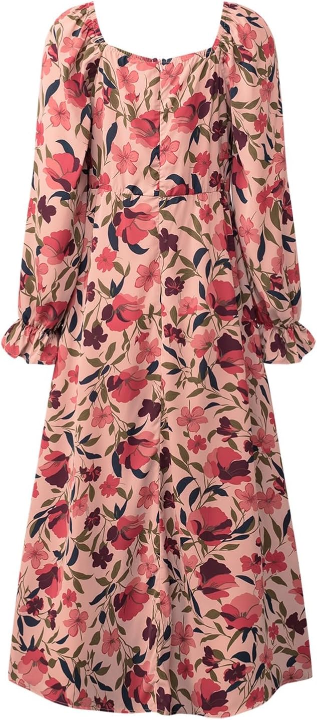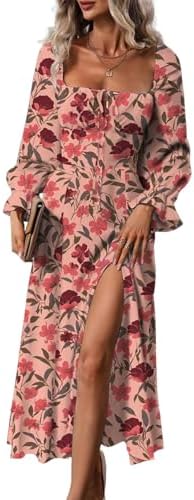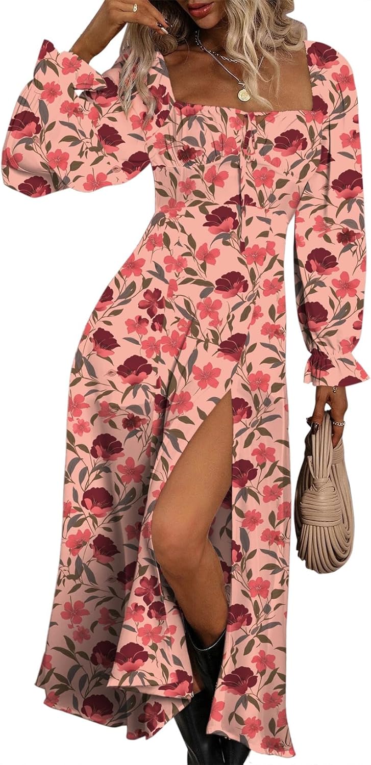 - Design: All over print, floral pattern, square neck, puff Long sleeve, tie front, high waist, side split thigh, midi length, a line dress