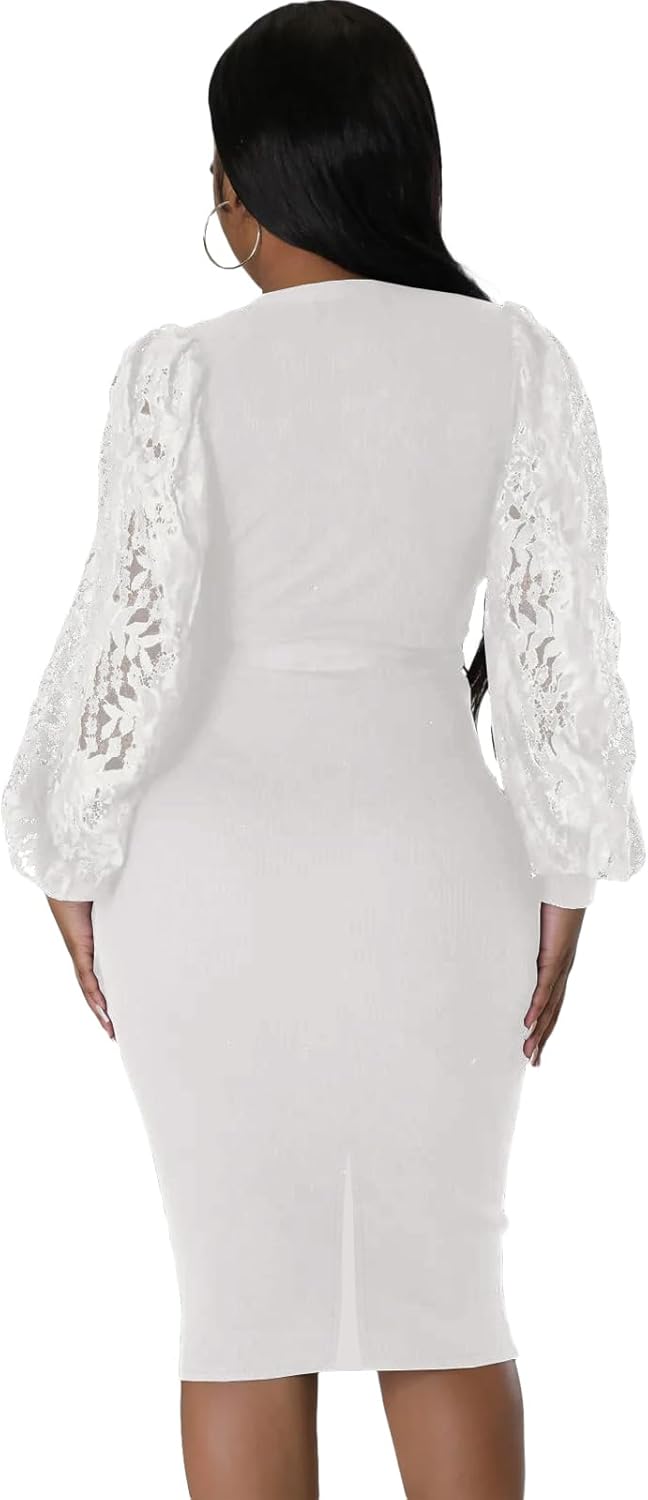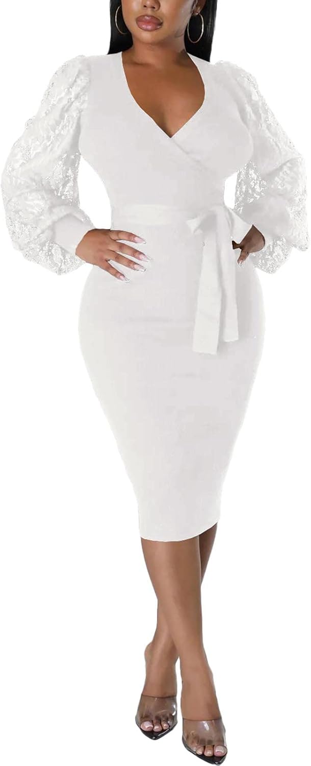 BOGURST Semi Formal Church Dresses for Women Bishop Sleeve Sexy V Neck Bodycon Midi Dresses