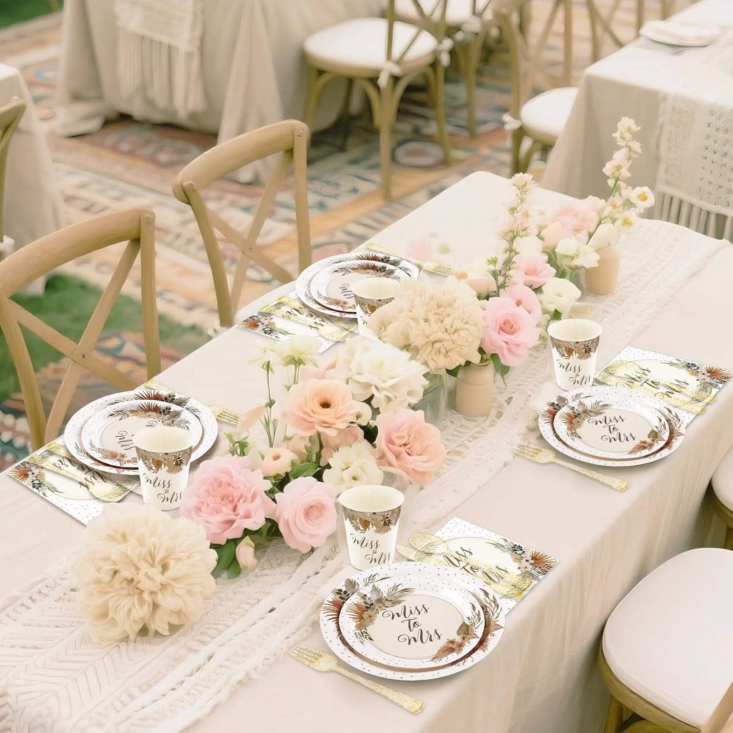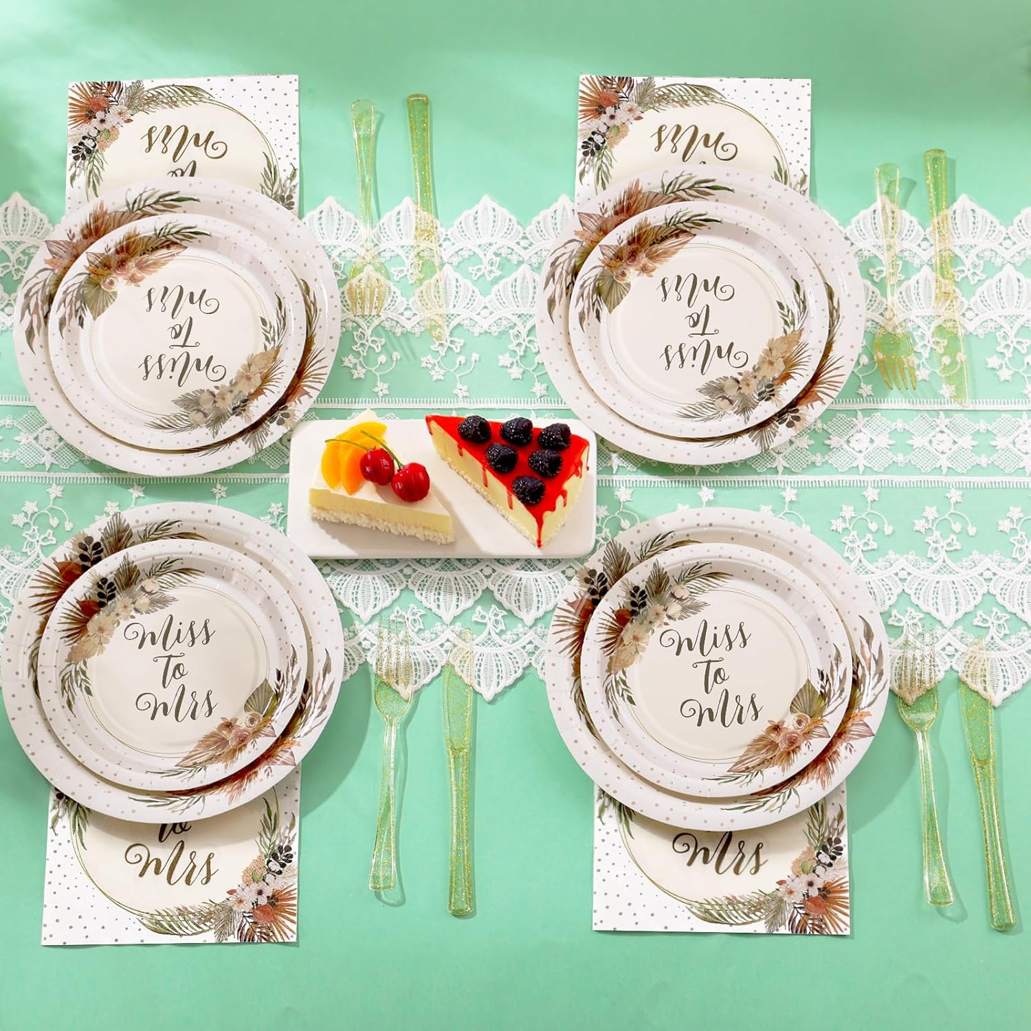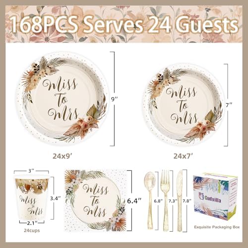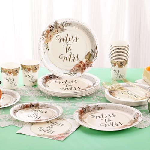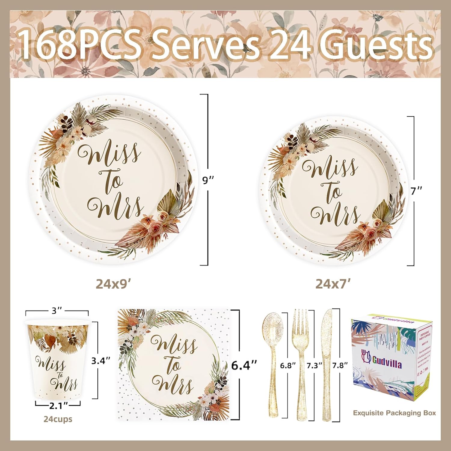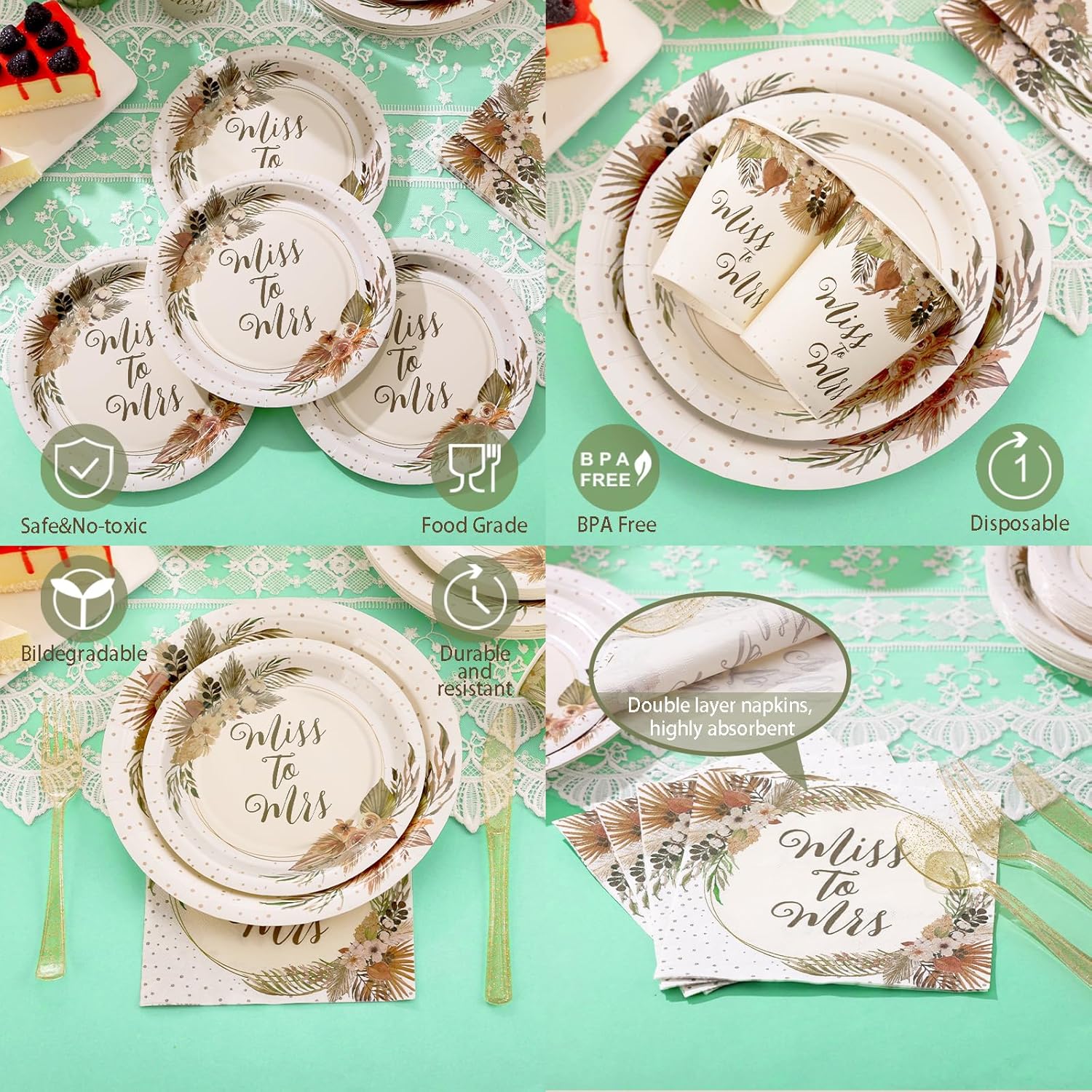 168Pcs bridal shower plates and napkins party supplies24 boho party plates 9 inch24 bridal shower dessert plates 7 inch 24 bridal party cups 24 2-ply bridal napkins 24 sets of cultery (Forks, Knives, Spoons)WARNING: Those miss to mrs plates cannot be microwaved. WARNING: bridal shower party cups are for cold drinks only.