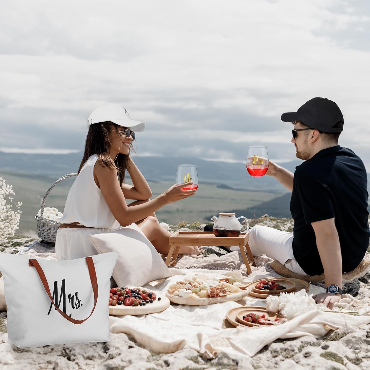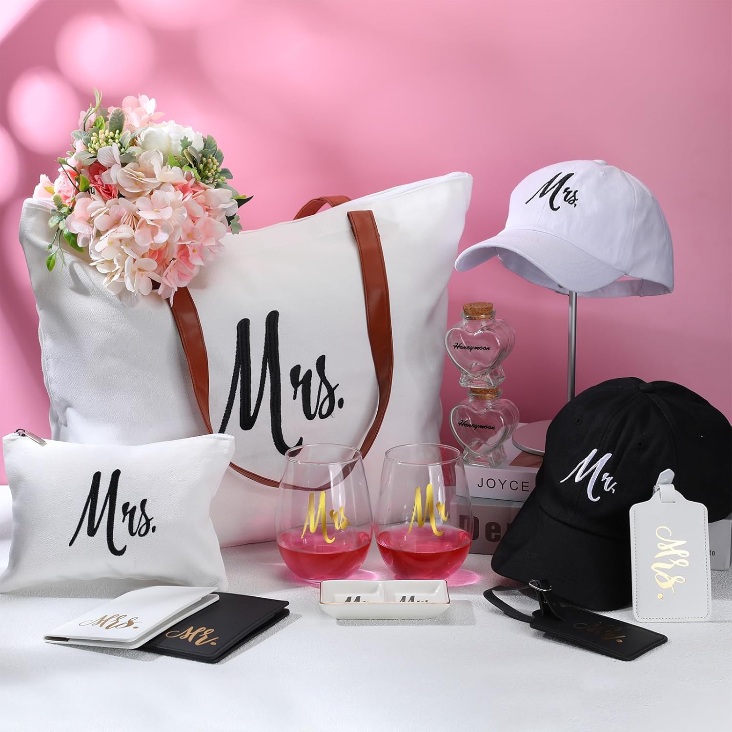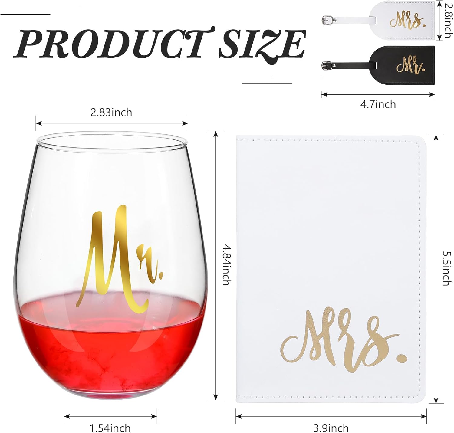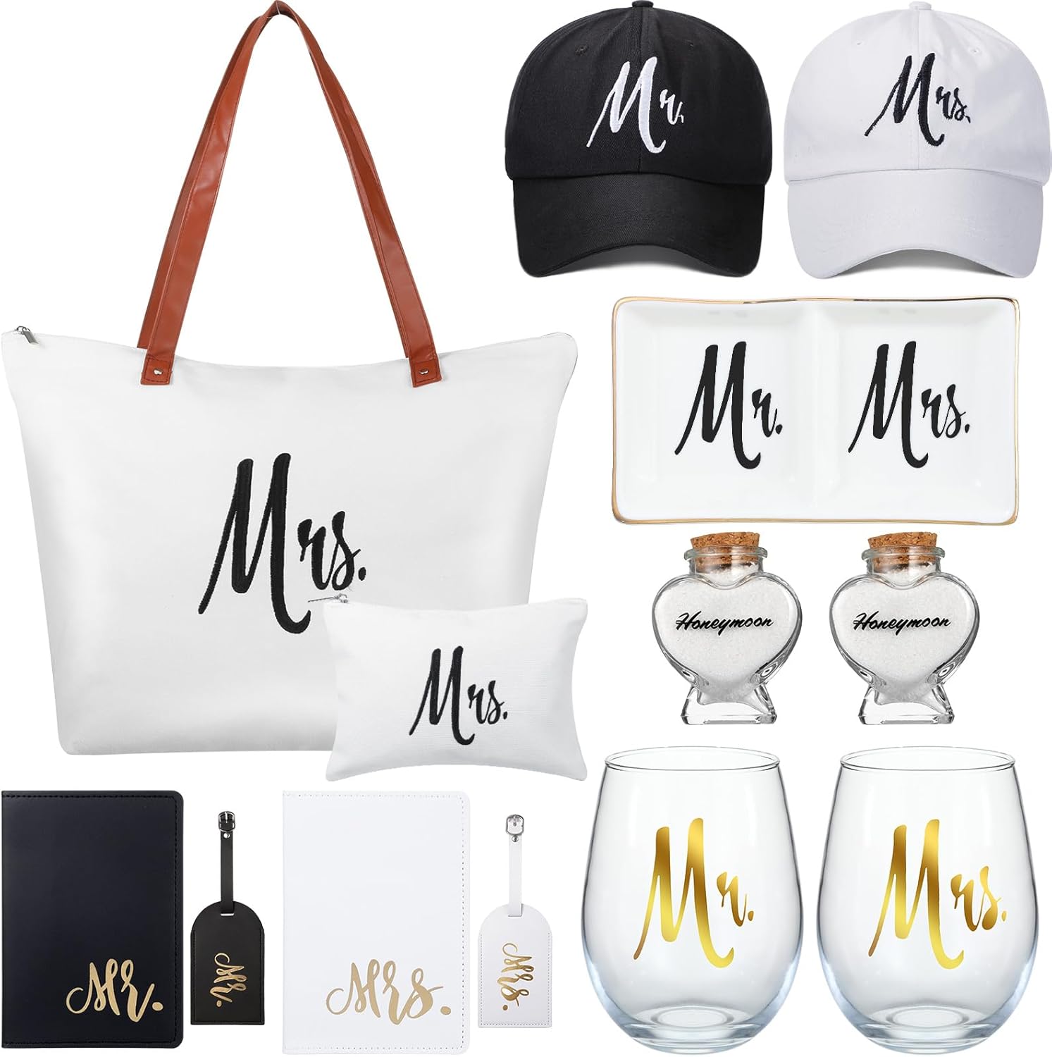 - Practical Combination: the wedding gifts for bride and groom include 2 Mr and Mrs baseball hats, 2 Mr and Mrs stemless wine glasses, 2 Mr and Mrs luggage tags, 2 Mr and Mrs passport holders, 1 tote bag, 1 cosmetic bag, 1 jewelry dish and 2 heart shaped glass jars, a total of 13 pieces, a practical combination to provide you with convenience in your life