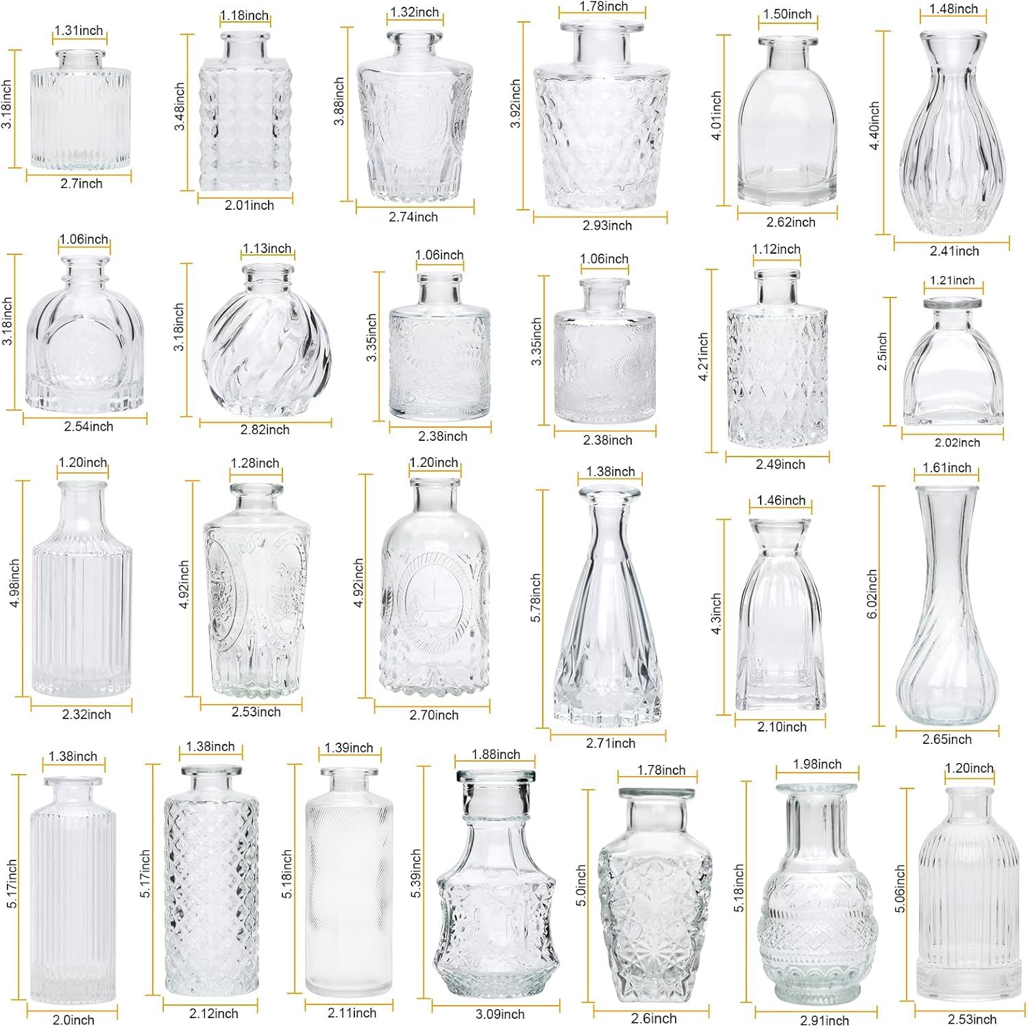 • FUNCTIONAL USES:These clear glass vases can be used for fresh flowers, silk flowers, dried flowers, greenery, branches, feathers, or other decorations. Fill these vintage glasses with essential oils to enjoy your favorite fragrance.