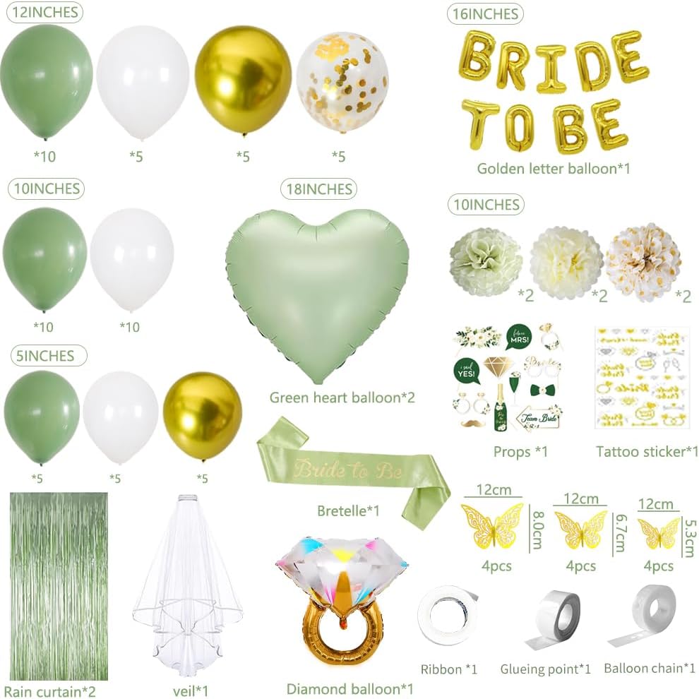 • Bachelorette Party Decorations Set : Bridal shower decorations, including 2*fringe curtains, 60*latex balloons, 3*foil balloons, 1*tattoo,6* 10in paper pom poms,12*photo pooth props,1*sash,1*BRIDE TO BE balloon,12 x 3D butterflies.