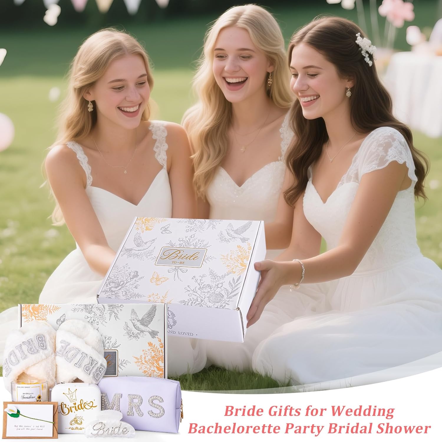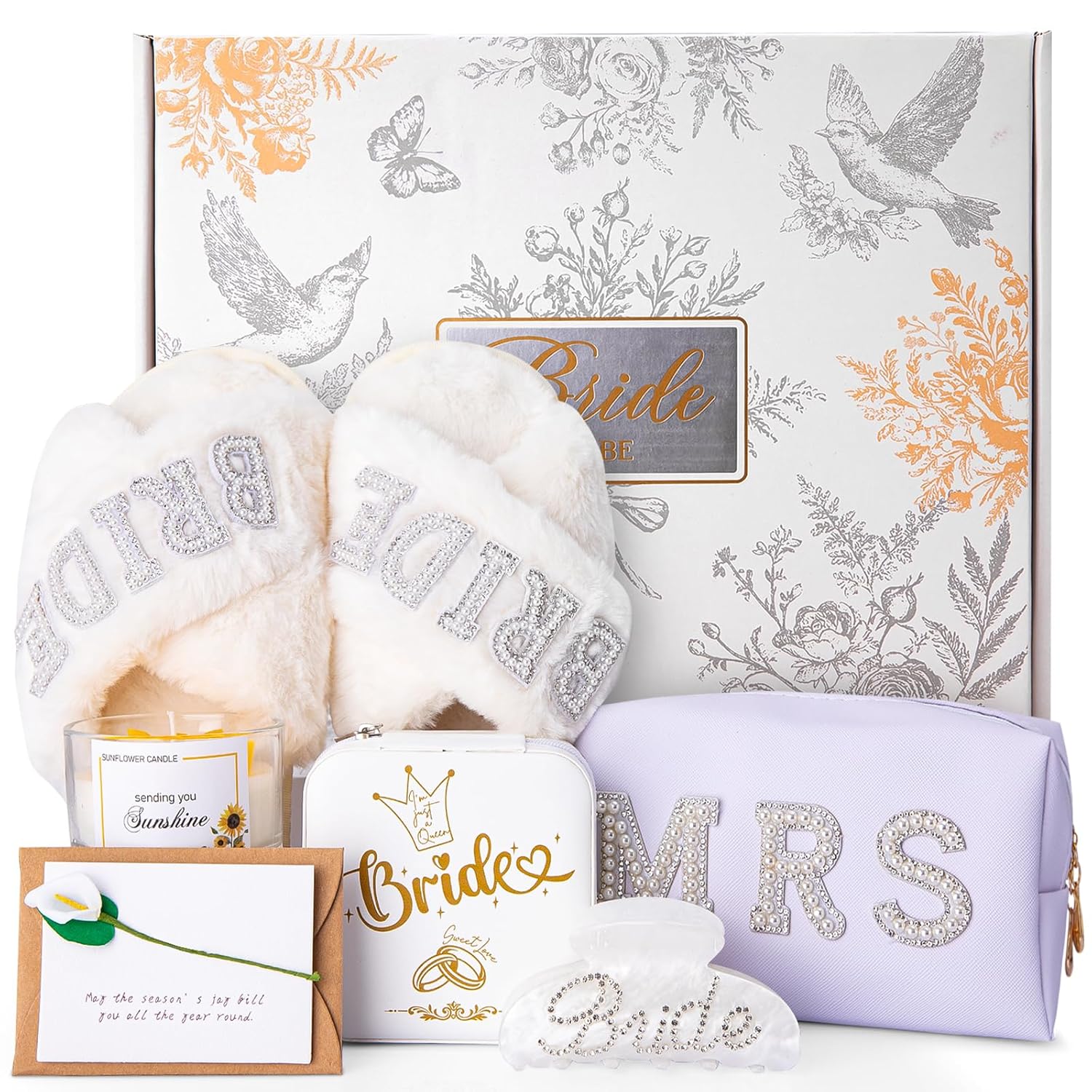 - 【Bride to be Gifts】This bride gift set includes bride soft slippers, Mrs cosmestic toiletry bag, bride jewelry box, bride hair clip, sunslower scented candle and greeting card with a gorgeous gift box, an elegant, thoughtful and pratical gift for bridal shower, bride, bride-to-be, mrs, fiance, wifey, wife for wedding day, wedding reception party, engagement, bachelorette party, wedding anniversary, honeymoon and more to celebrate her to be a bride.