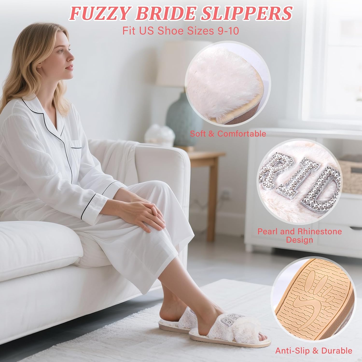 - 【Soft and Comfortable Bride Slippers】 These bridal slippers feature a plush faux fur lining and a soft, anti-slip rubber sole. They offer a gentle, cloud-like comfort with every step, perfect for a light and elegant feel during morning photoshoots and walking through the wedding room. Adorned with shimmering pearls and rhinestones, the slippers are beautifully embellished with the word “BRIDE”, harmonizing perfectly with the overall wedding theme and ensuring the bride’s feet are pampered through every joyful moment.