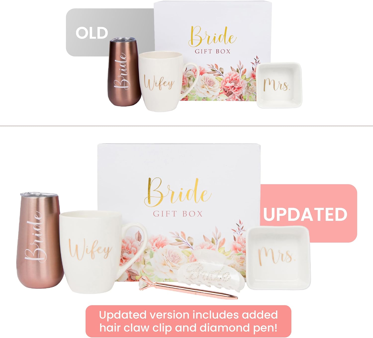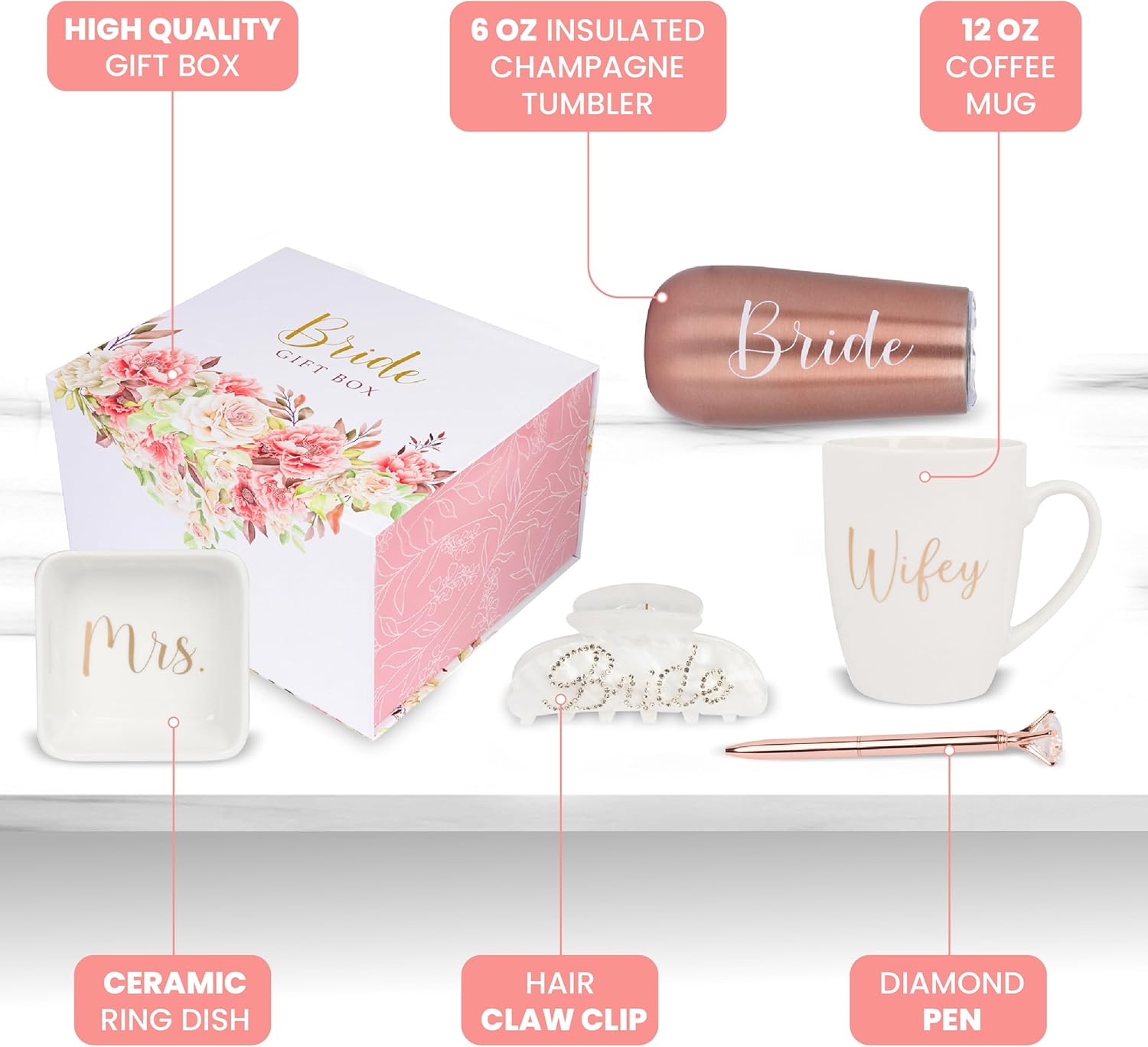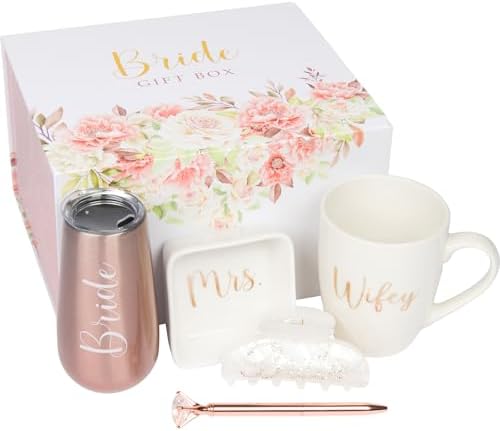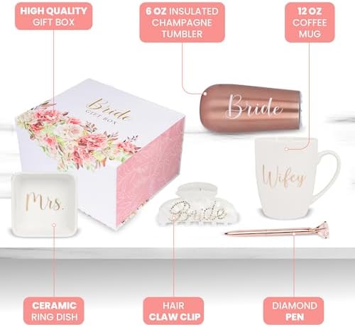 - 🥂 INCLUDES – Comes with a 6 oz insulated champagne tumbler (labeled “Bride”), a 12 oz coffee mug (labeled “Wifey”), a ceramic ring dish (labeled “Mrs.”), a hair claw clip (labeled “Bride”), and a diamond pen
