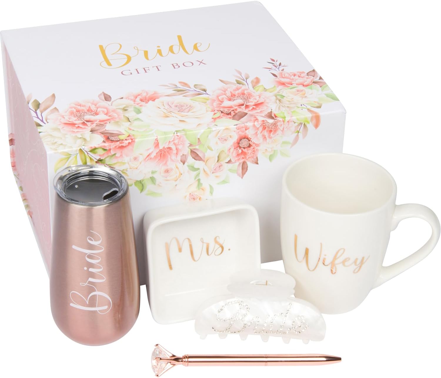 - 🎁 BRIDE GIFT BOX – Beautiful bride gift box complete with a rose gold champagne tumbler, large coffee mug, hair claw clip with rhinestone design, ceramic ring dish, and diamond pen