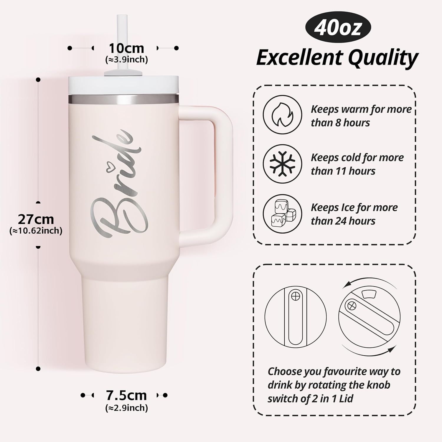 - Beautiful Exterior Color: Bride 40 oz tumbler with handle and lid and straw, The color is a pale pink that every women will love! Travelling with this high-capacity insulated mug will definitely make you the center of attention!