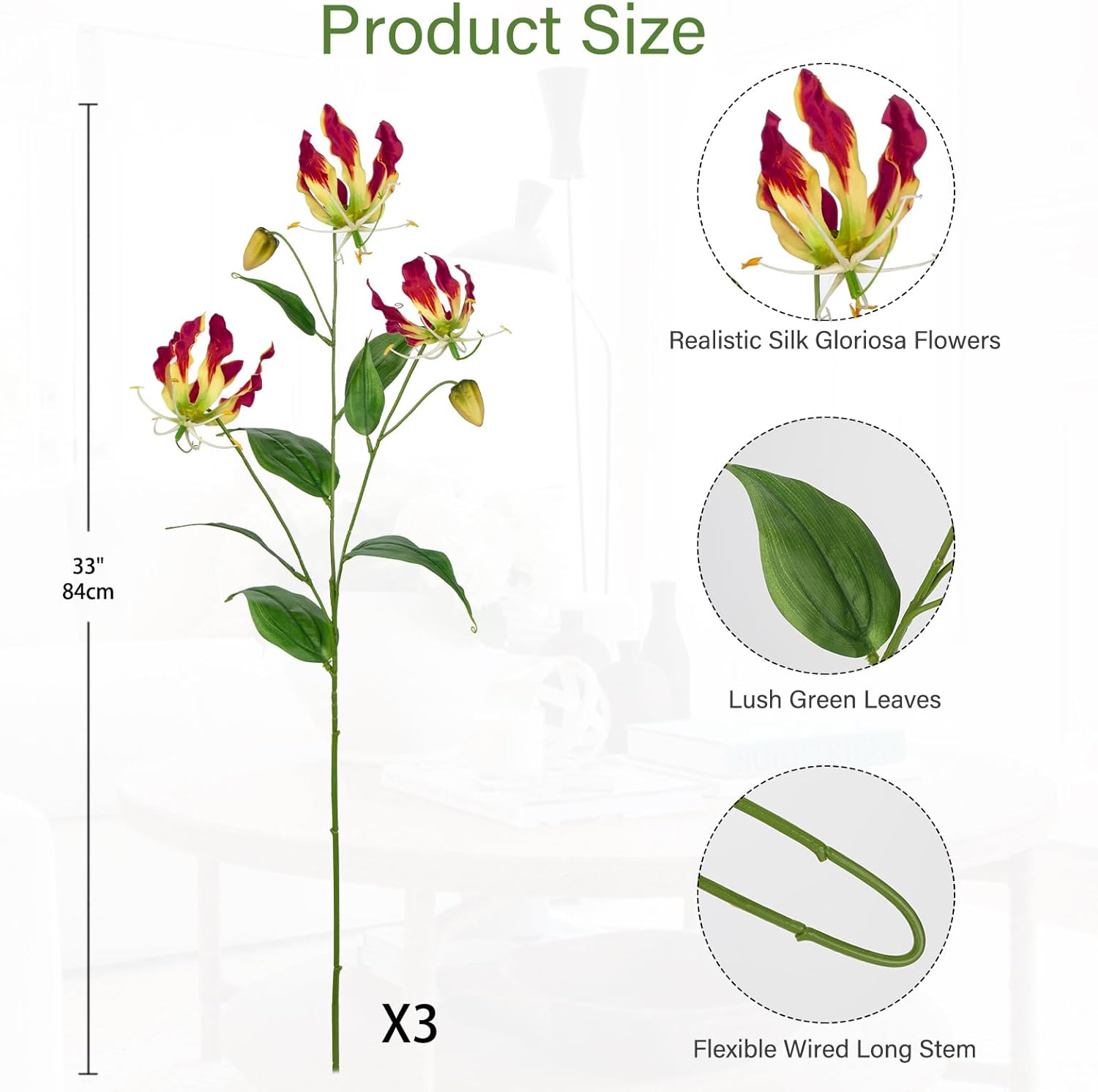 • REALISTIC GLORIOSA LILY SPRAY: Gloriosa superba artificial flower sprays are meticulously crafted to mimic the intricate details and vibrant colors of real Gloriosa flowers. The petals, buds, stamen, leaves and overall shape closely resemble the beauty of these exotic blooms, creating a stunning decorative piece. Each artificial bouquet has 3 gloriosa flower blooms, 2 buds and 7 leaves and its size approx is 33″ Tall.